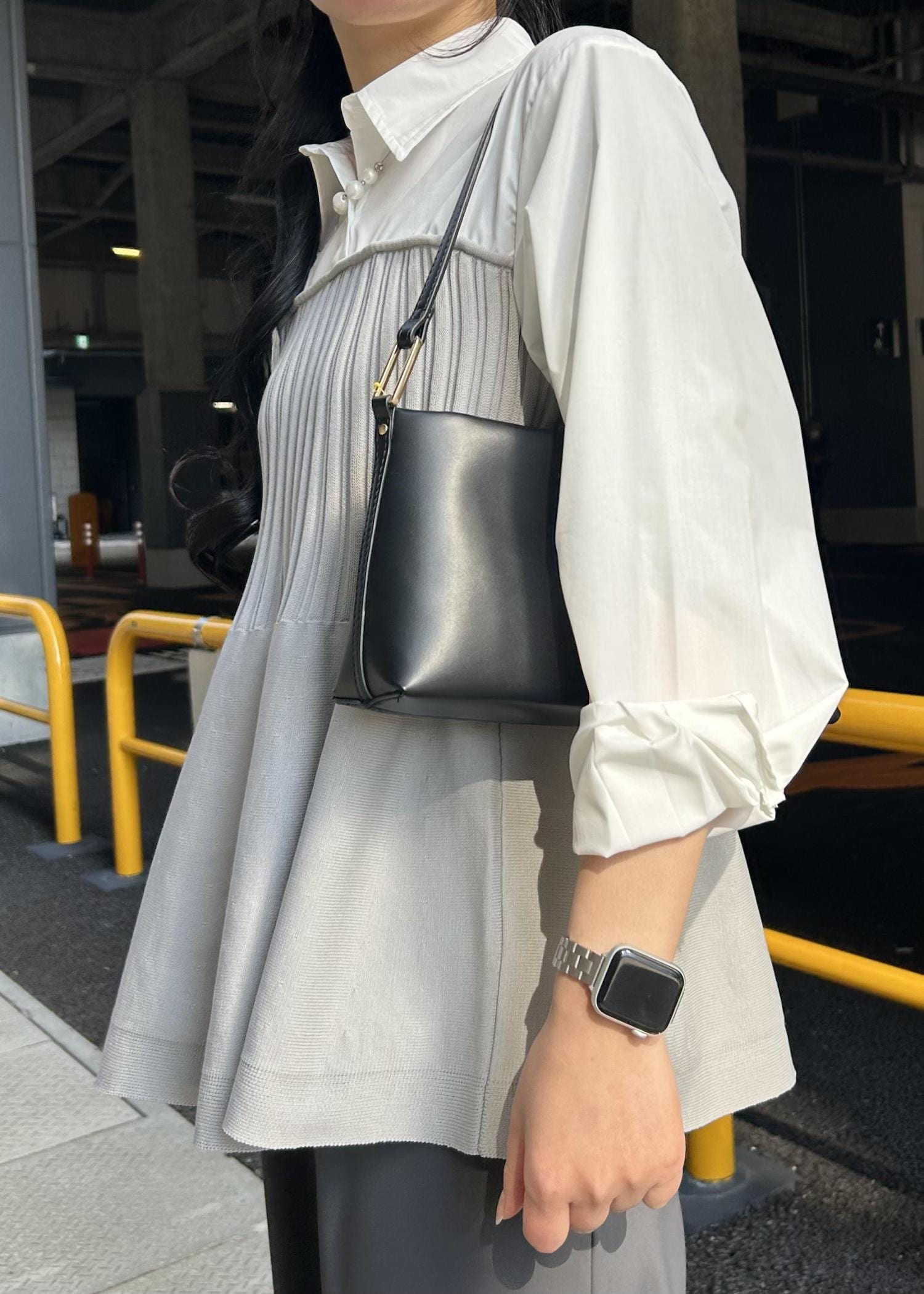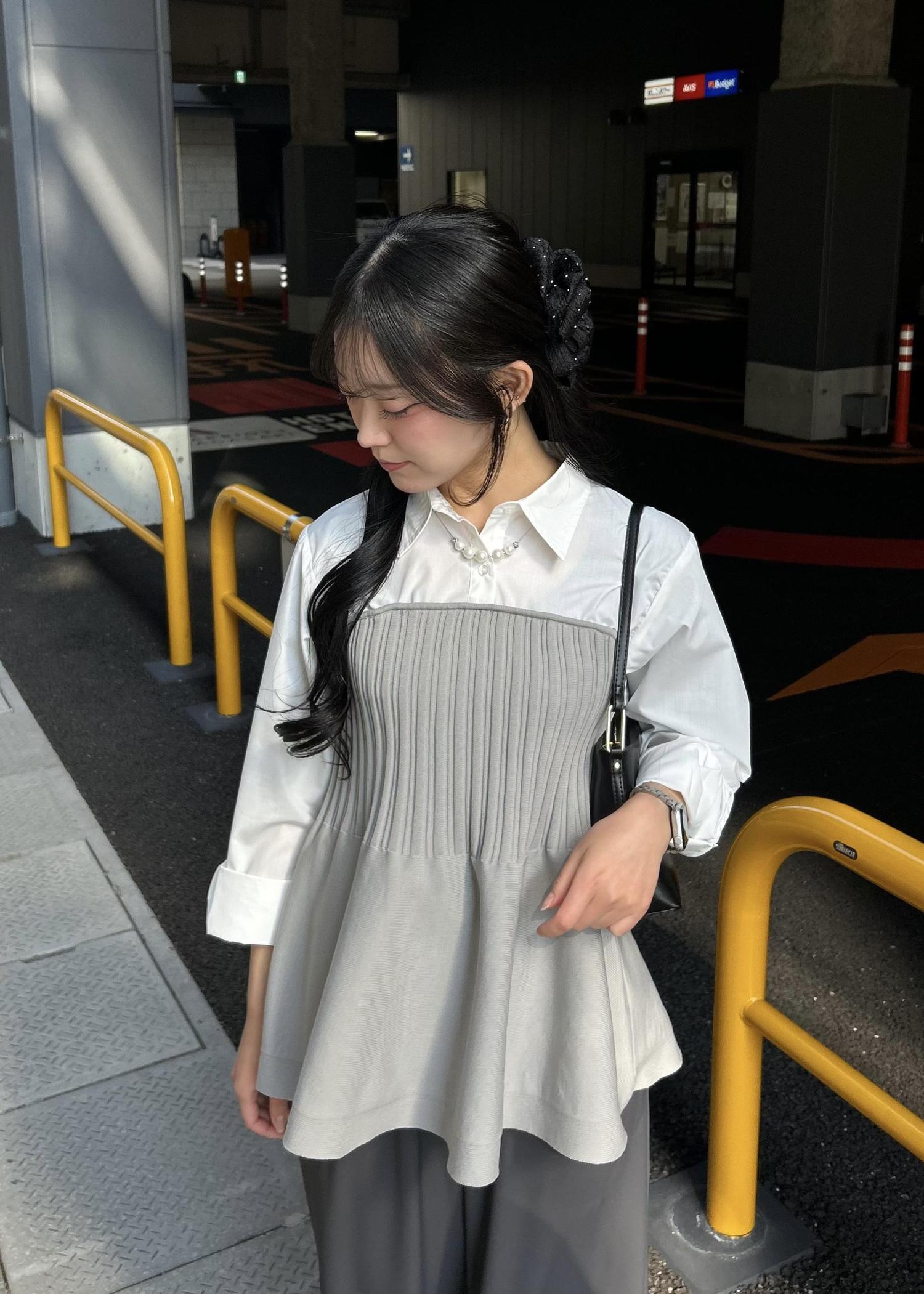シャツとプリーツ切り替えがドッキングされたトップスを主役にしたコーデです。