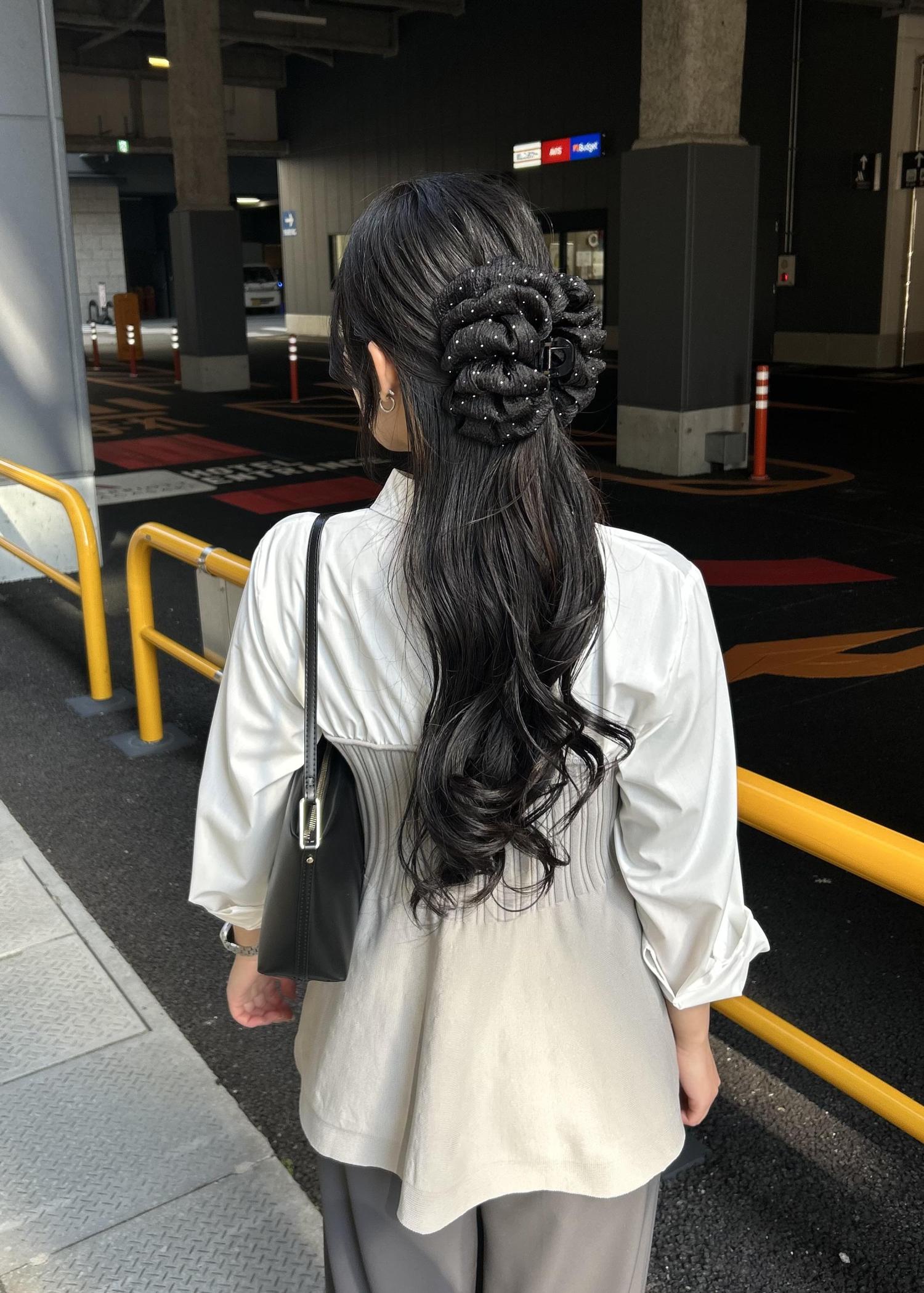 胸下から広がるシルエットが自然にメリハリをつくってくれるので、体のラインを拾いすぎず、きちんと感も保てます。