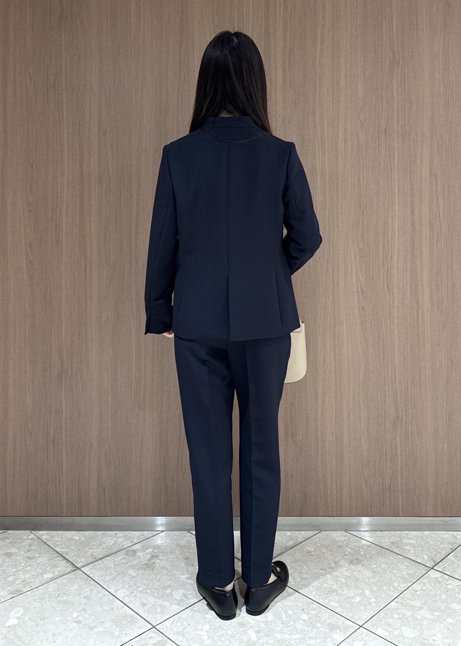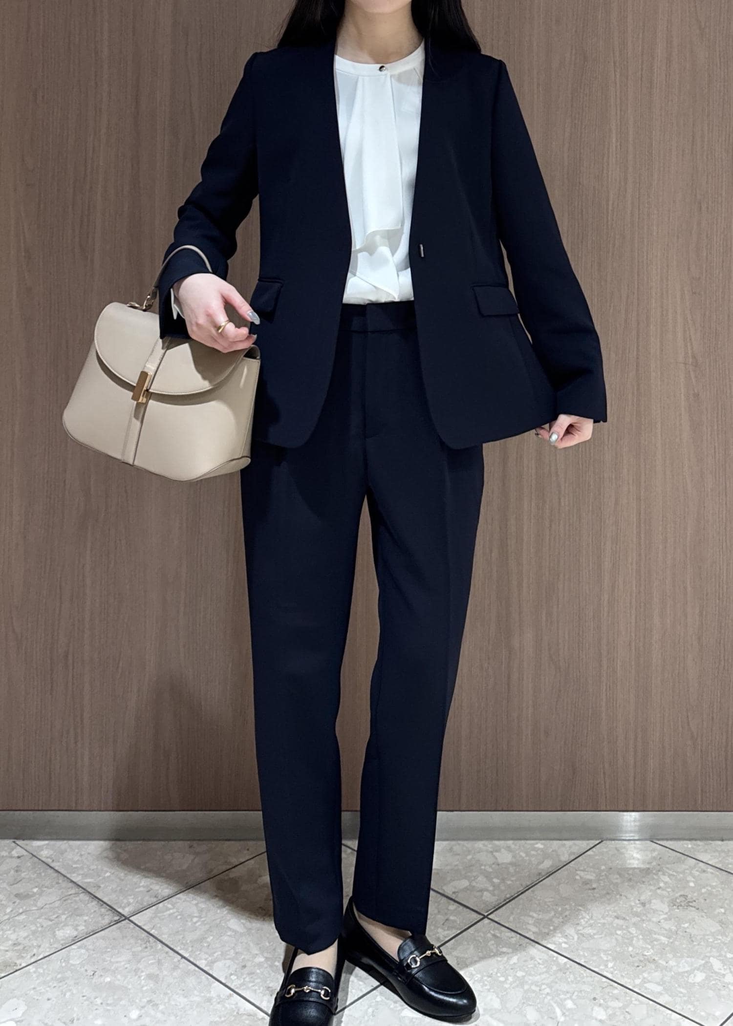 ネイビーのノーカラージャケットとテーパードパンツで、きちんと見えお仕事向けコーデを組んでみました。