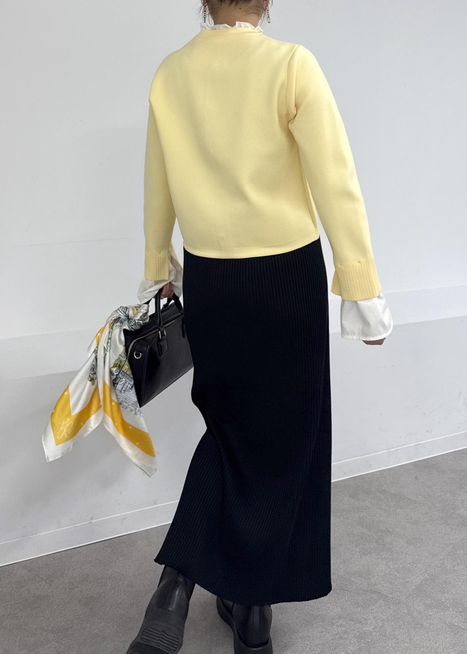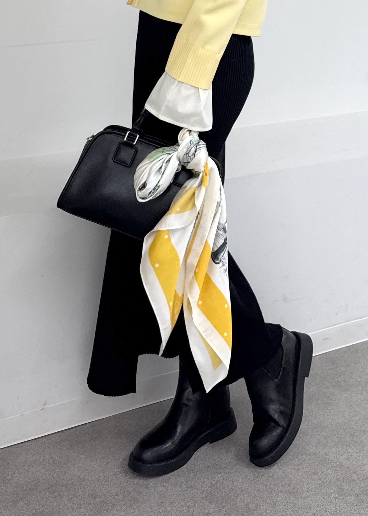 スカーフをバッグに結べば、さりげないアクセントに。