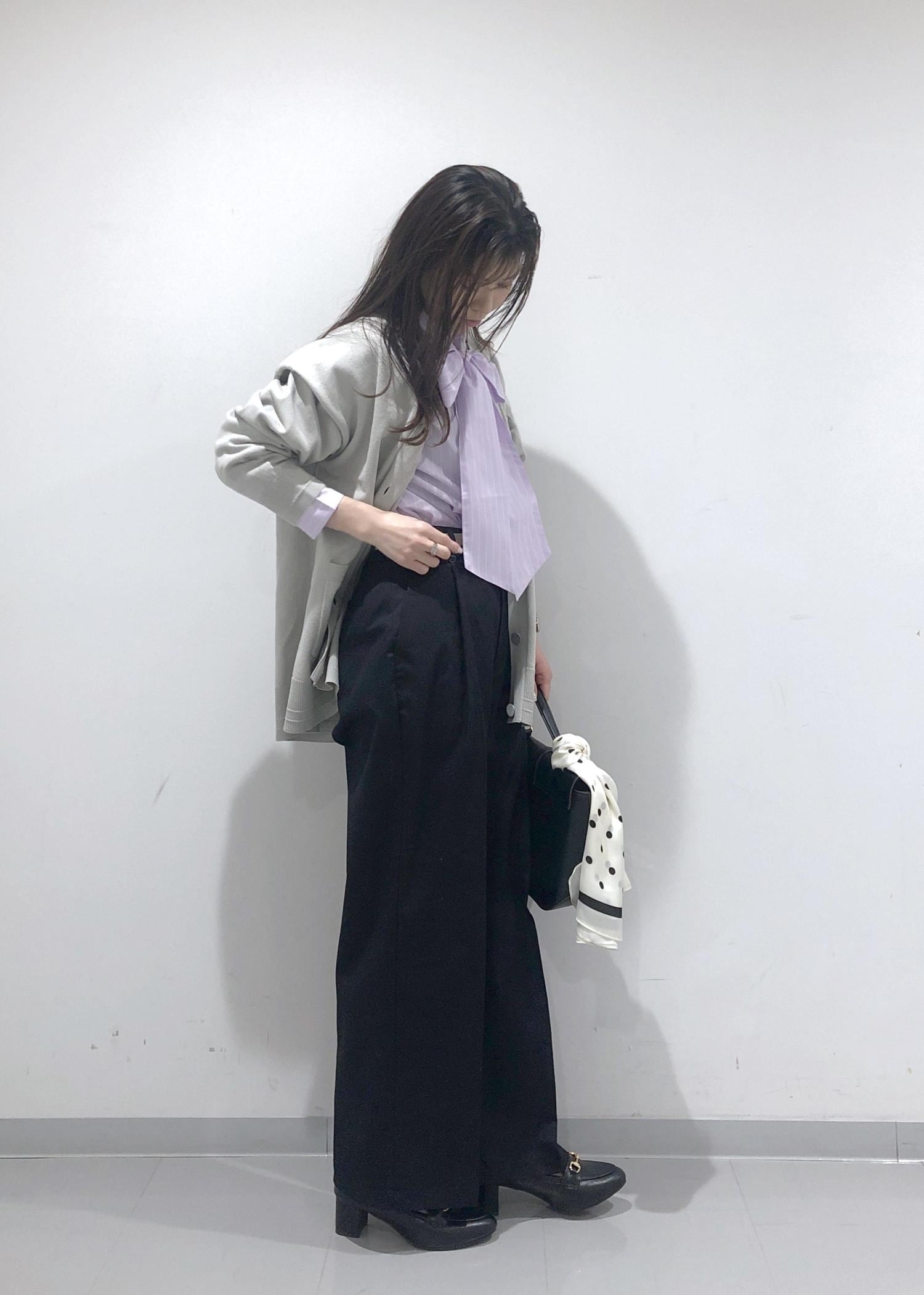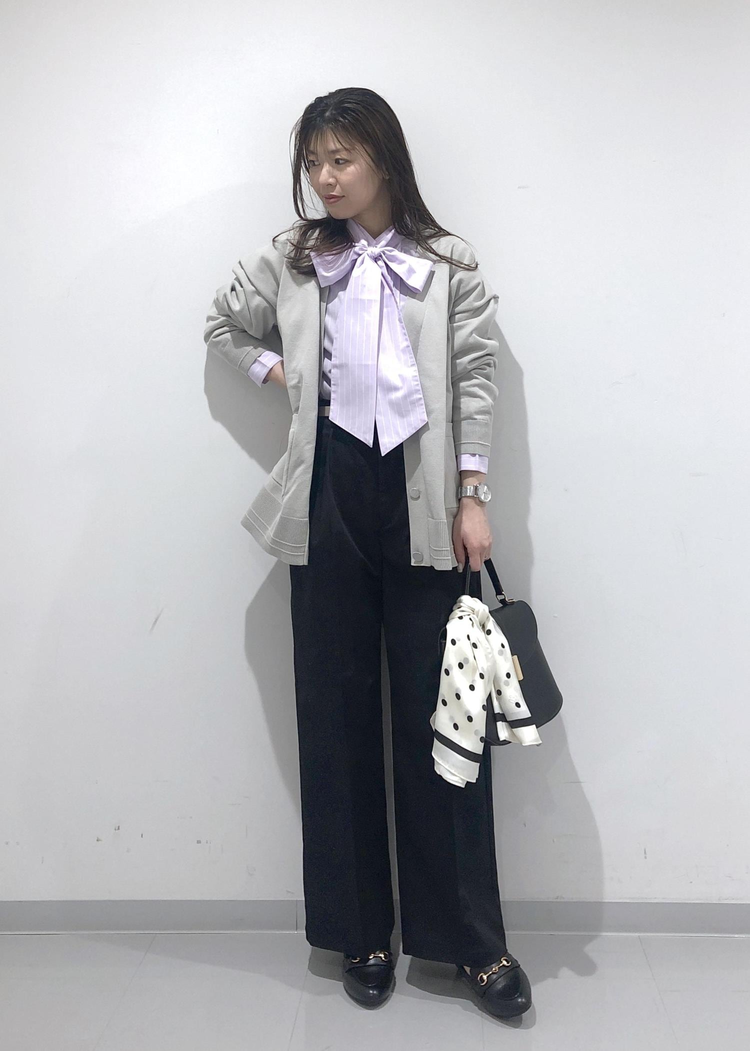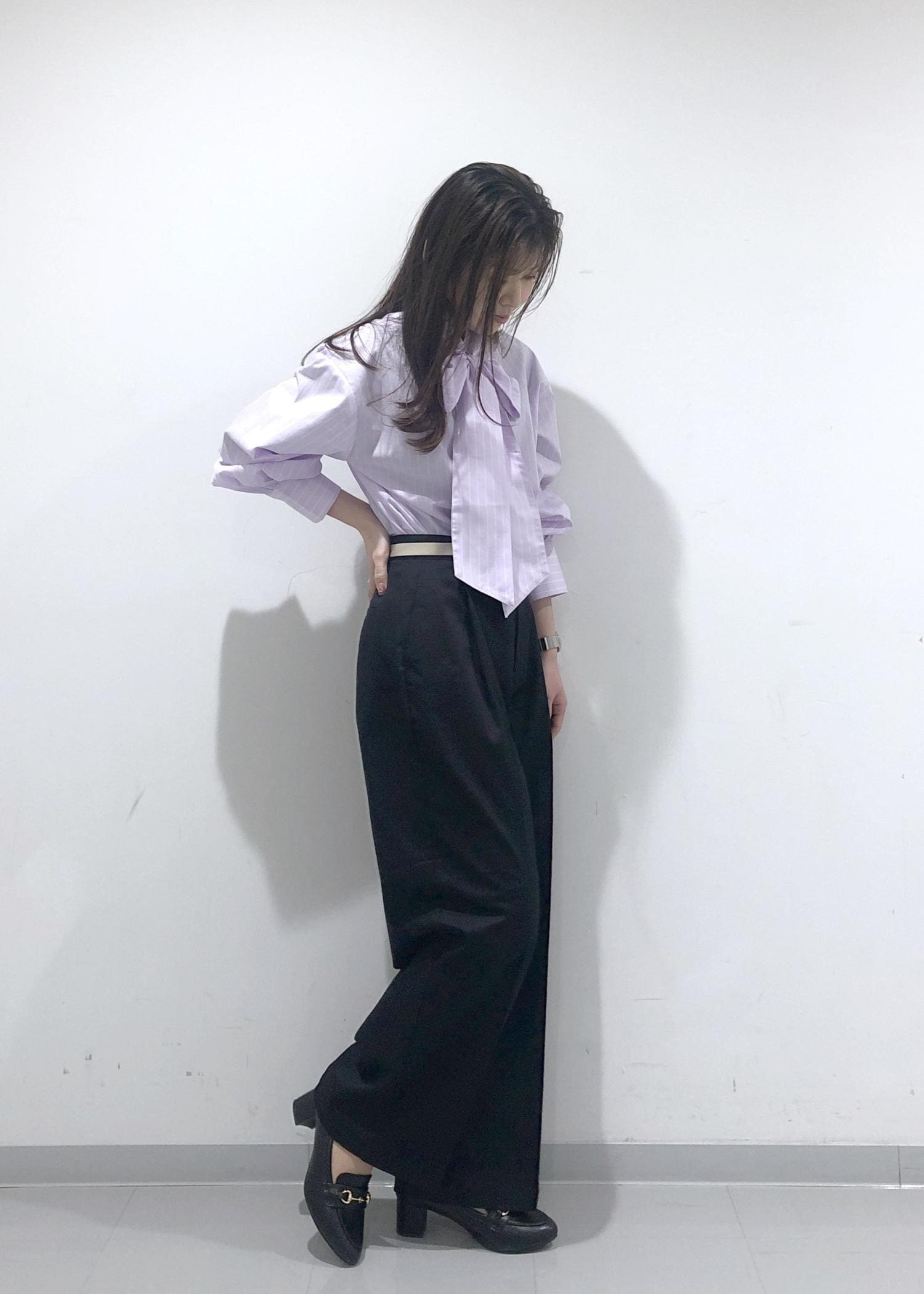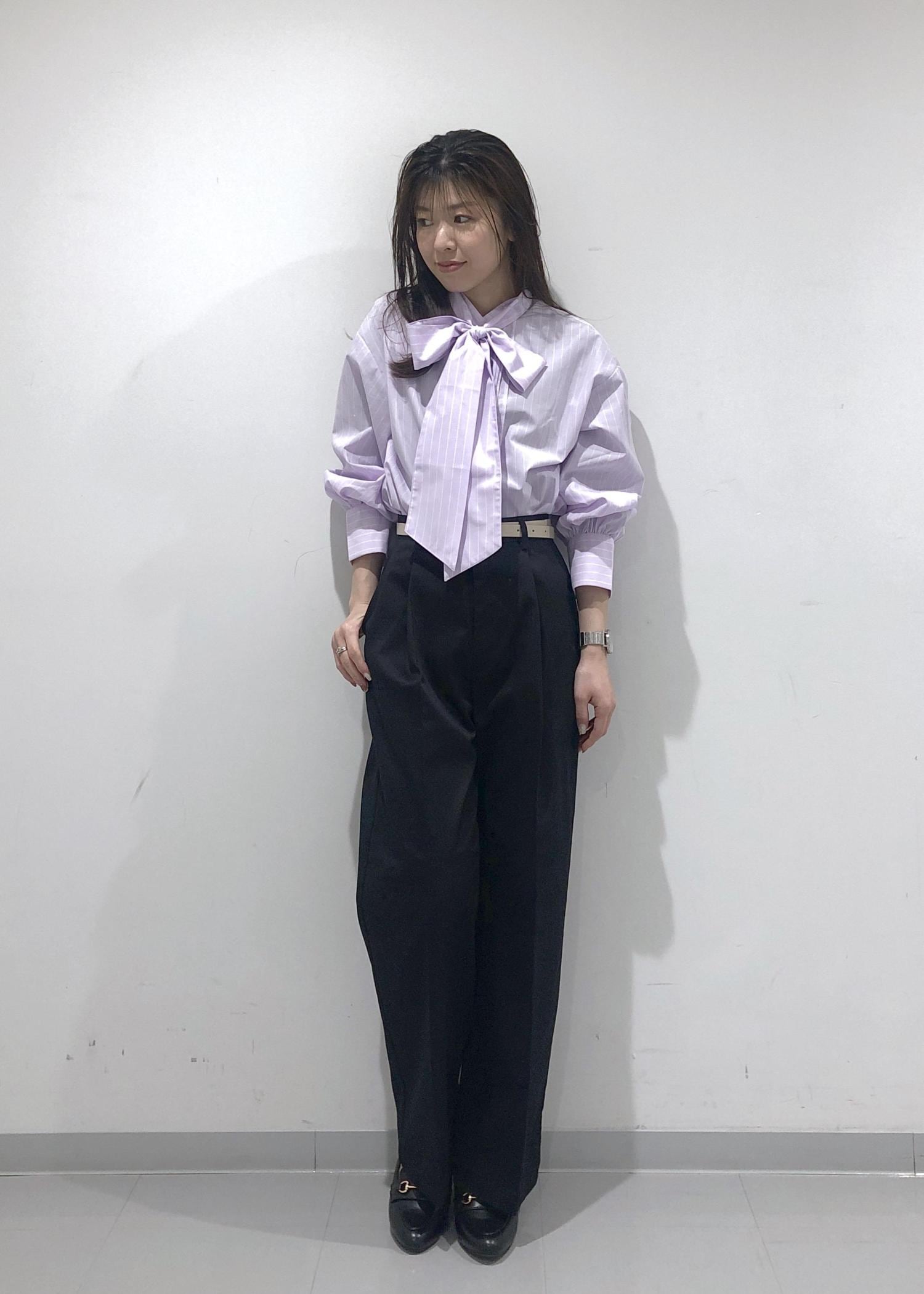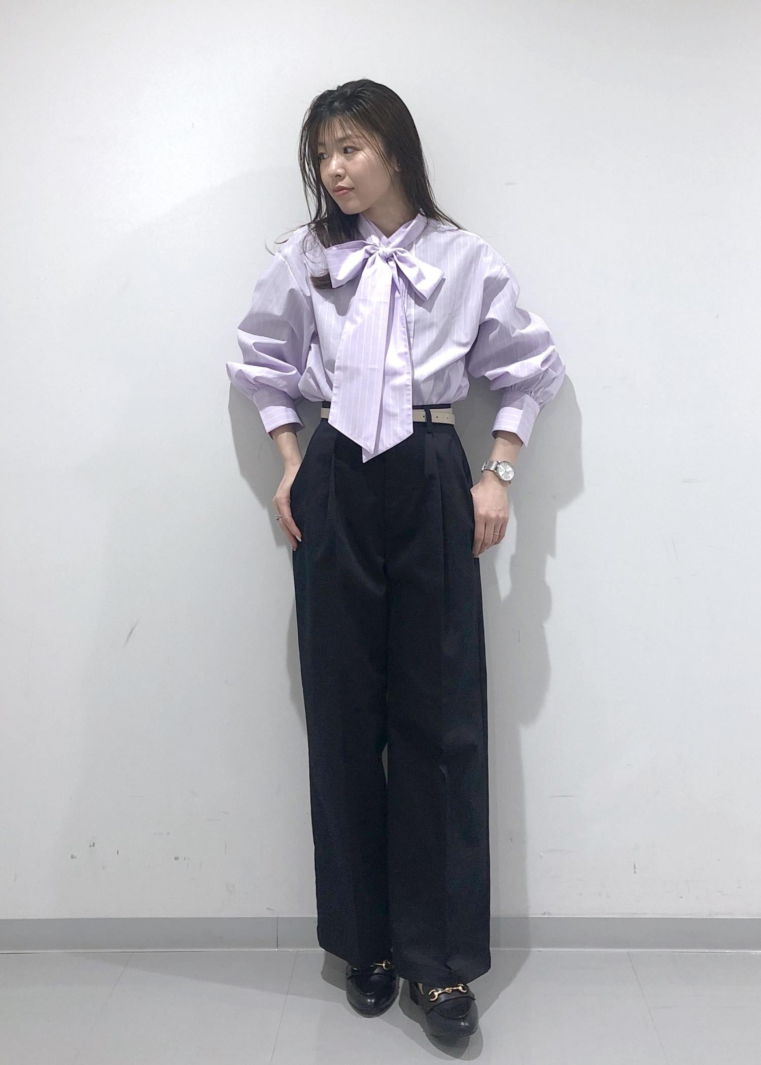 シャツのボウタイをリボン結びした、華やかで春らしいピンクコーデ!