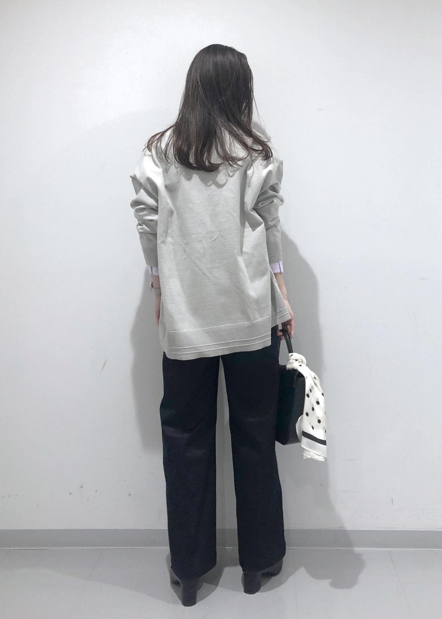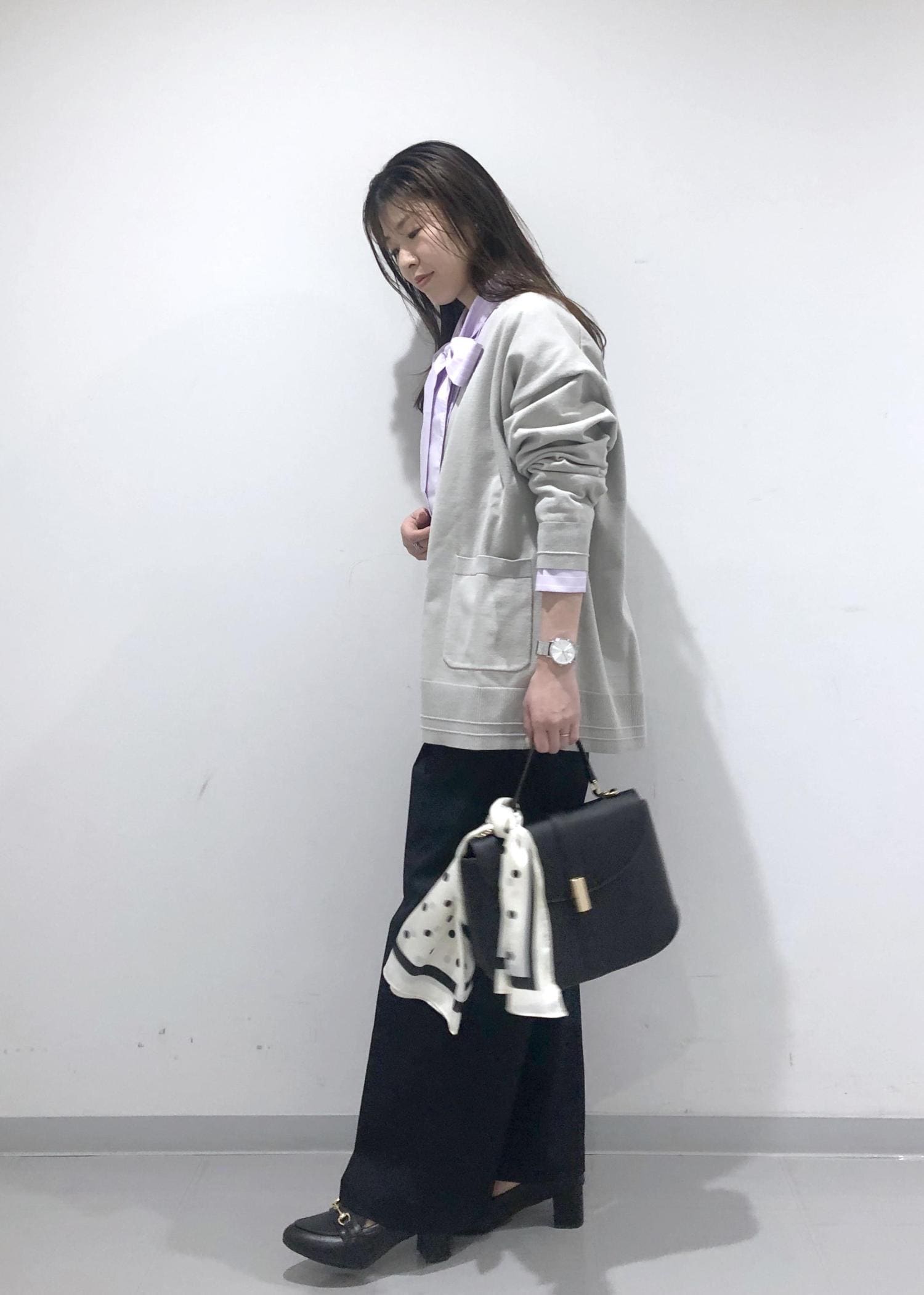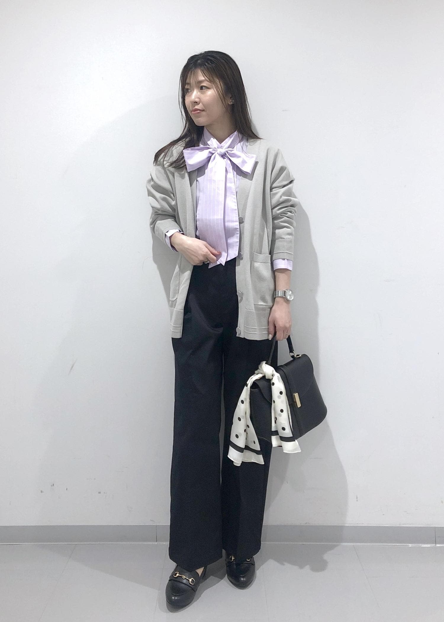 小物はブラックで合わせ、バッグにはドットのスカーフをプラスし、アクセントに!