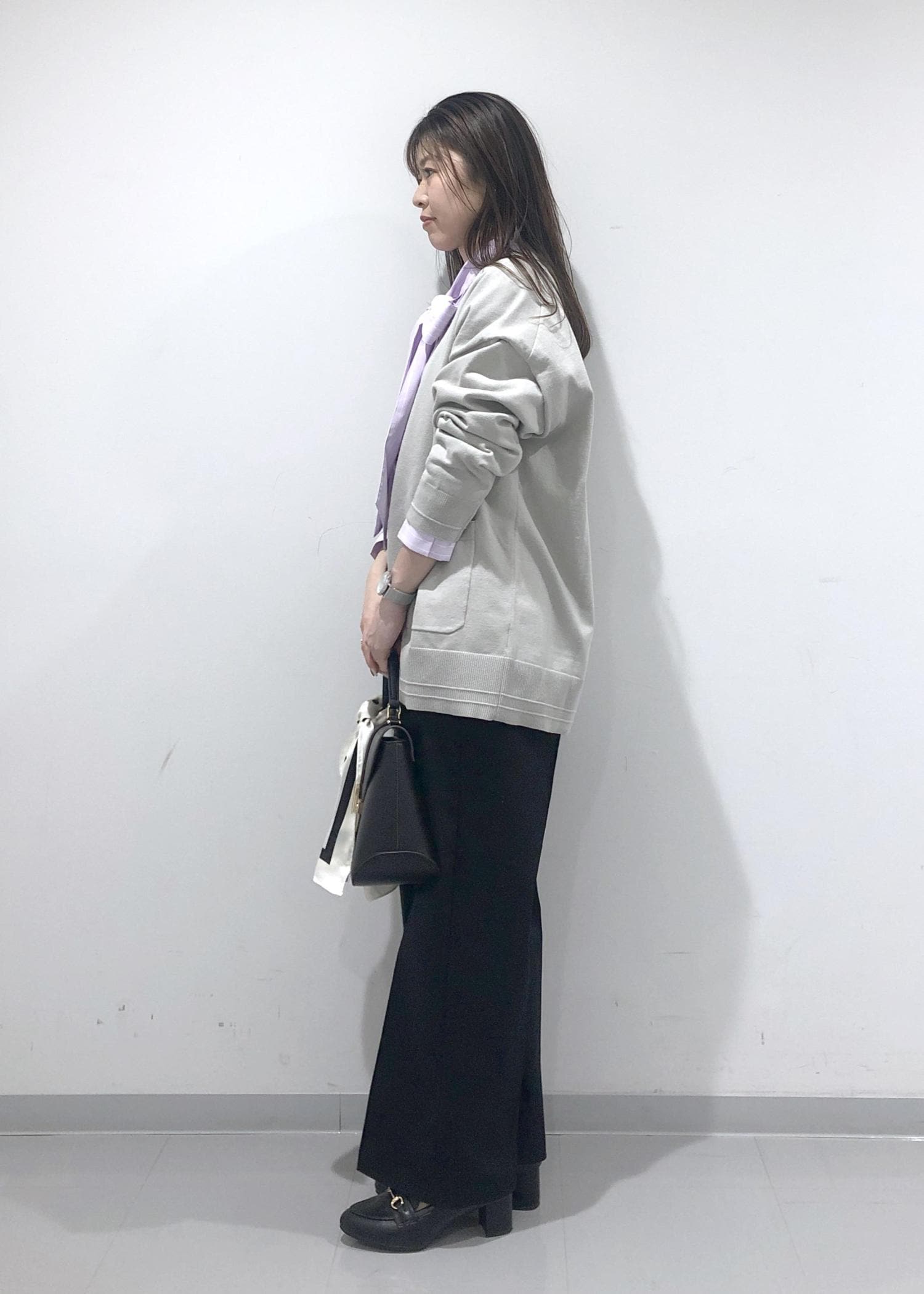 ネイビーのチノパンにミドル丈カーディガンを羽織り、お仕事でも普段でも兼用できるきれいめカジュアルにまとめました!