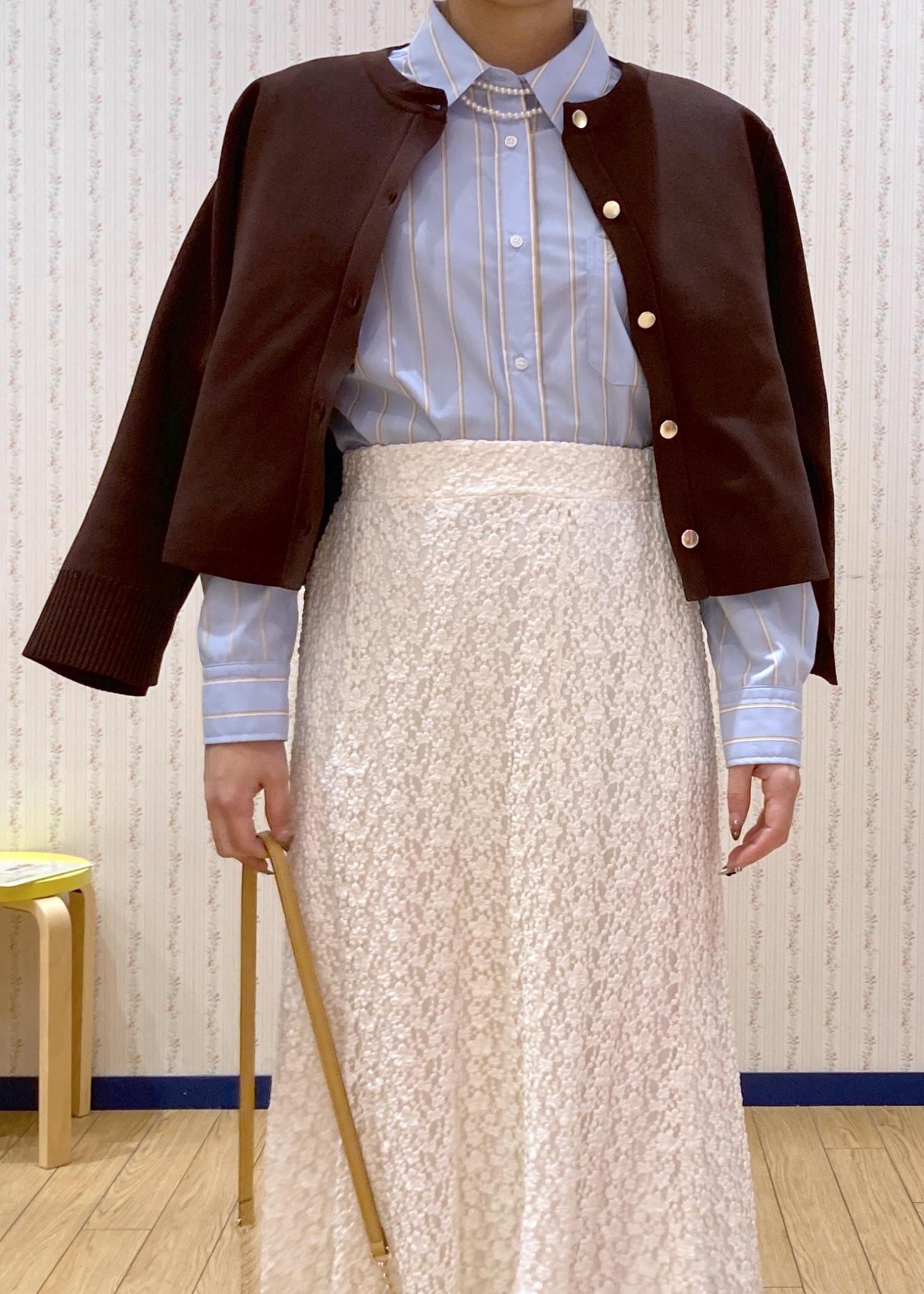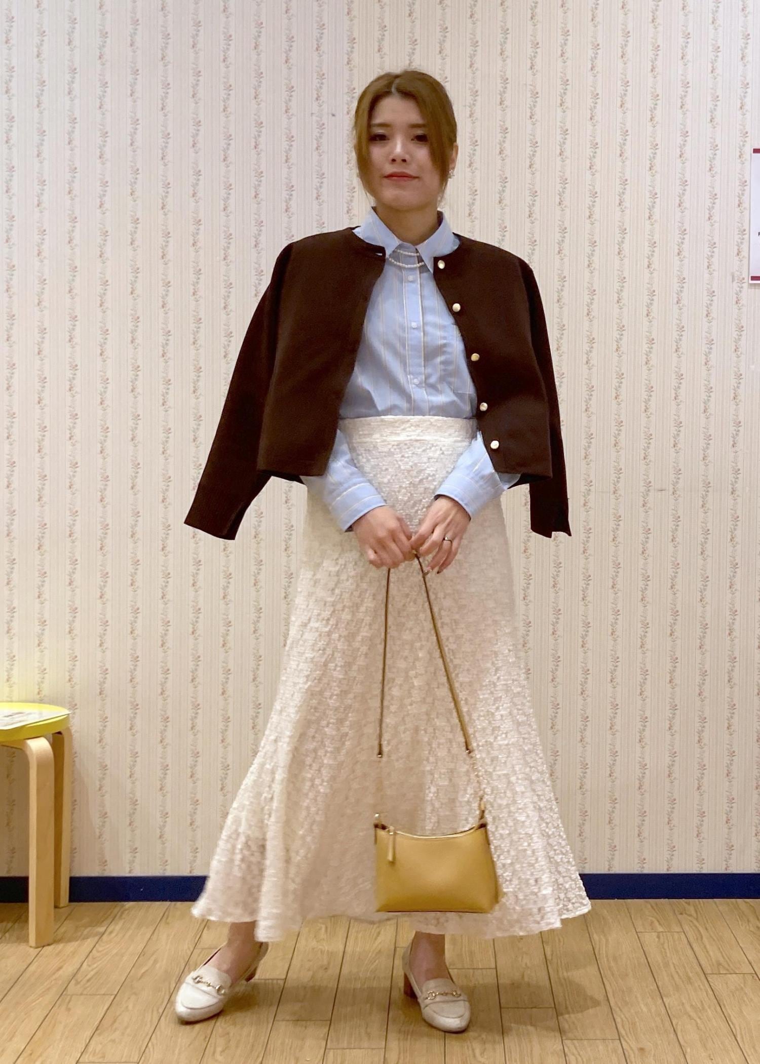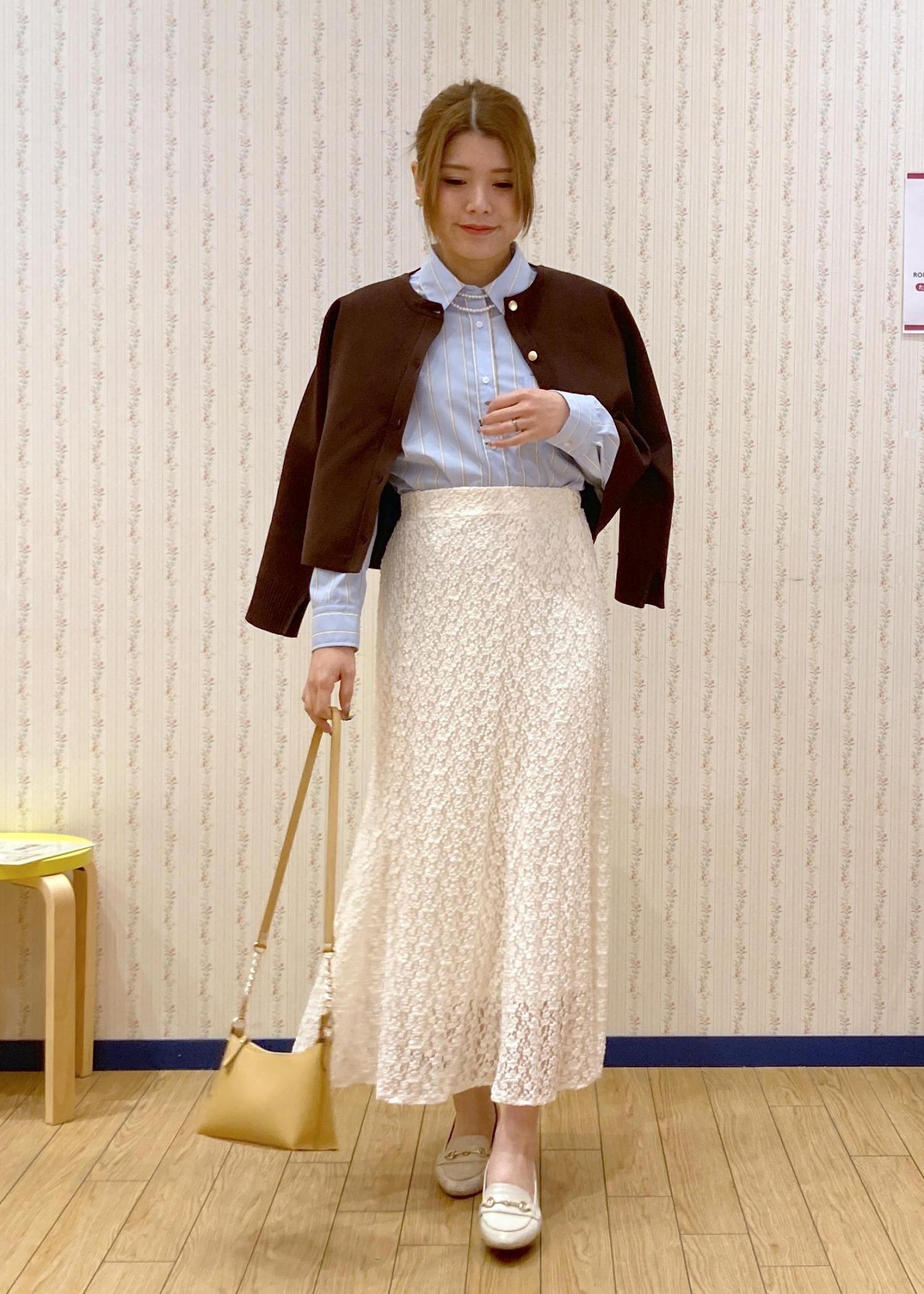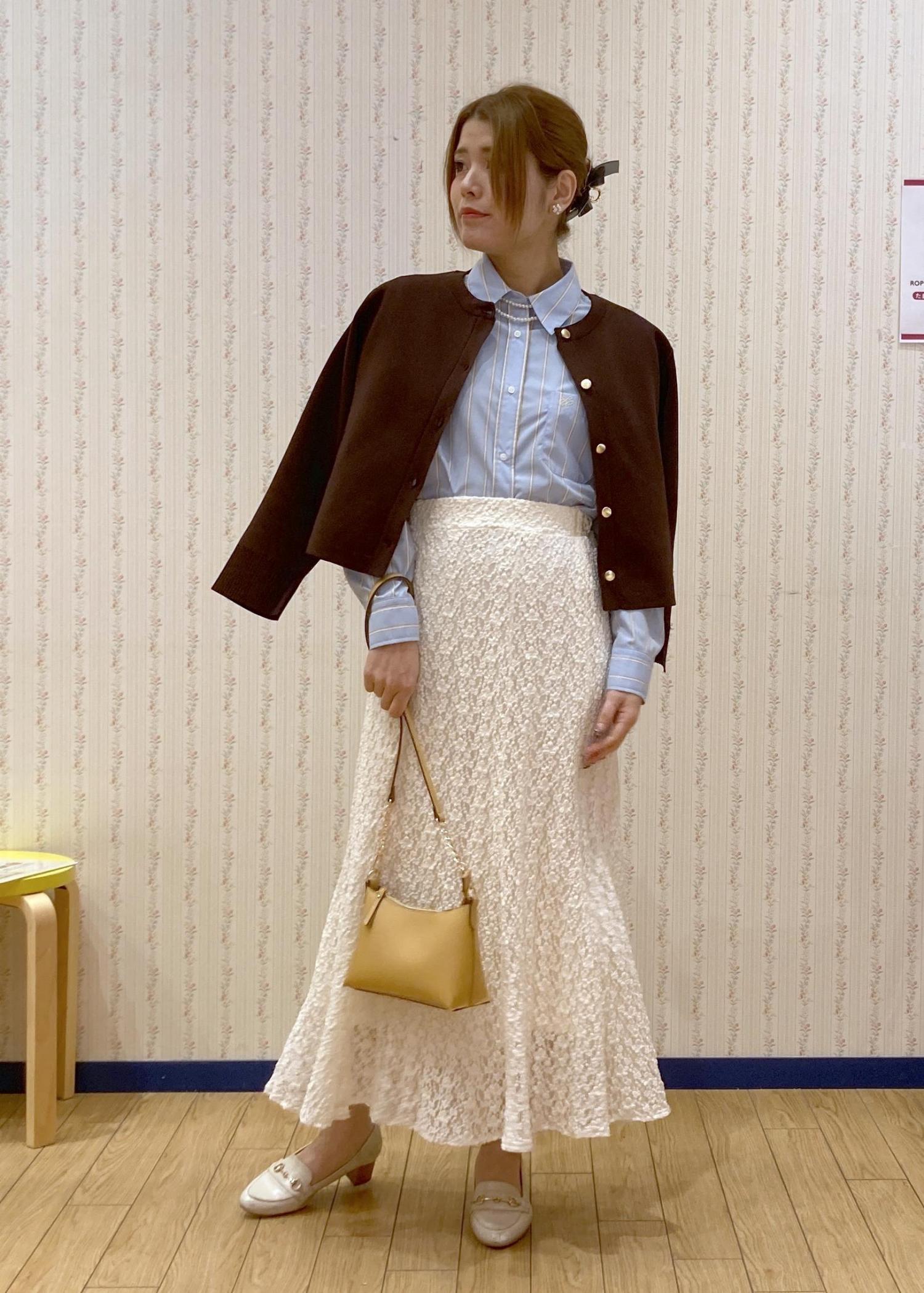 淡色でまとめたのでメリハリを付けるためにブラウンのカーディガンを肩がけして大人っぽさもプラスしたのがポイントです。