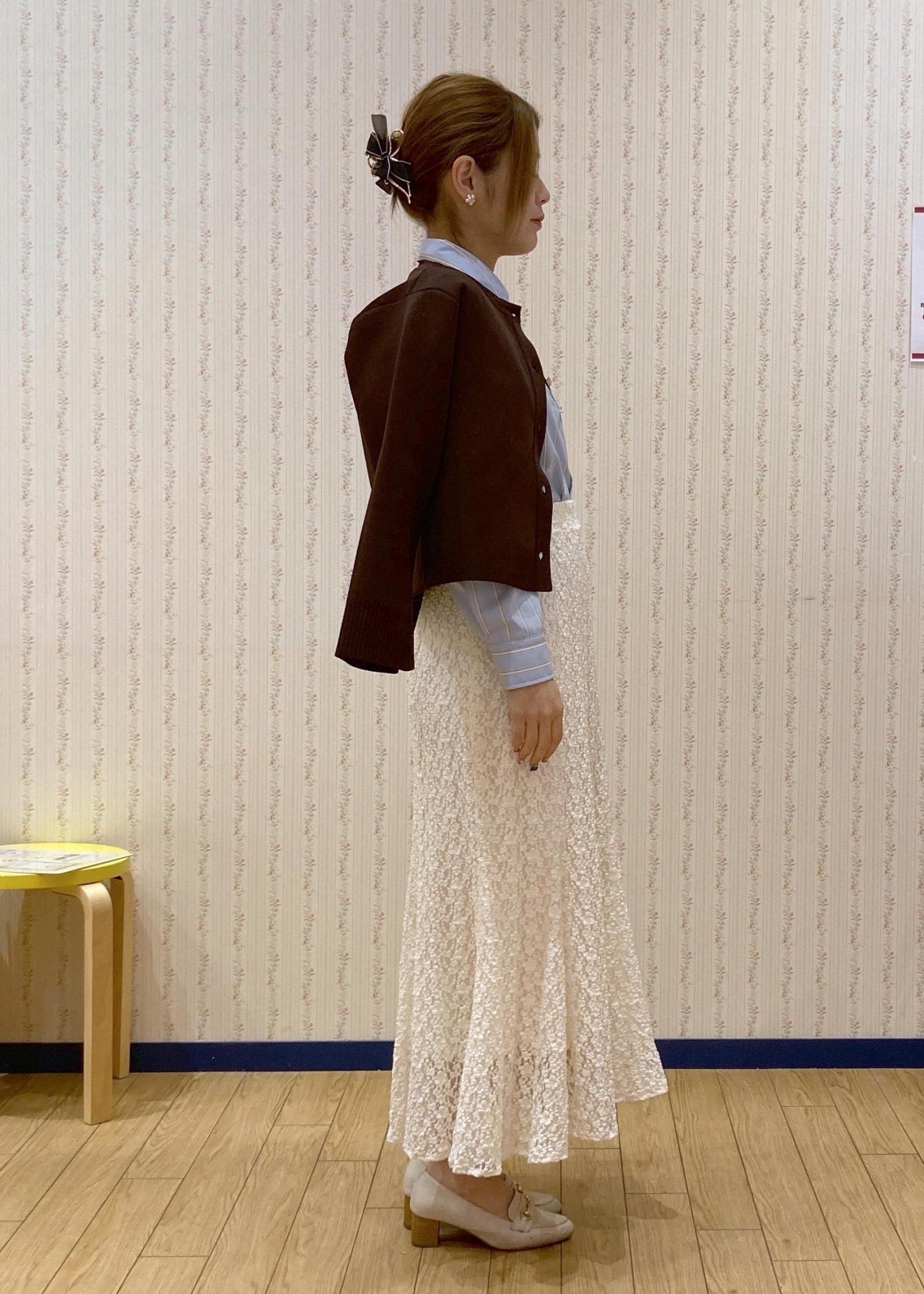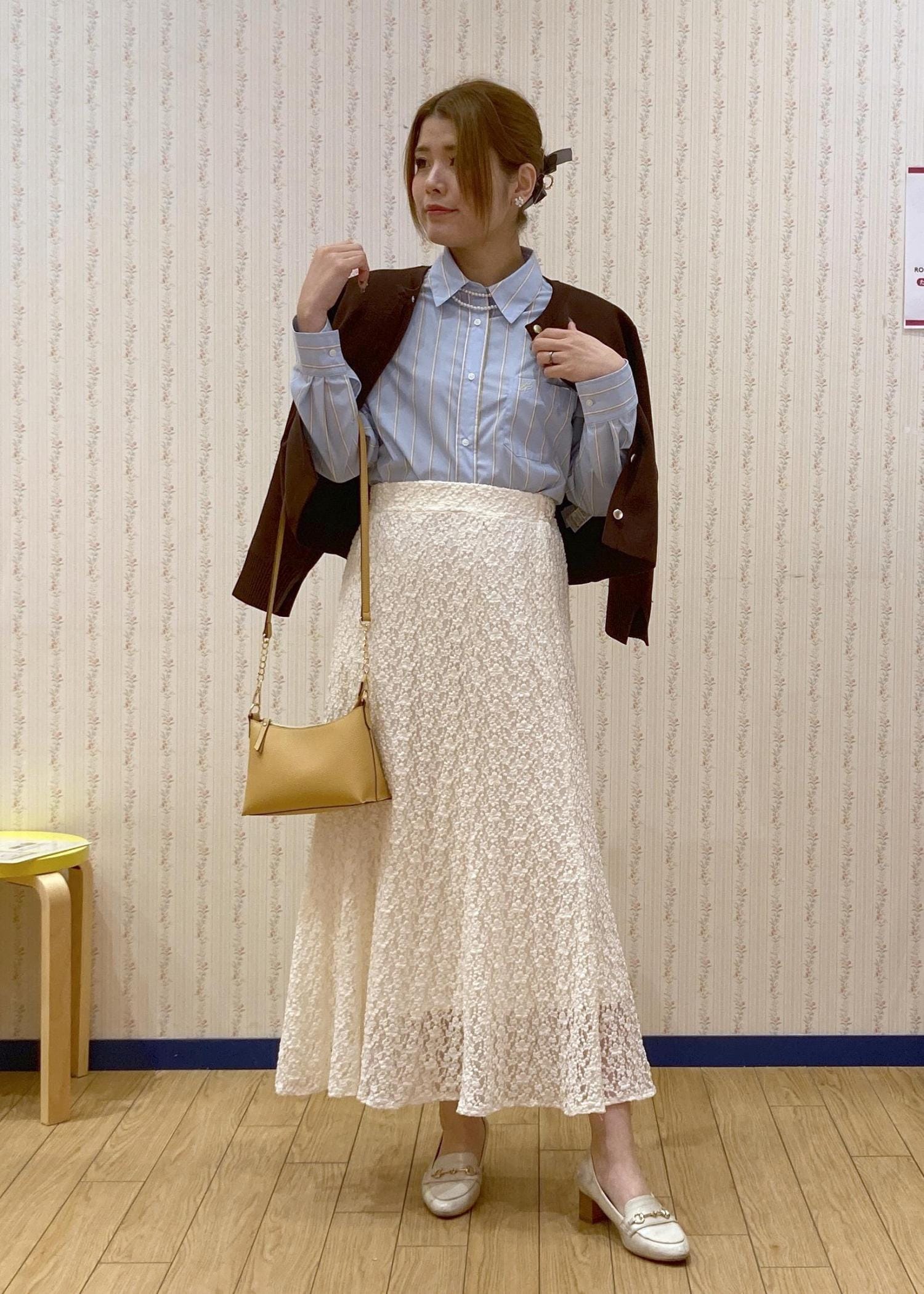 爽やかなブルーのシャツを主役にフェミニンなレースマーメイドスカートを合わせた定番デートコーディネートです!