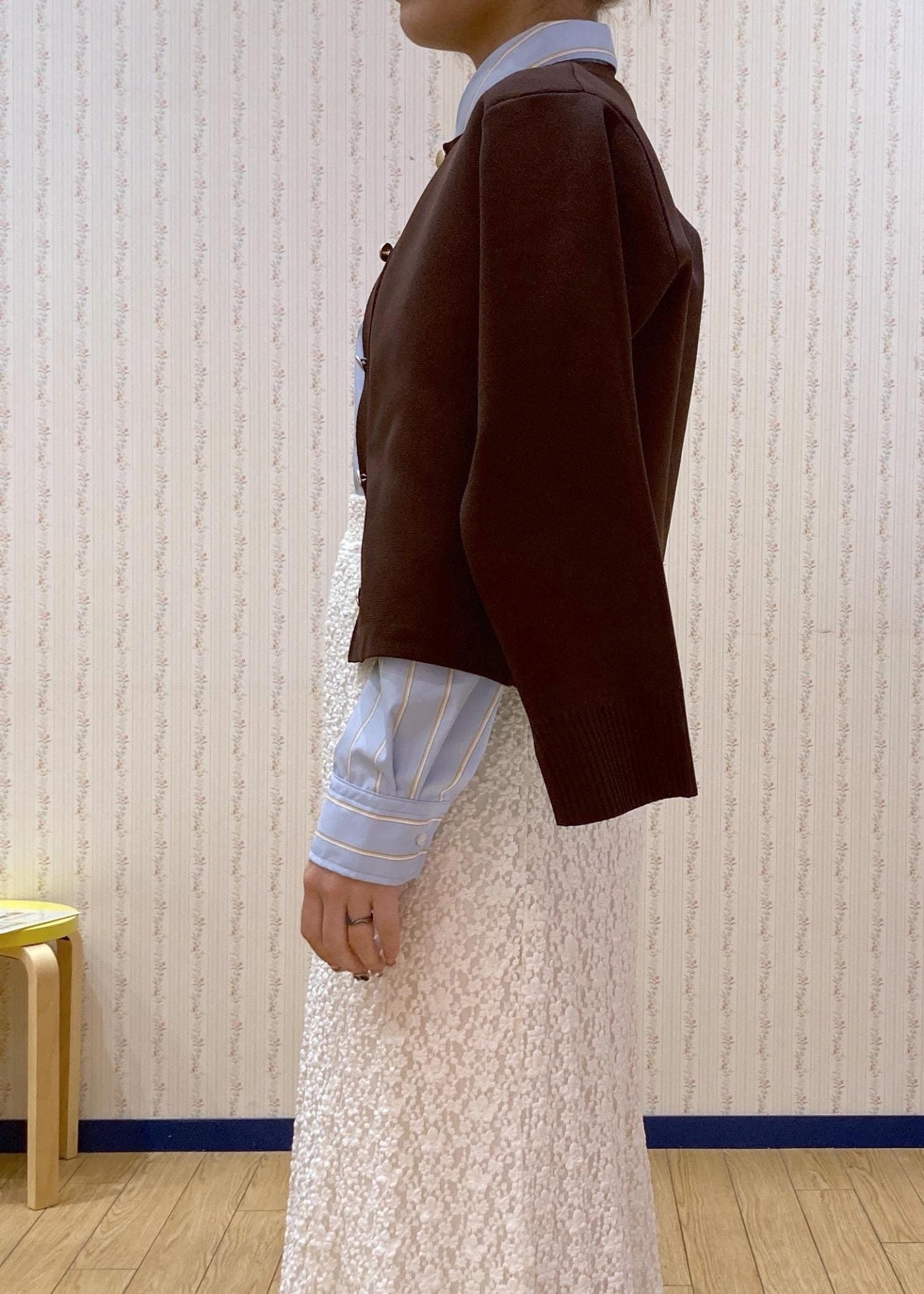 ROPÉ PICNIC襟フリルドッキングカーディガンダークブラウン / F¥5,995レビュー首元と袖口にフリルがドッキングされたカーディガンです。