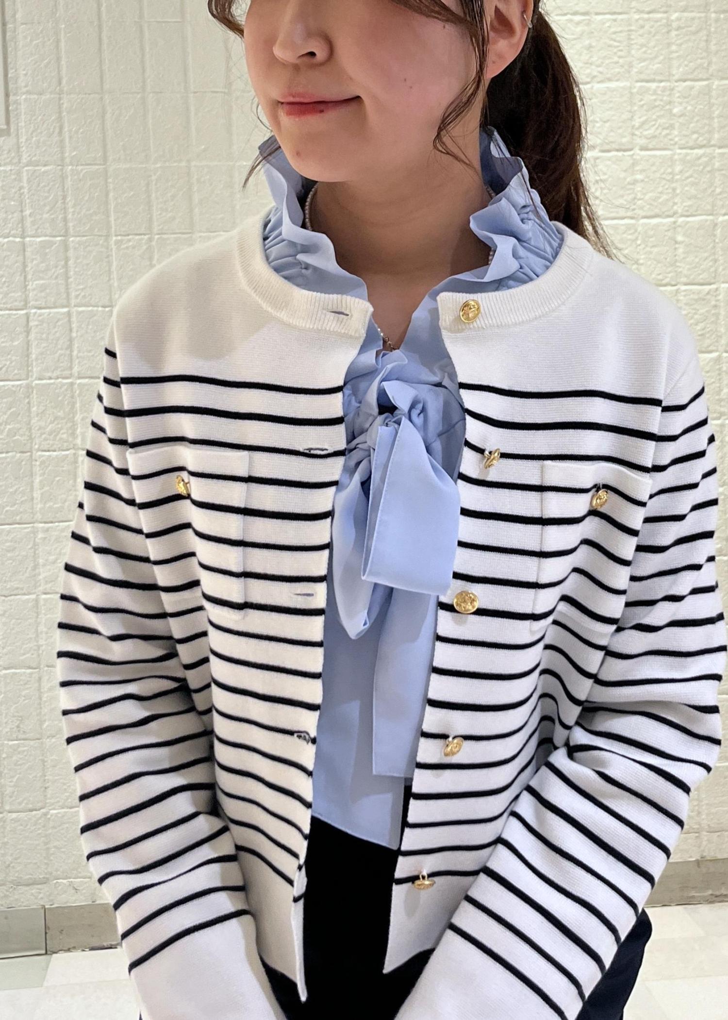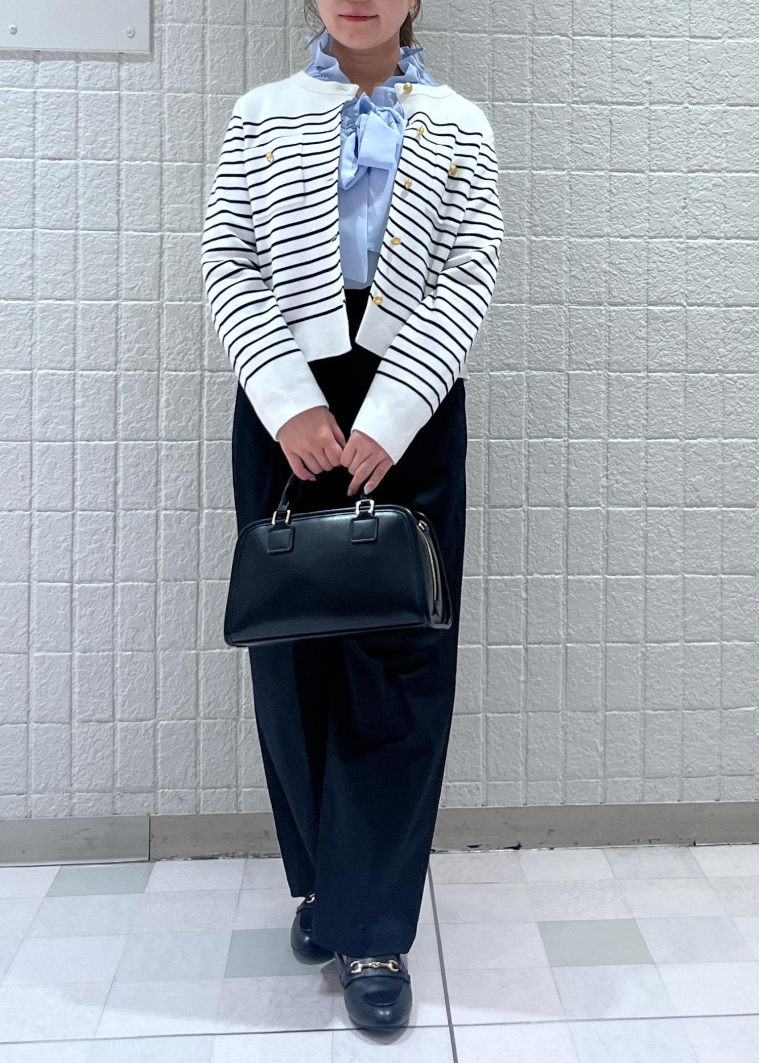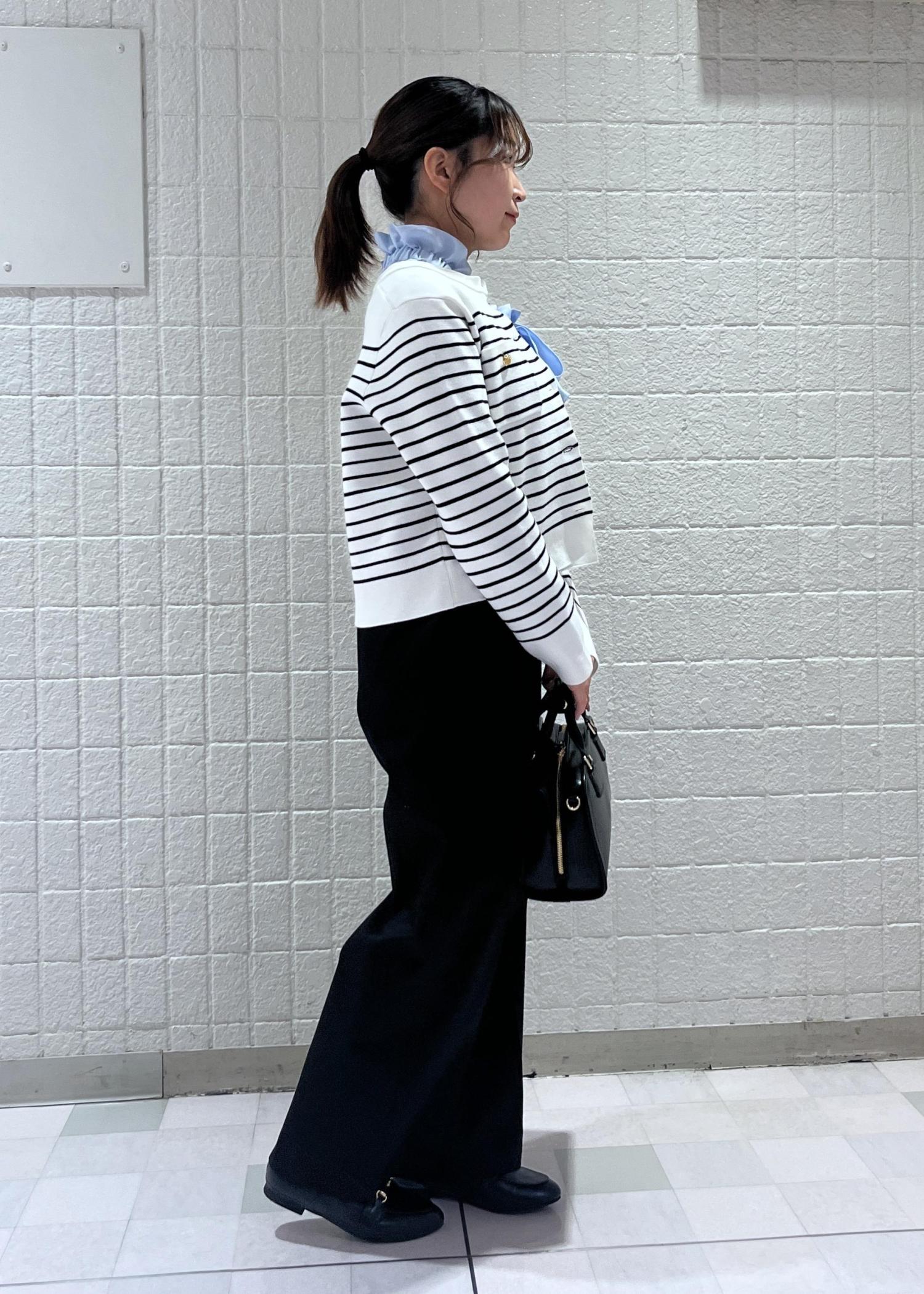 爽やかなブルーのフリルブラウスに、しっかり生地のボーダーカーディガンを合わせた上品さのあるコーディネートにしてみました