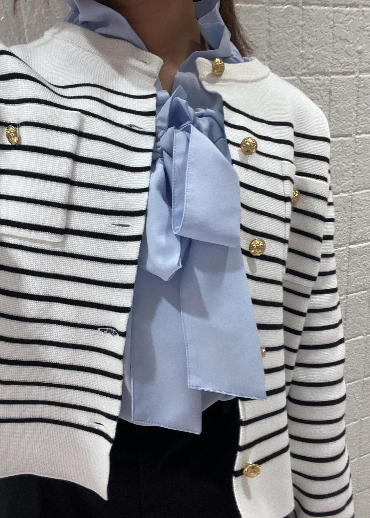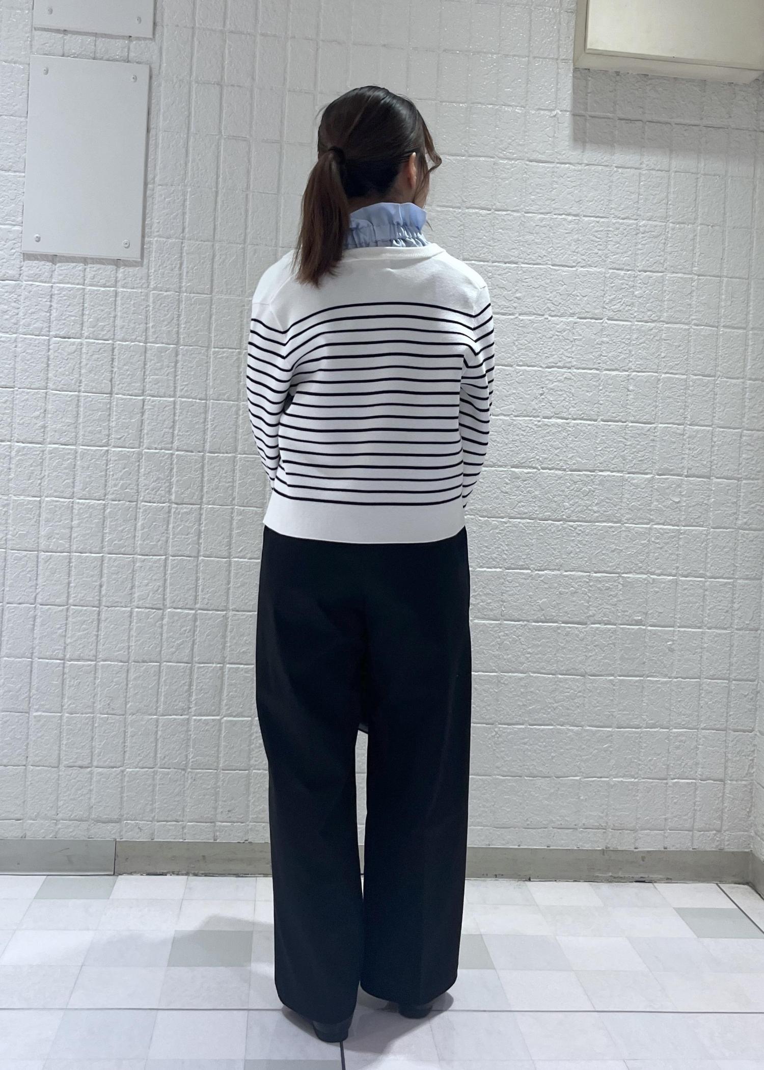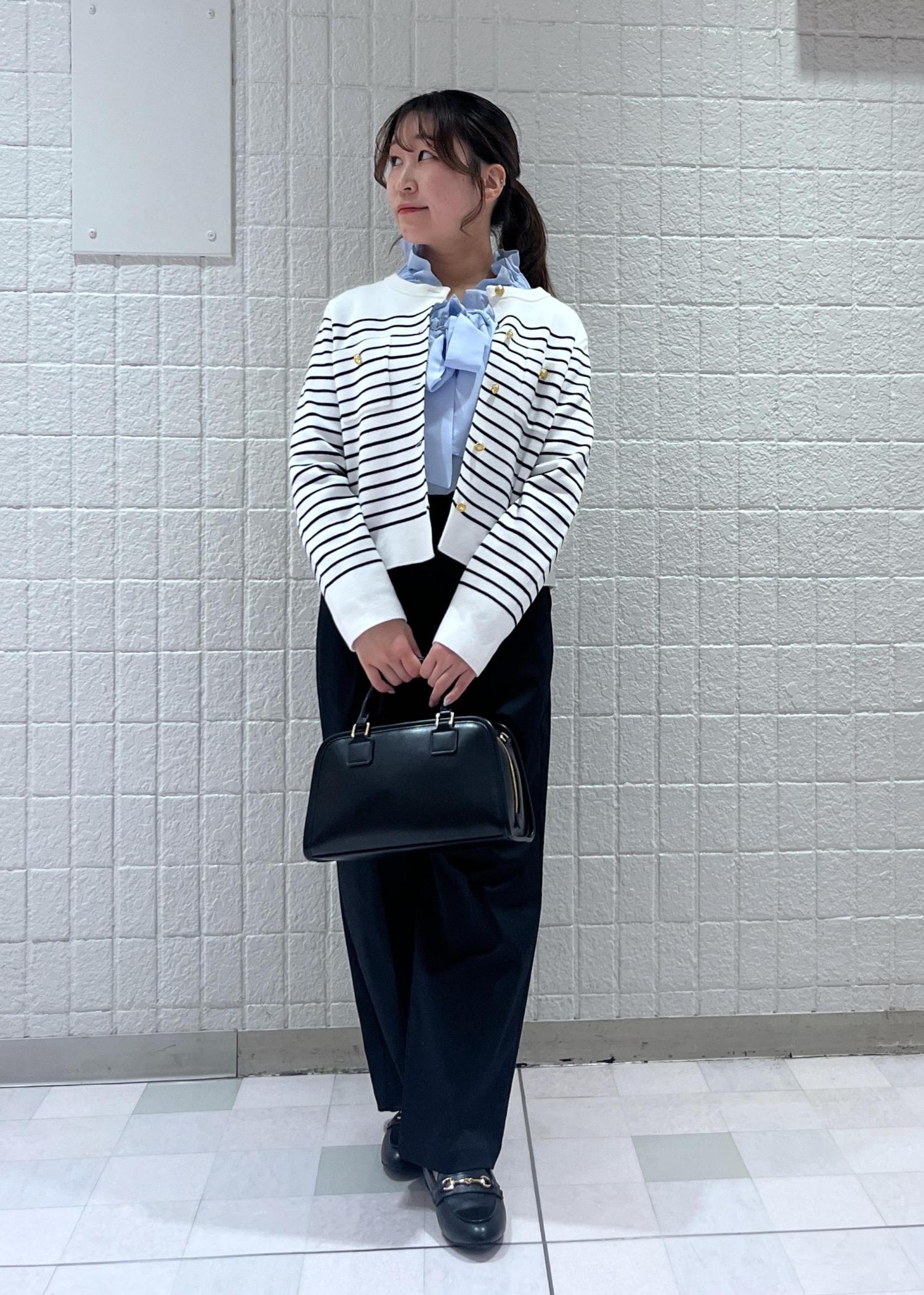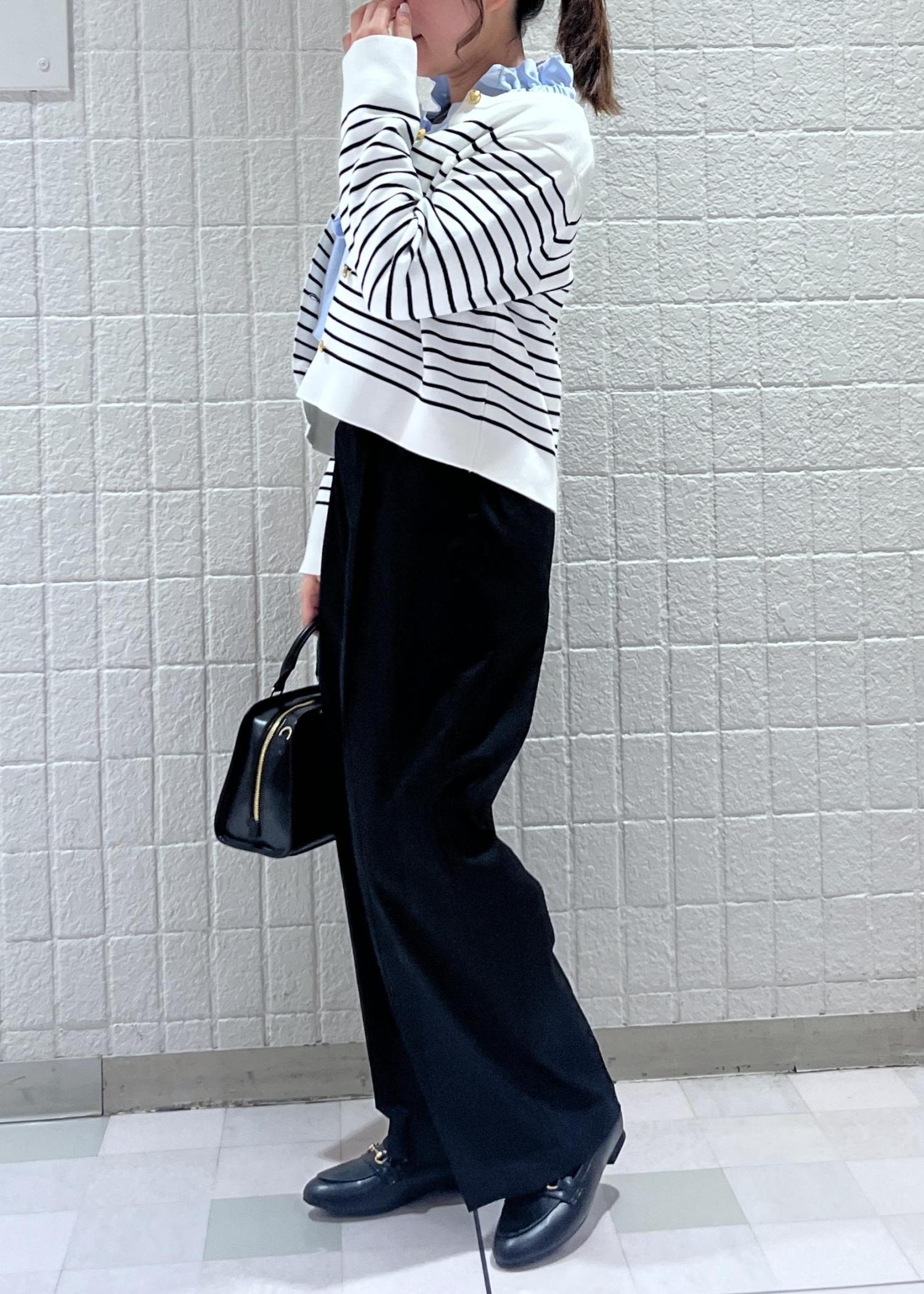 爽やかなブルーのフリルブラウスに、しっかり生地のボーダーカーディガンを合わせた上品さのあるコーディネートにしてみました