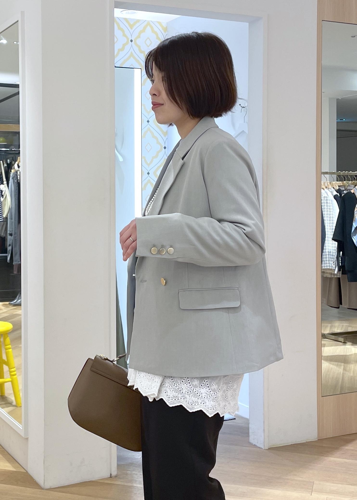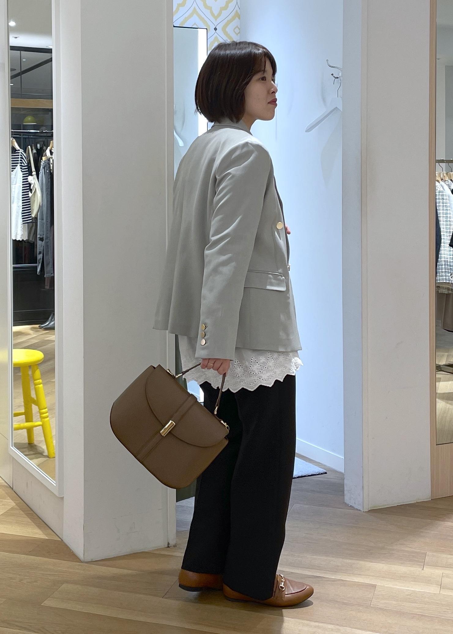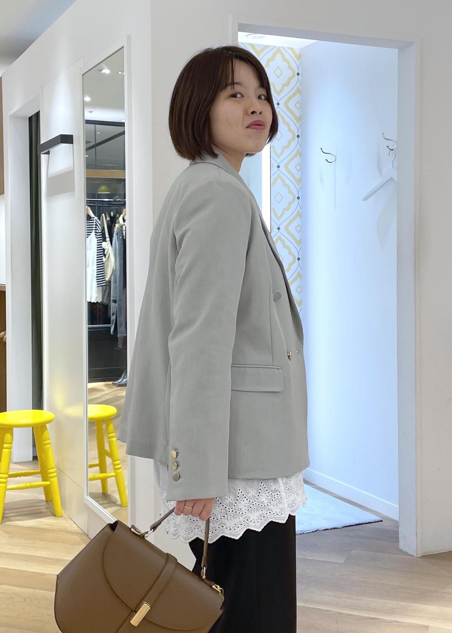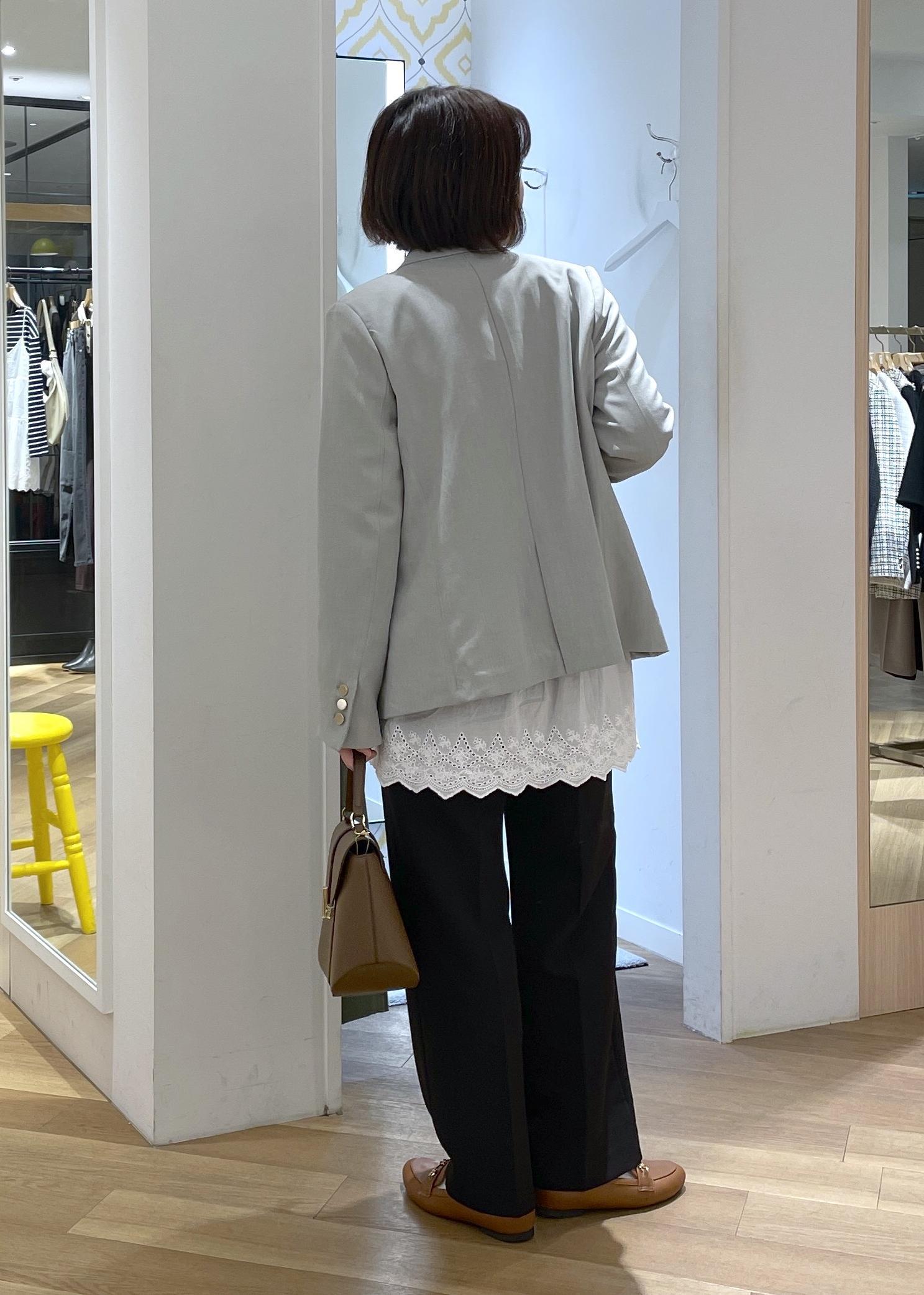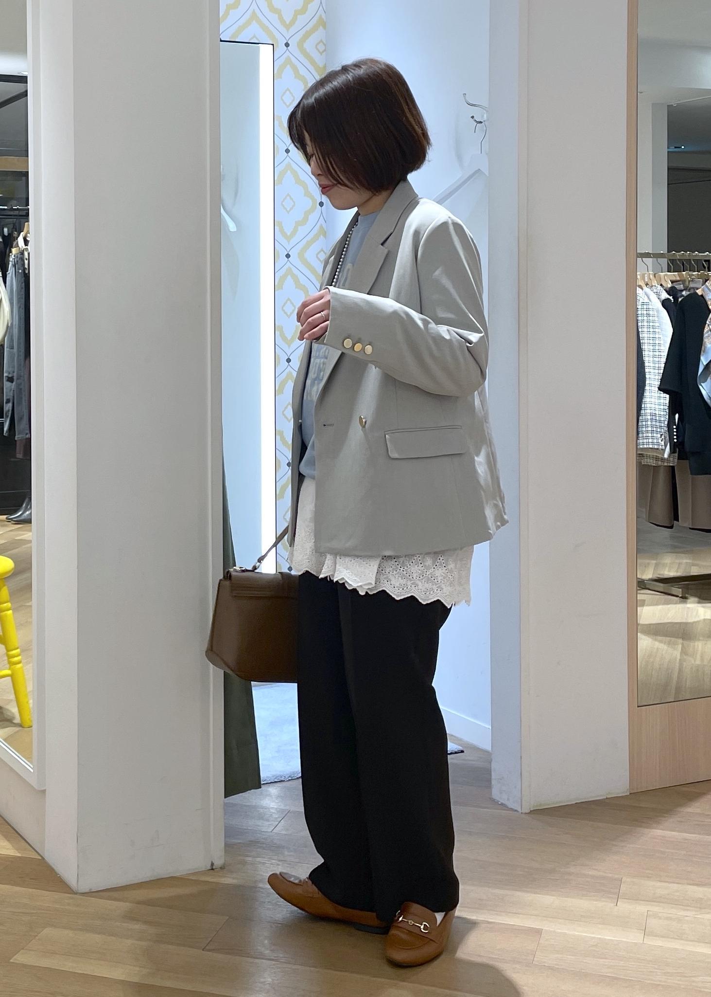 ジャケットできちんと大人っぽく決めつつ、スウェットでカジュアルさを、レースでトレンド感をプラスしたコーデです!