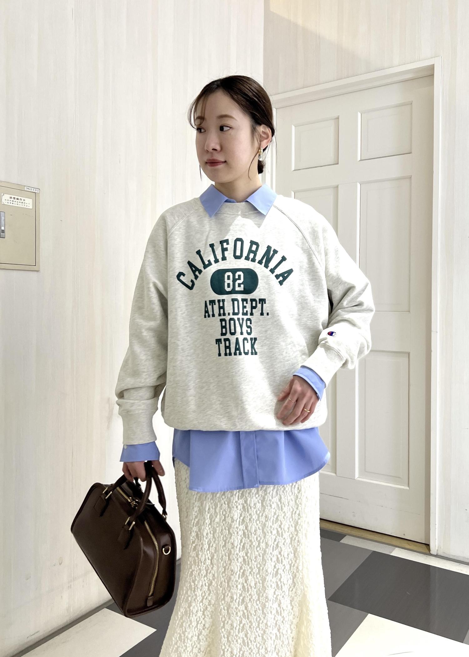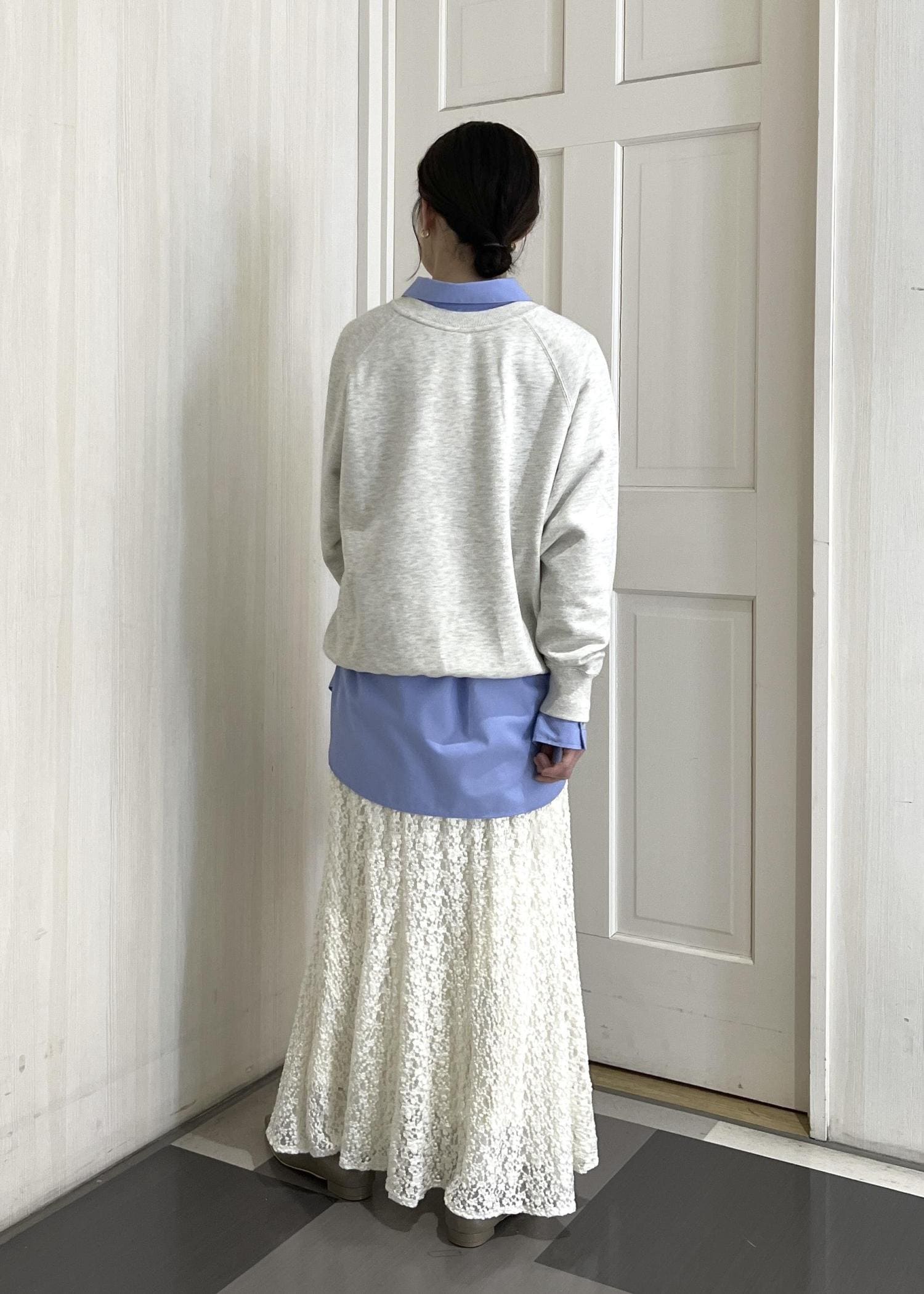 フェミニンな印象のレーススカートを、スウェットでカジュアルに着こなしました。