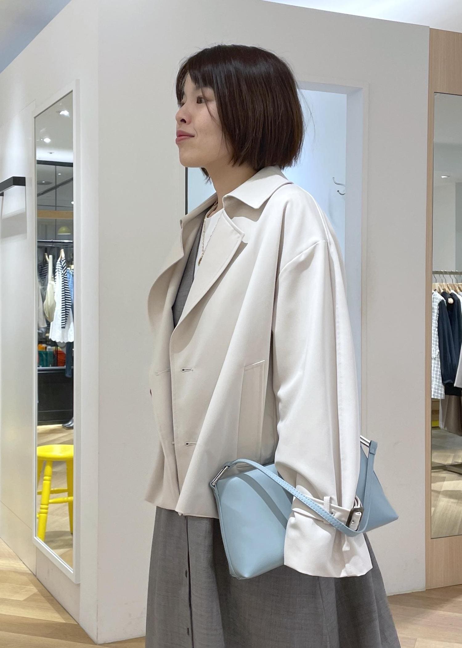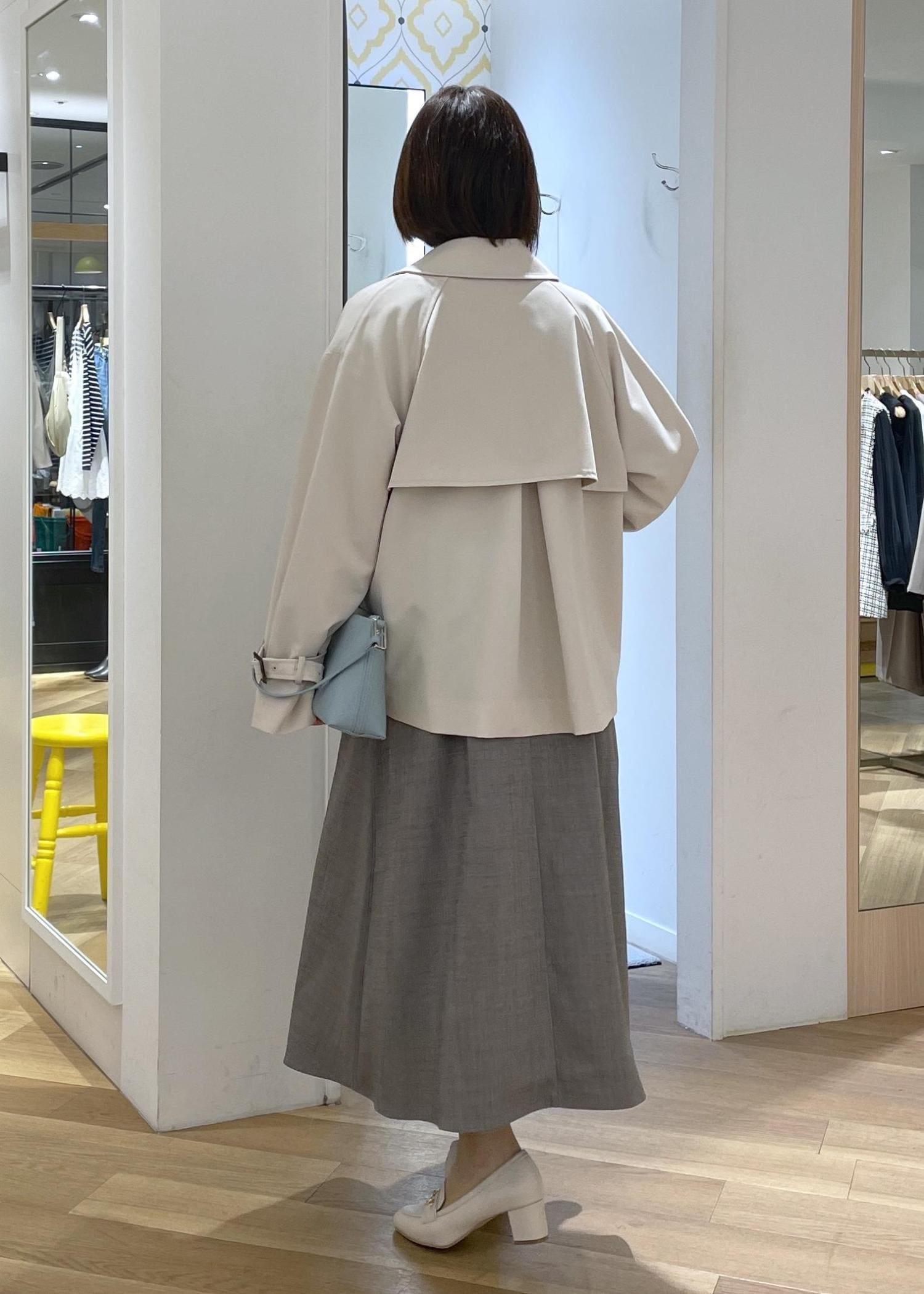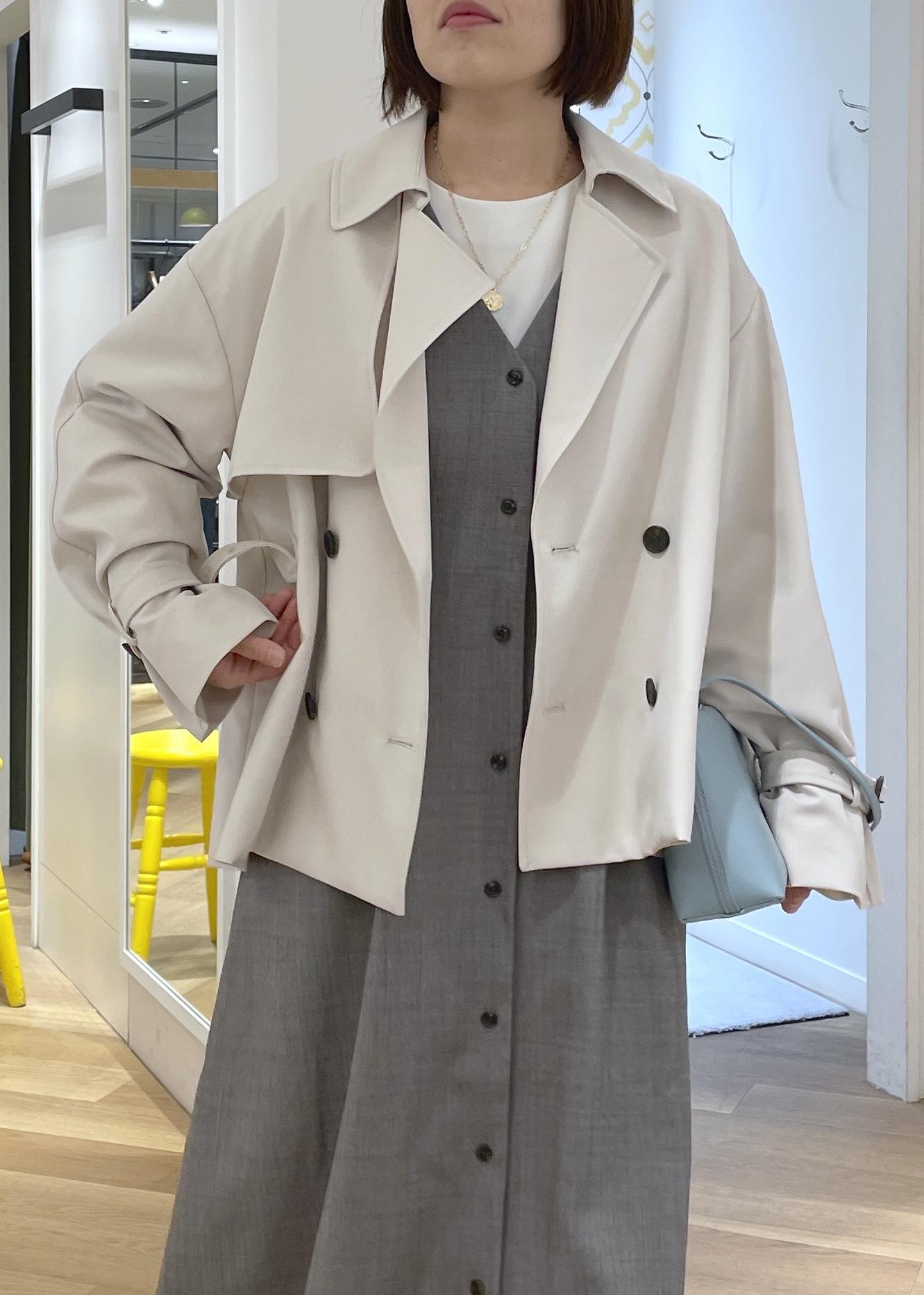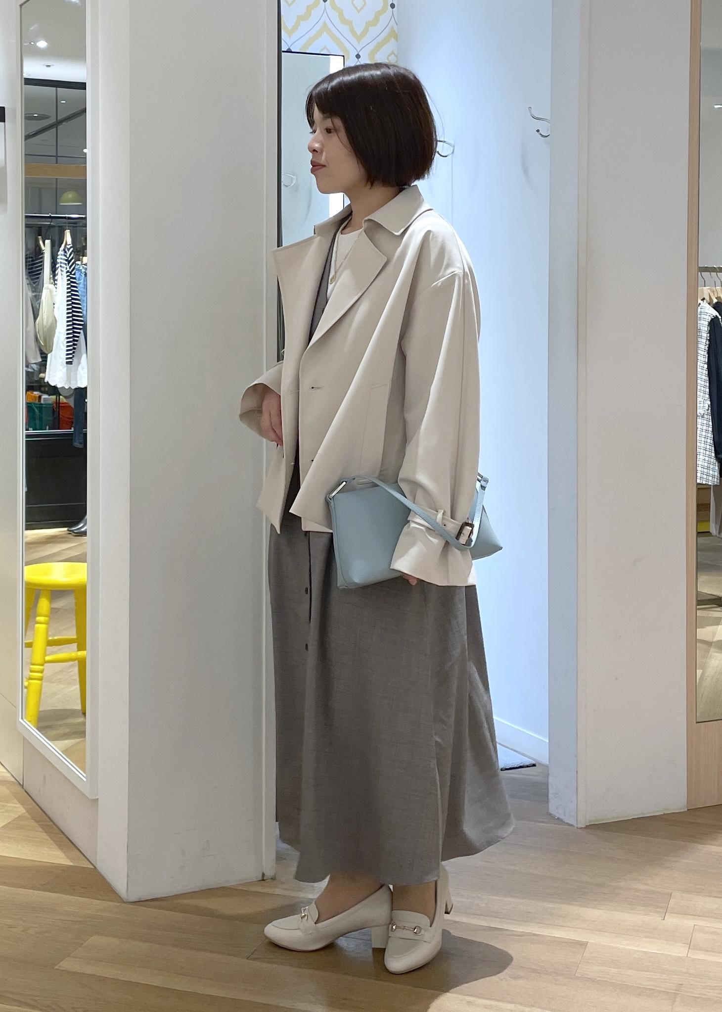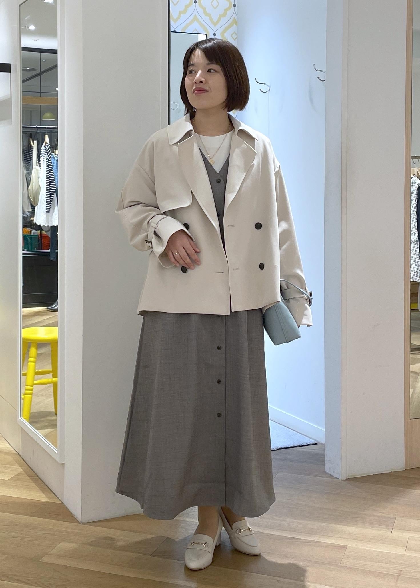 きちんと感のあるグレーのジャンスカコーデに柔らかなベージュのショートトレンチを合わせたきれいめコーデです!