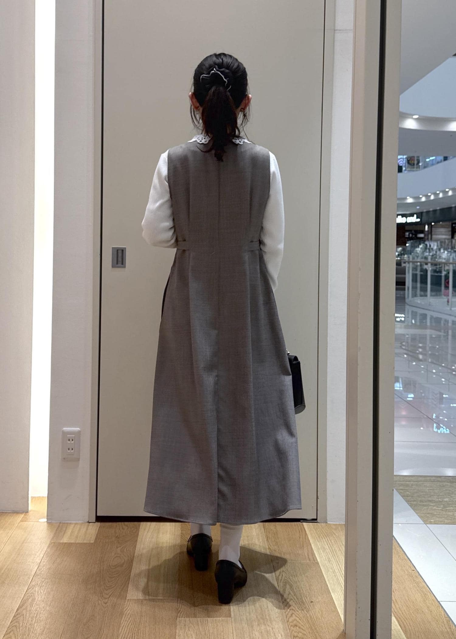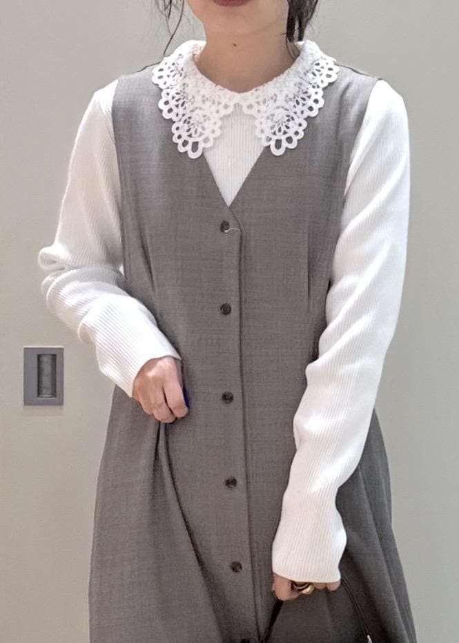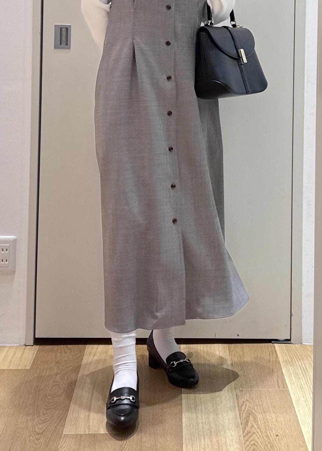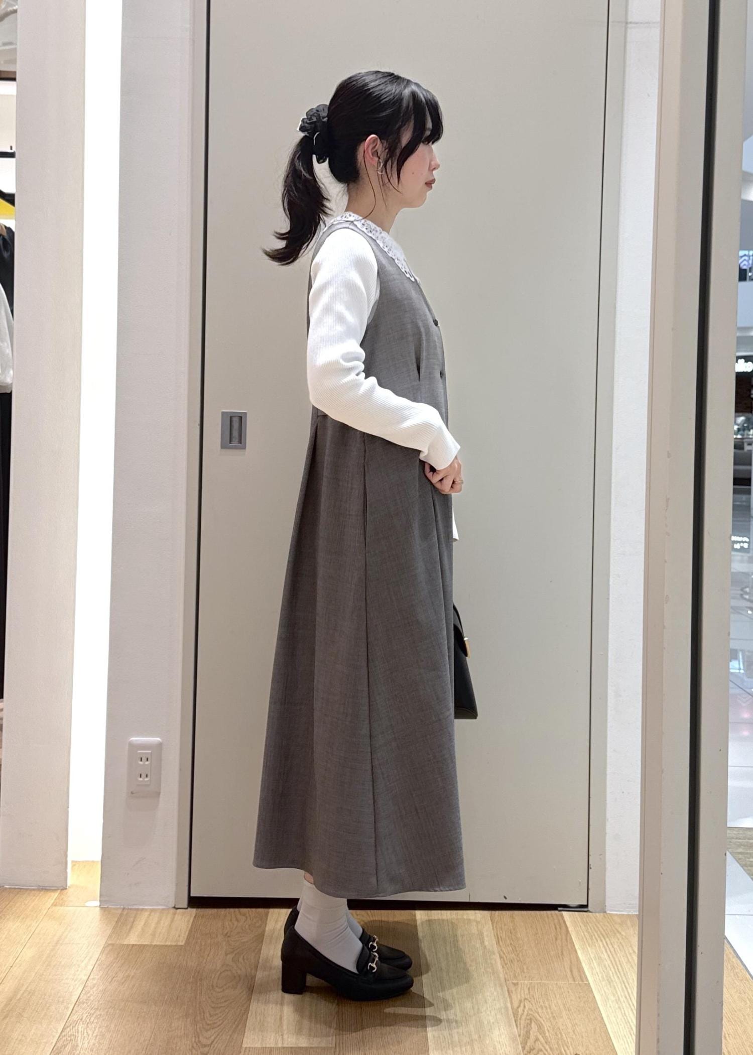 春らしくニットは白、ジャンスカは明るいグレーを選び、甘めになりすぎないように小物は黒をチョイスしてみました。