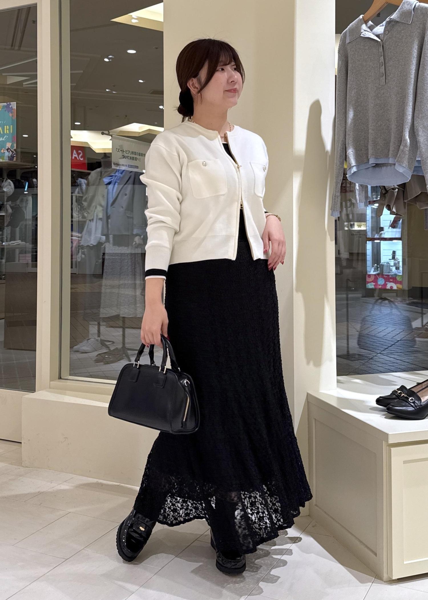 レースで華やかさを出しながら、ミラノリブのカーディガンできちんと感を。