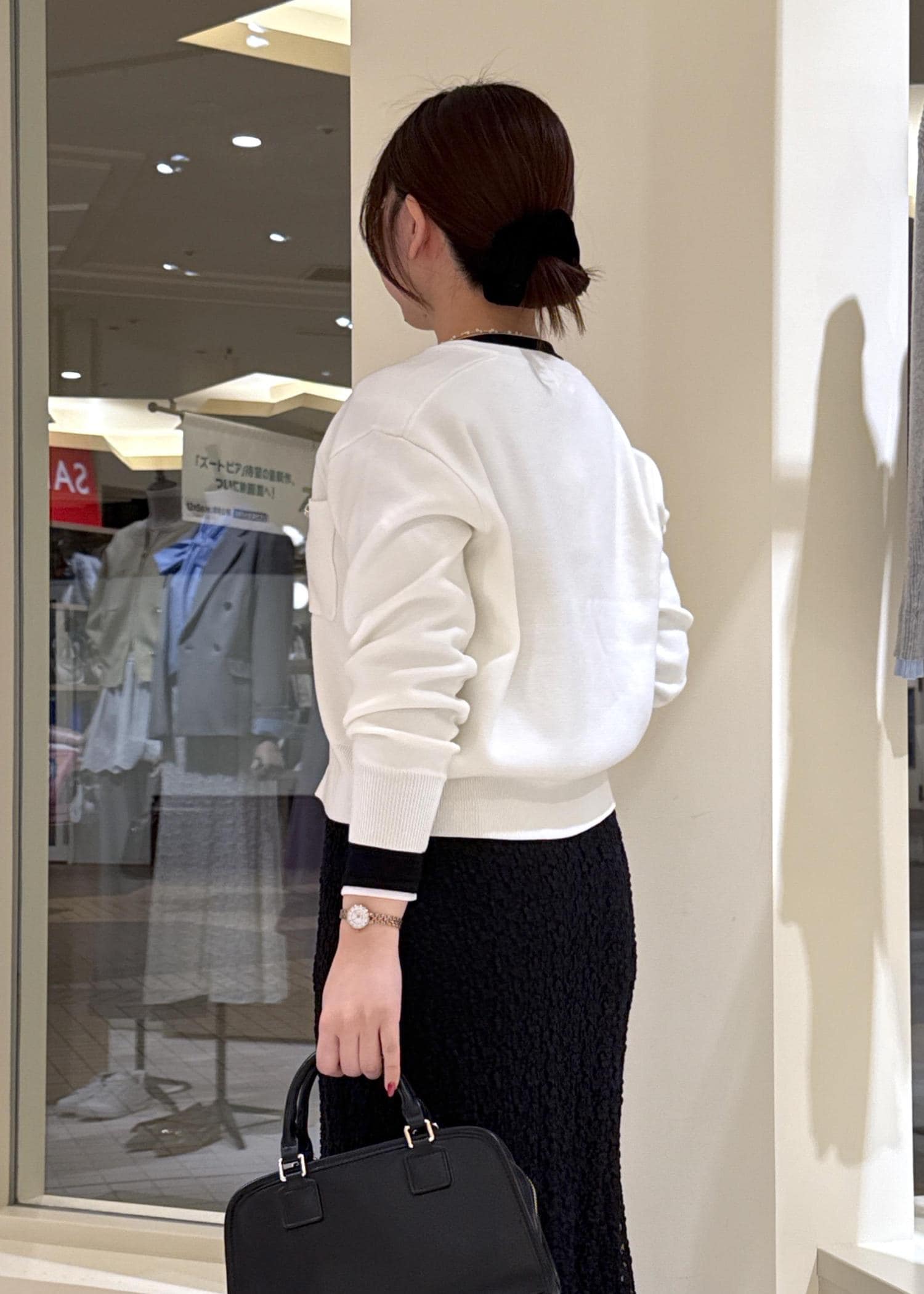 よりカチッとしたい時にはボタンデザインのミラノリブカーデがおすすめ。