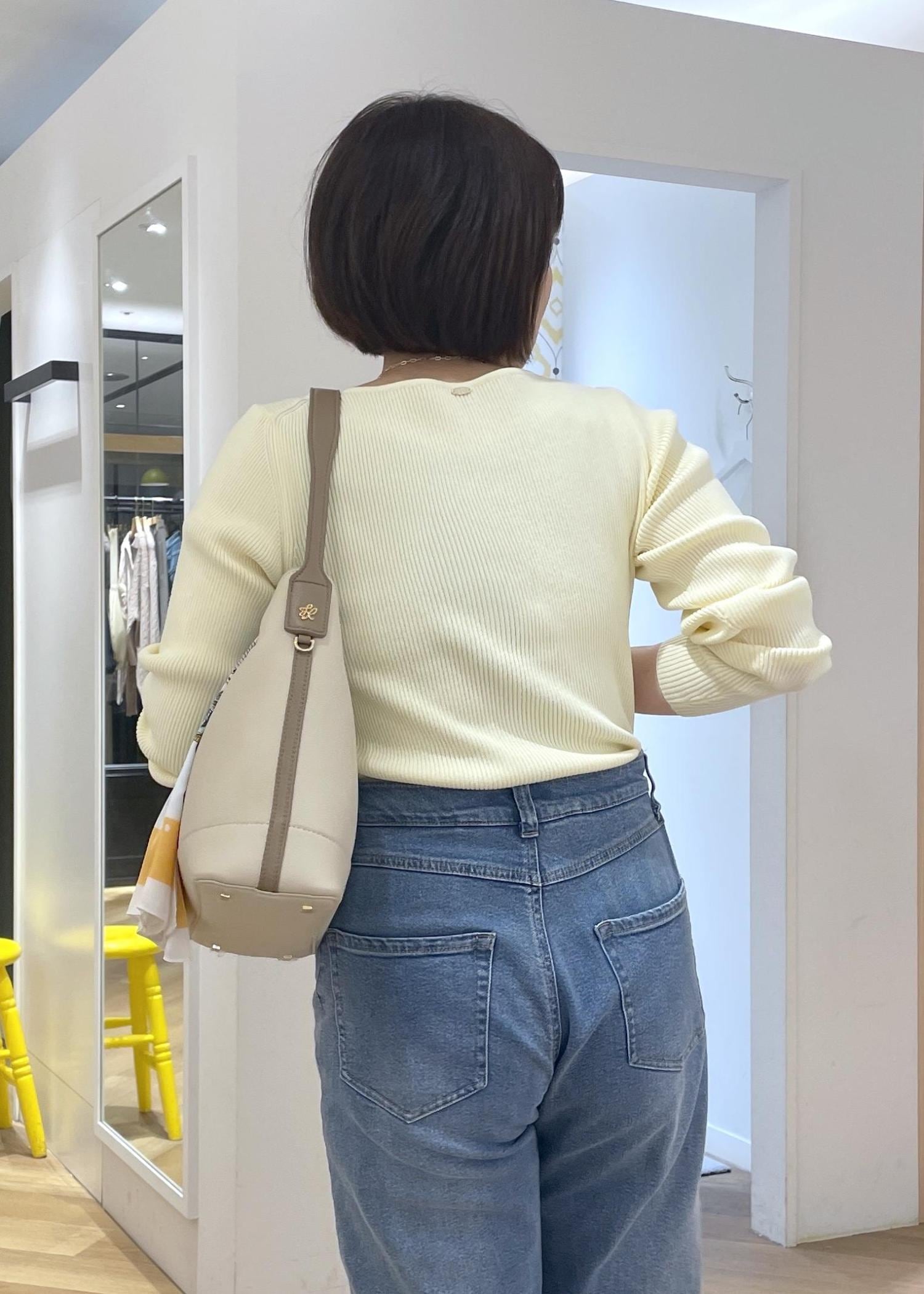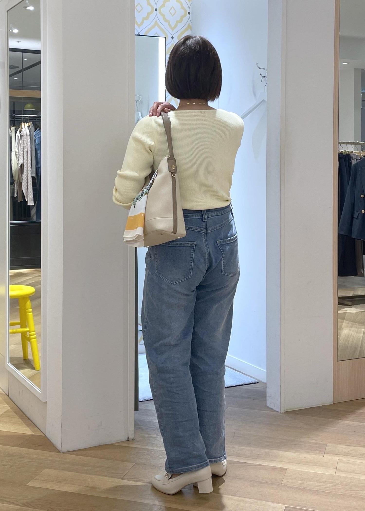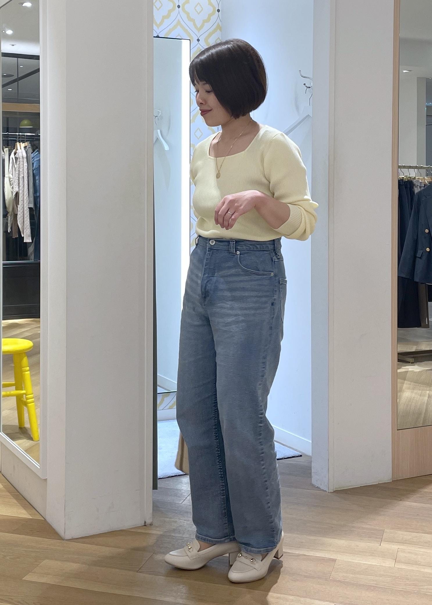 柔らかなクリームイエローが春にぴったりのリブニットにデニムを合わせたシンプルカジュアルコーデです!