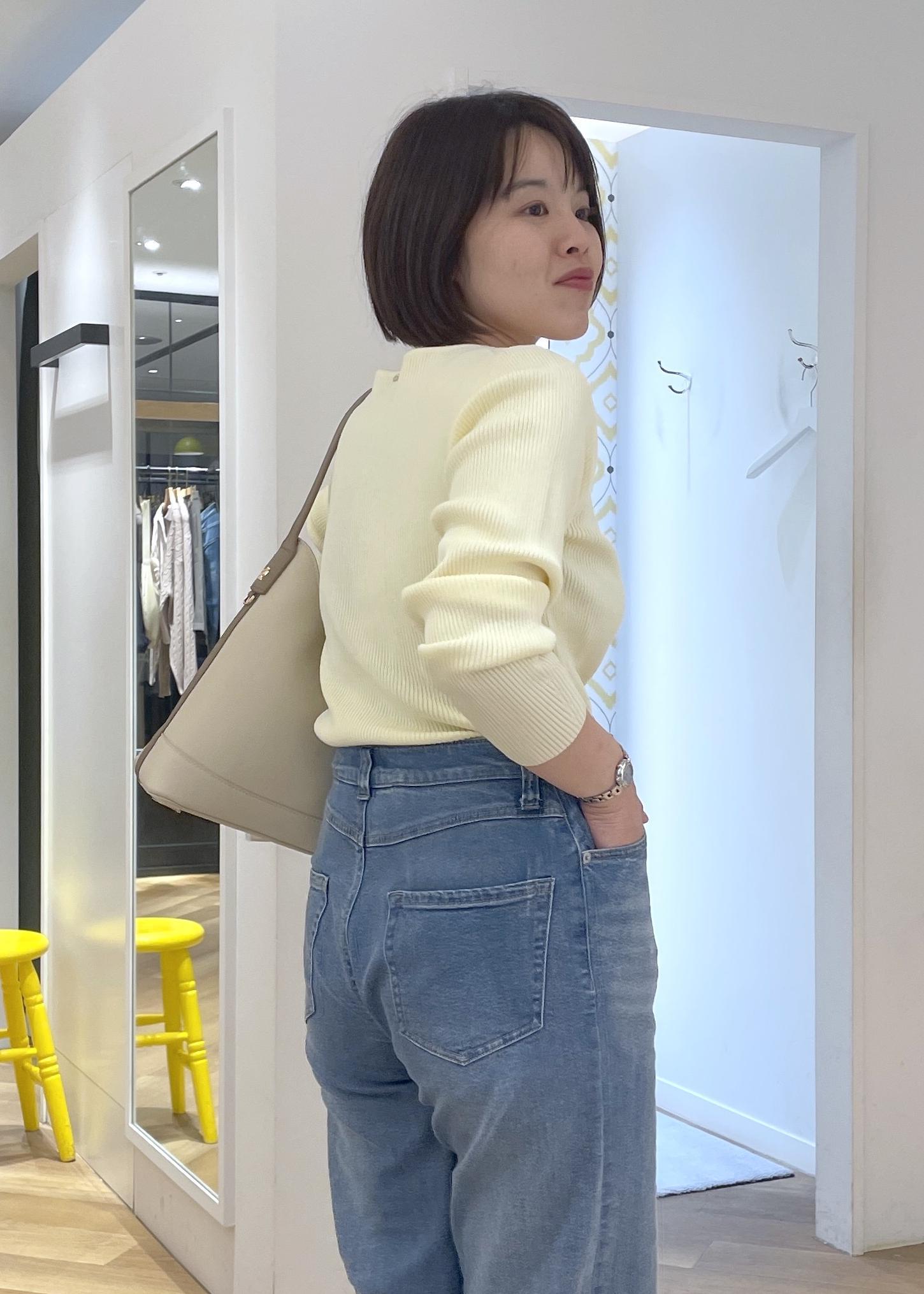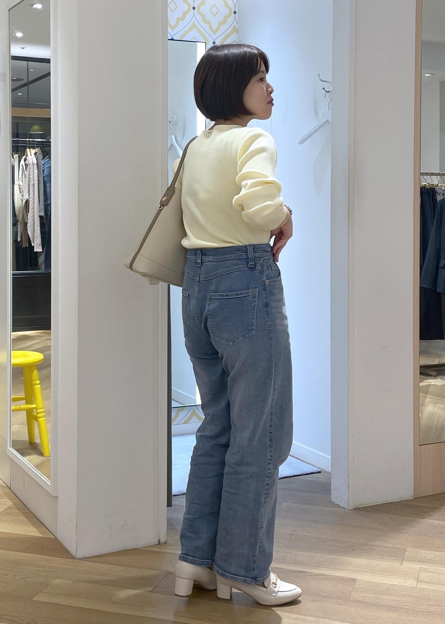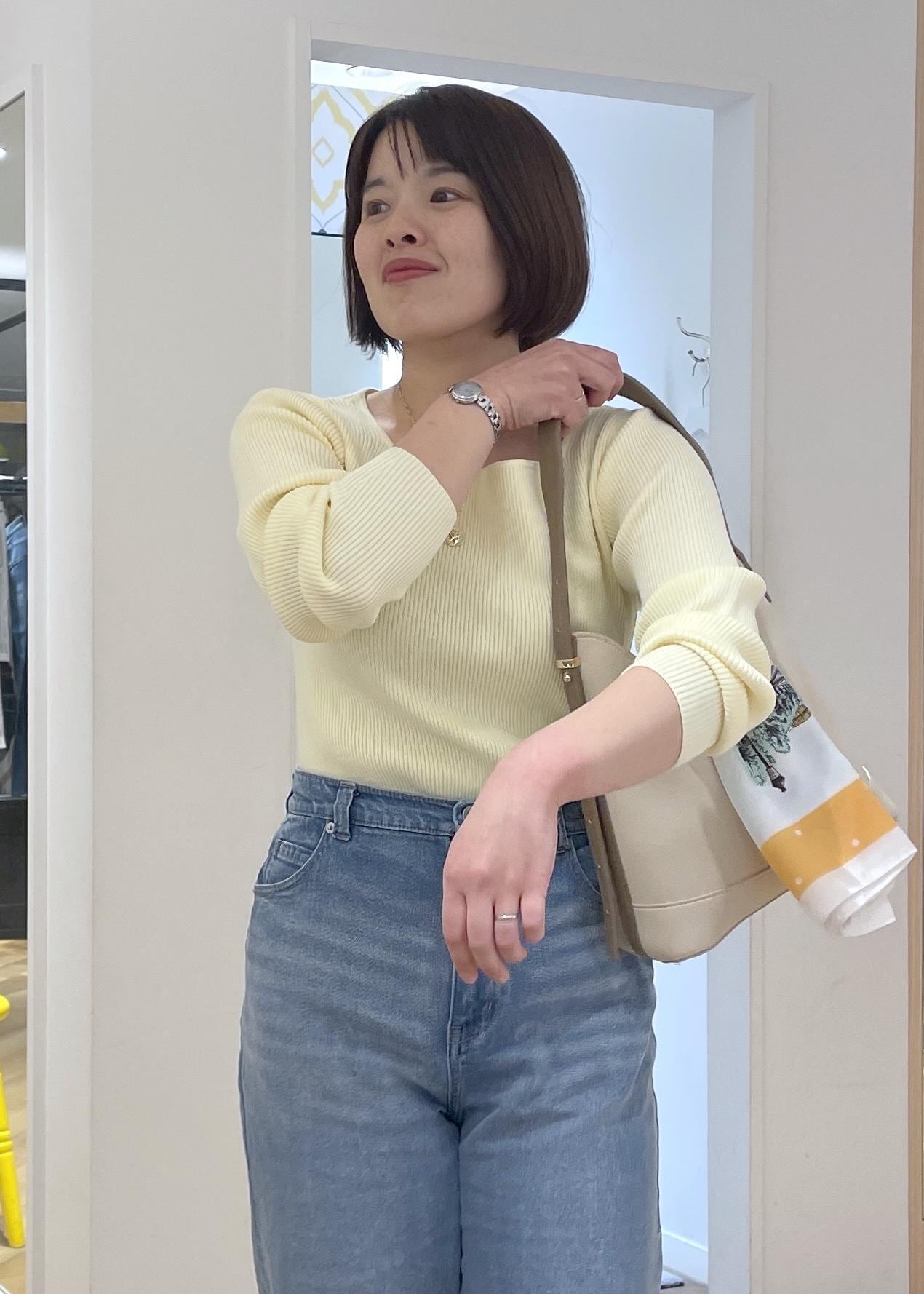 リブニットとデニムのバランスがメリハリもあり、春カラーを大人っぽくお召し頂けるコーデです!
