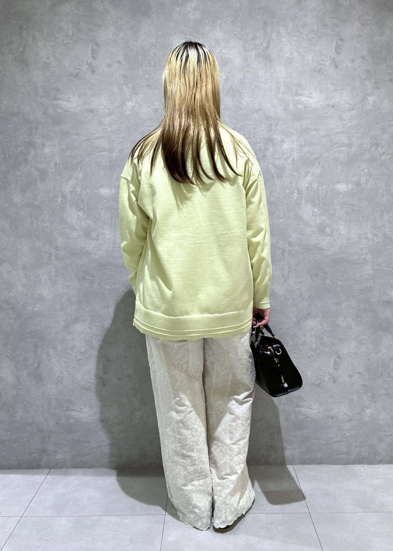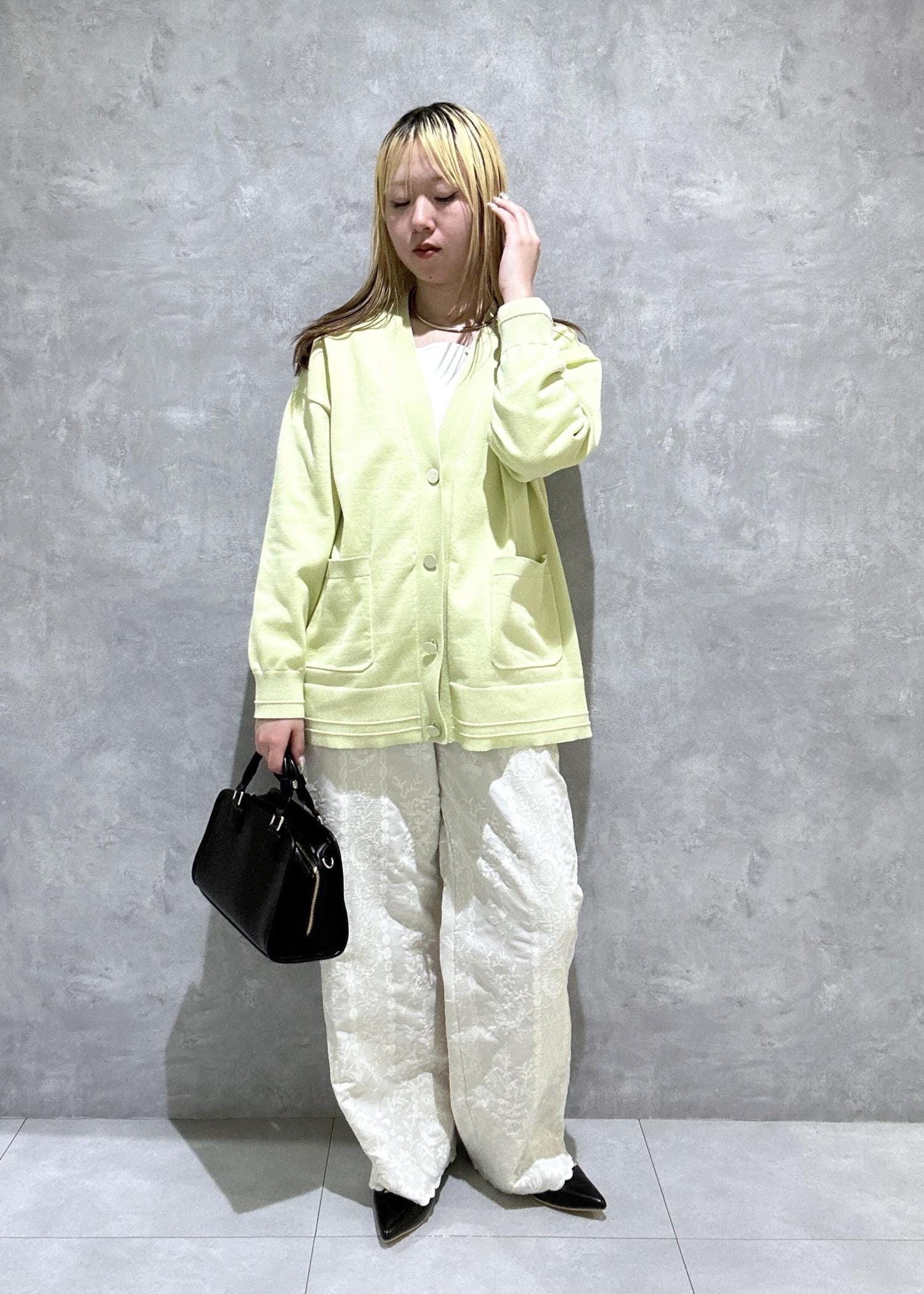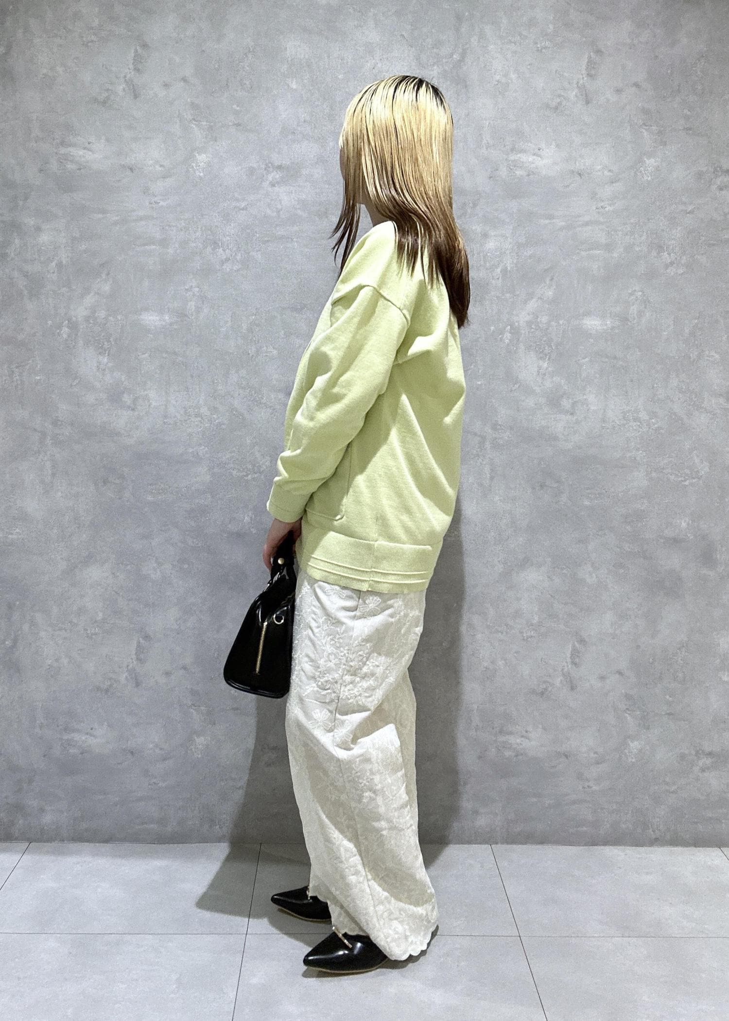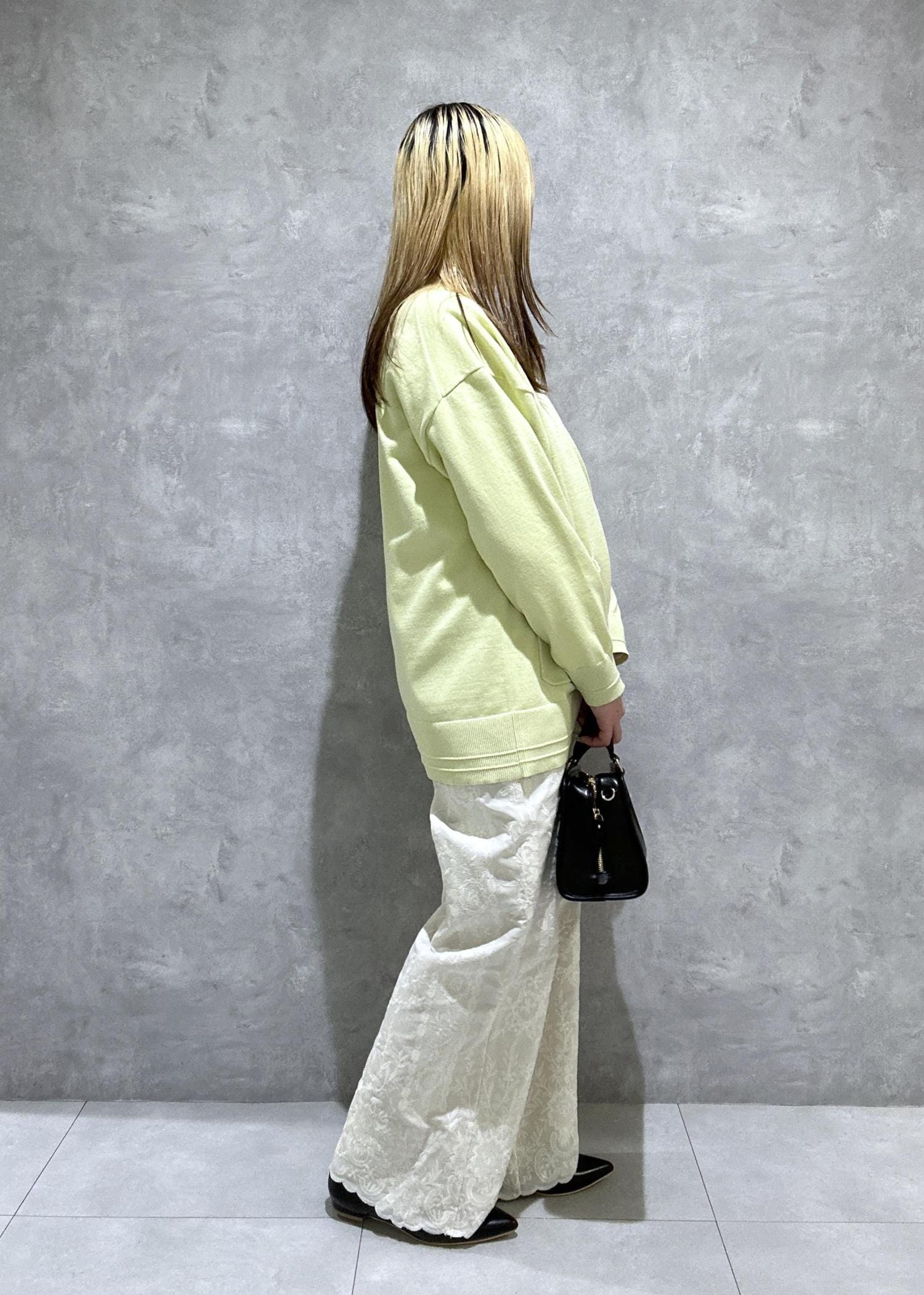 刺繍のパンツとと柔らかい黄色を合わせた春コーデ。