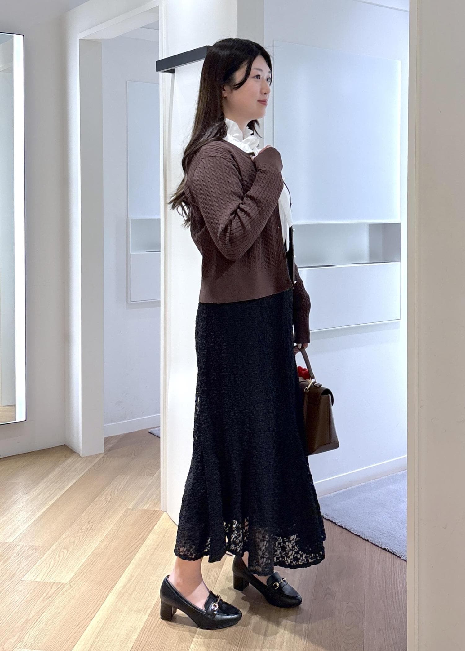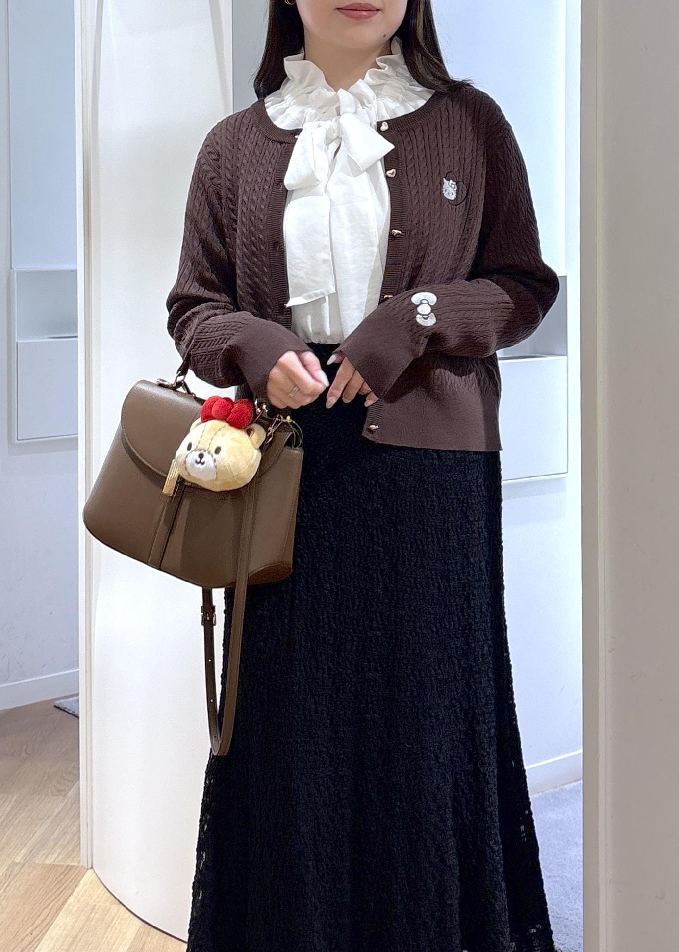 ハローキティのワンポイントが可愛いカーディガンを、フリルブラウスやレーススカートで上品にまとめました◎