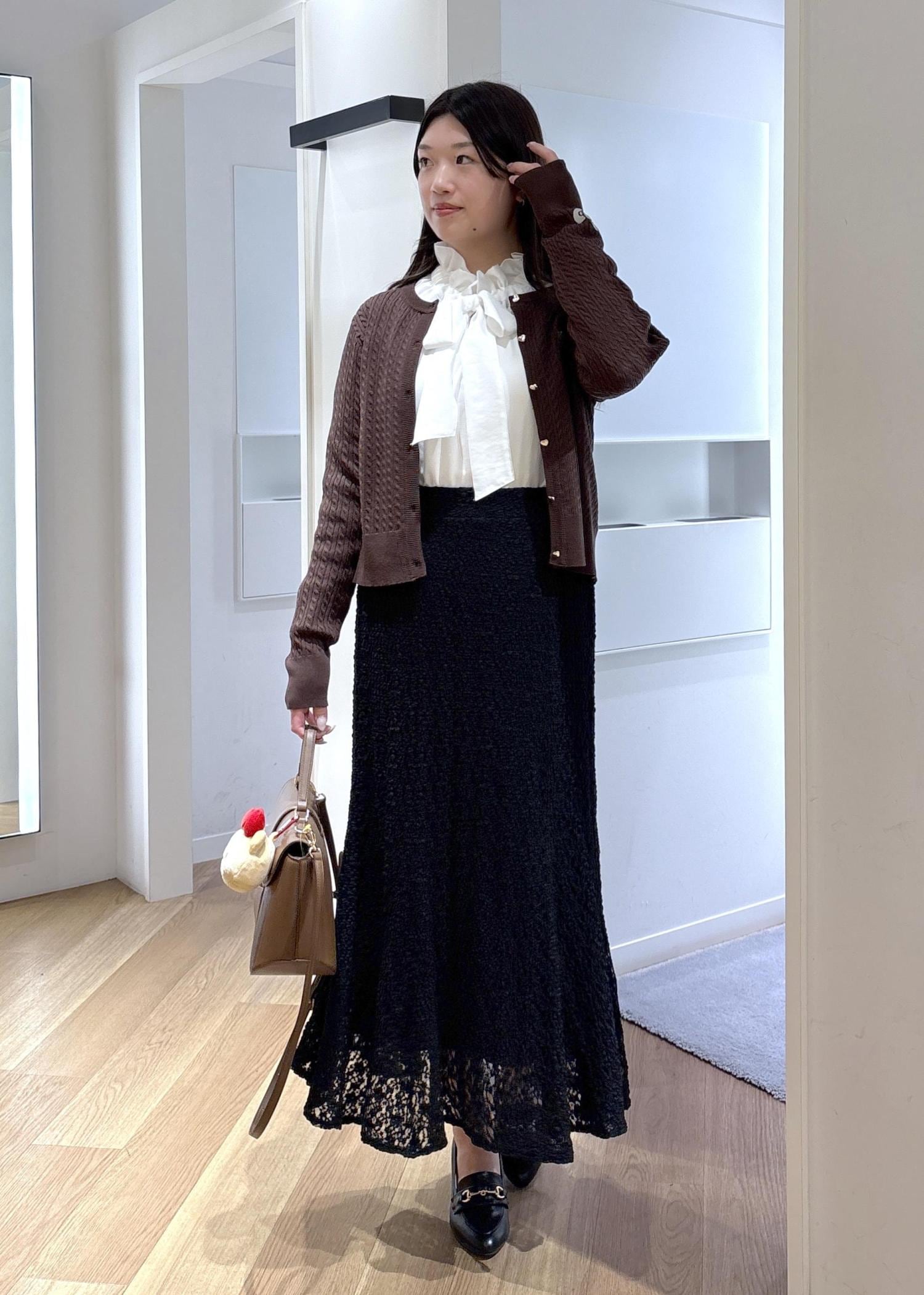 首周りのフリルやリボンが華やかで、ジャケットやカーディガン、ジレのレイヤードに使いやすいです。