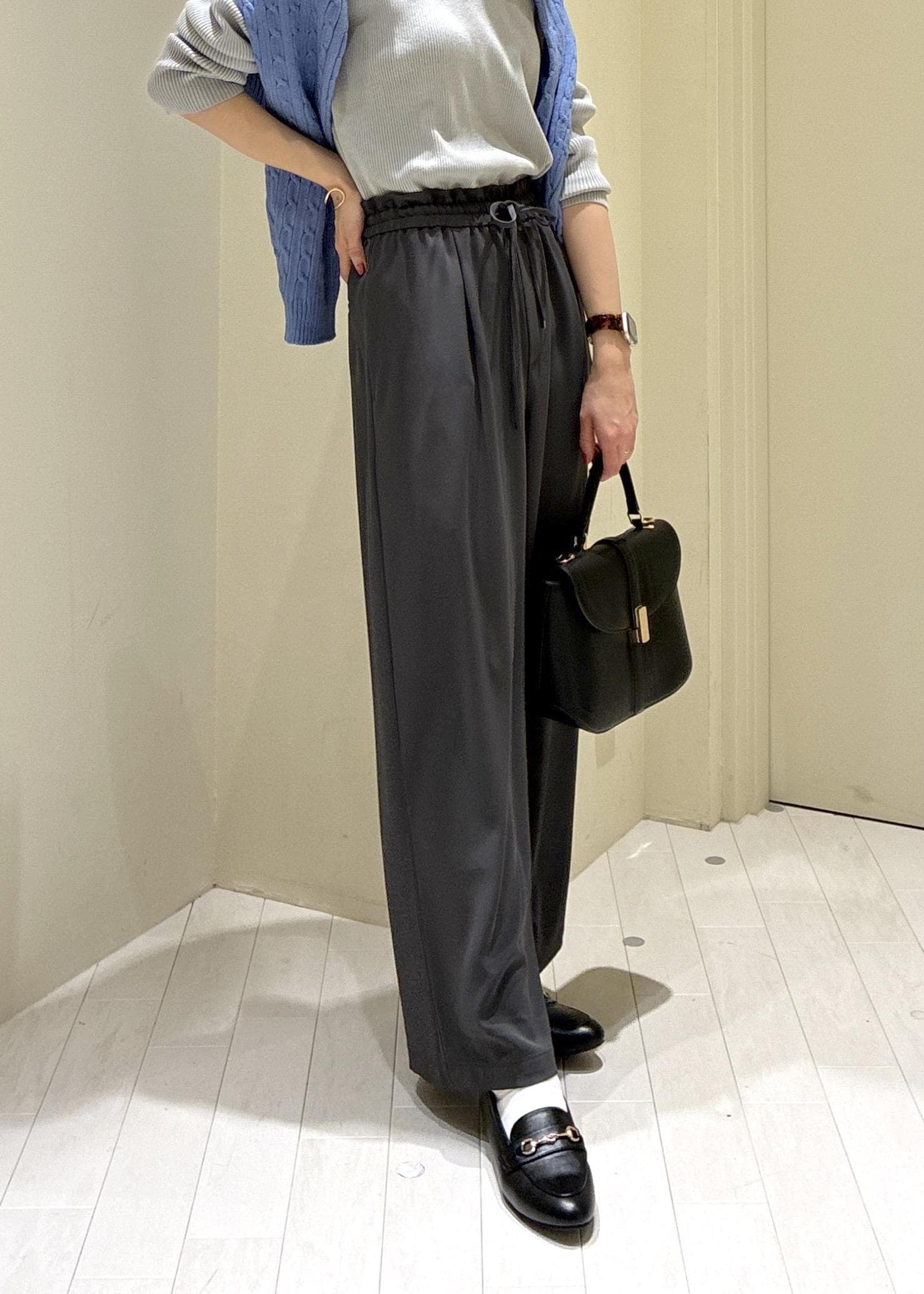 ROPÉ PICNICステファニージョグイージーワイドパンツチャコール / L¥5,489レビューウエスト総ゴムでゆったりリラックスした着用感ですが、なめらかで落ち感ある素材がきちんと見えします。ウエストゴムでギャザーがよりますが、ウエスト周りはボリュームが出過ぎずスッキリ見えます。