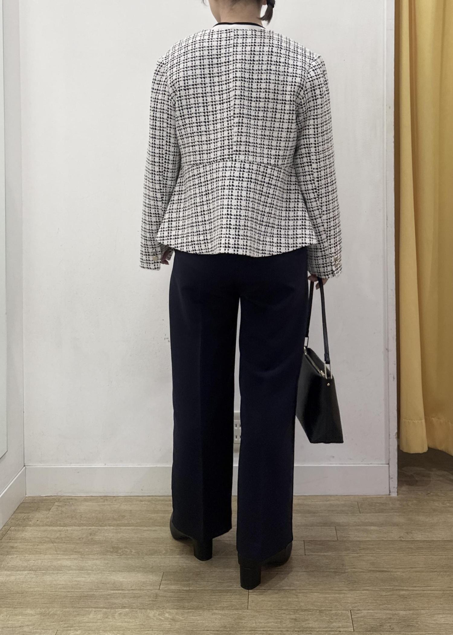 腰が隠れるぐらいの着丈で、広がりすぎないペプラムシルエットのデザインです。