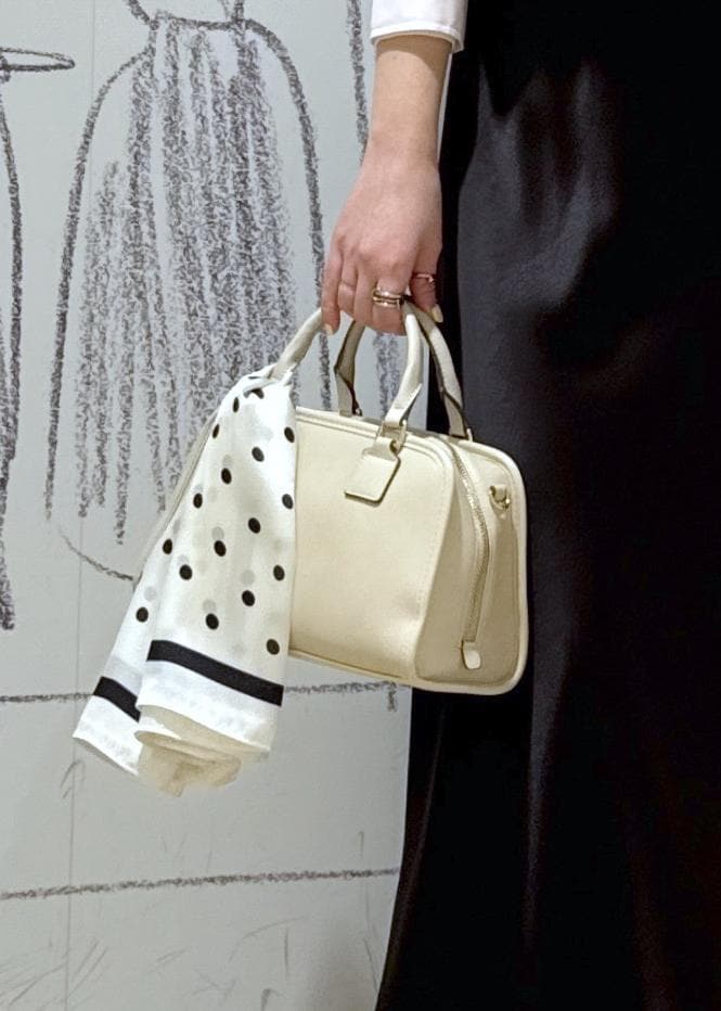 きちんと見えも叶うベーシックなバッグ。財布、ポーチ、手帳、ハンドタオル、ミニ傘、ミニボトルなども入る収納力。ショルダーストラップ付きで手が空くのも嬉しいポイント。