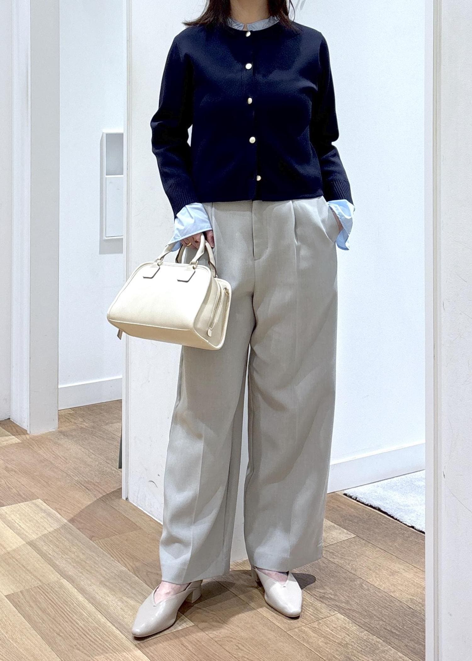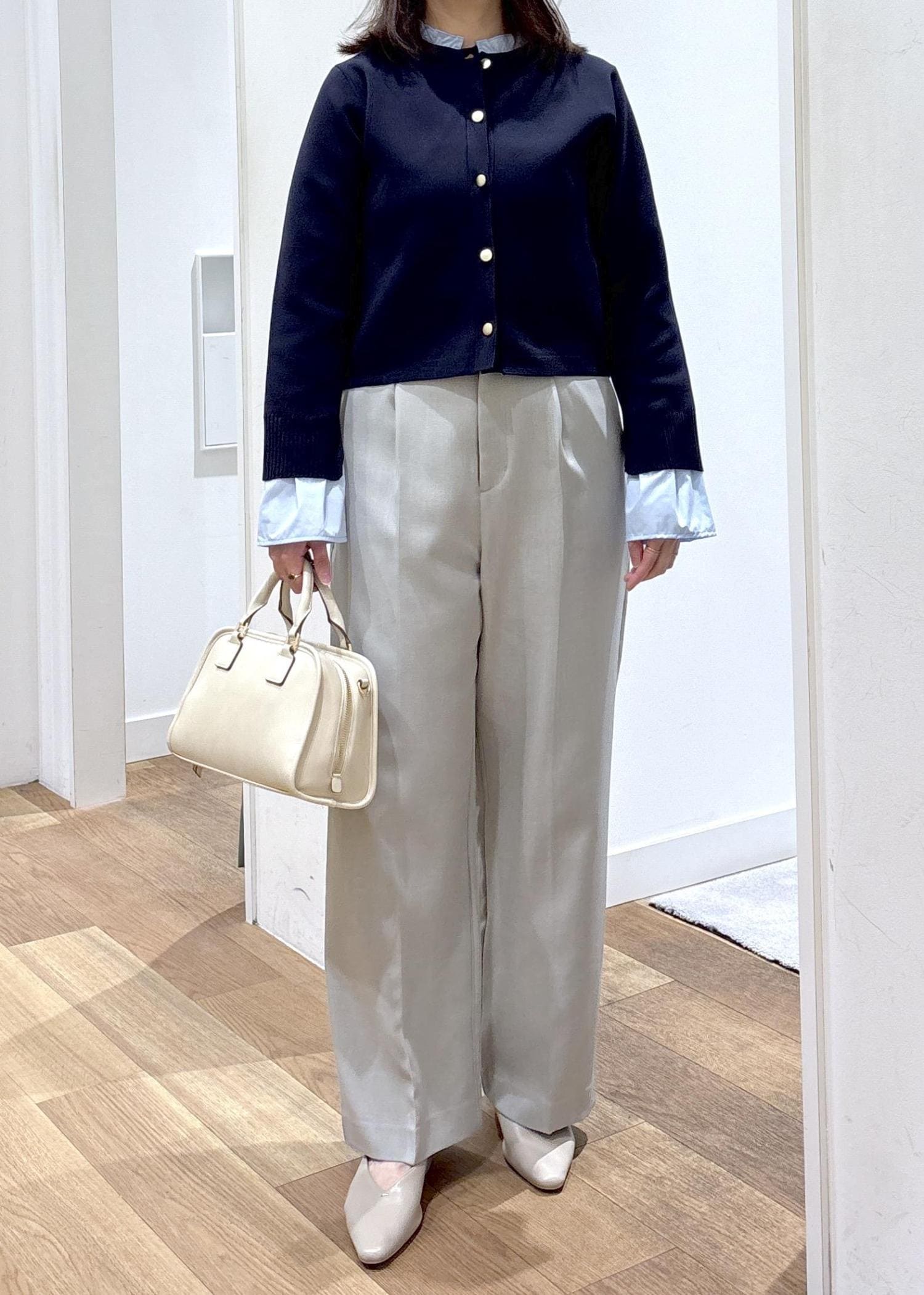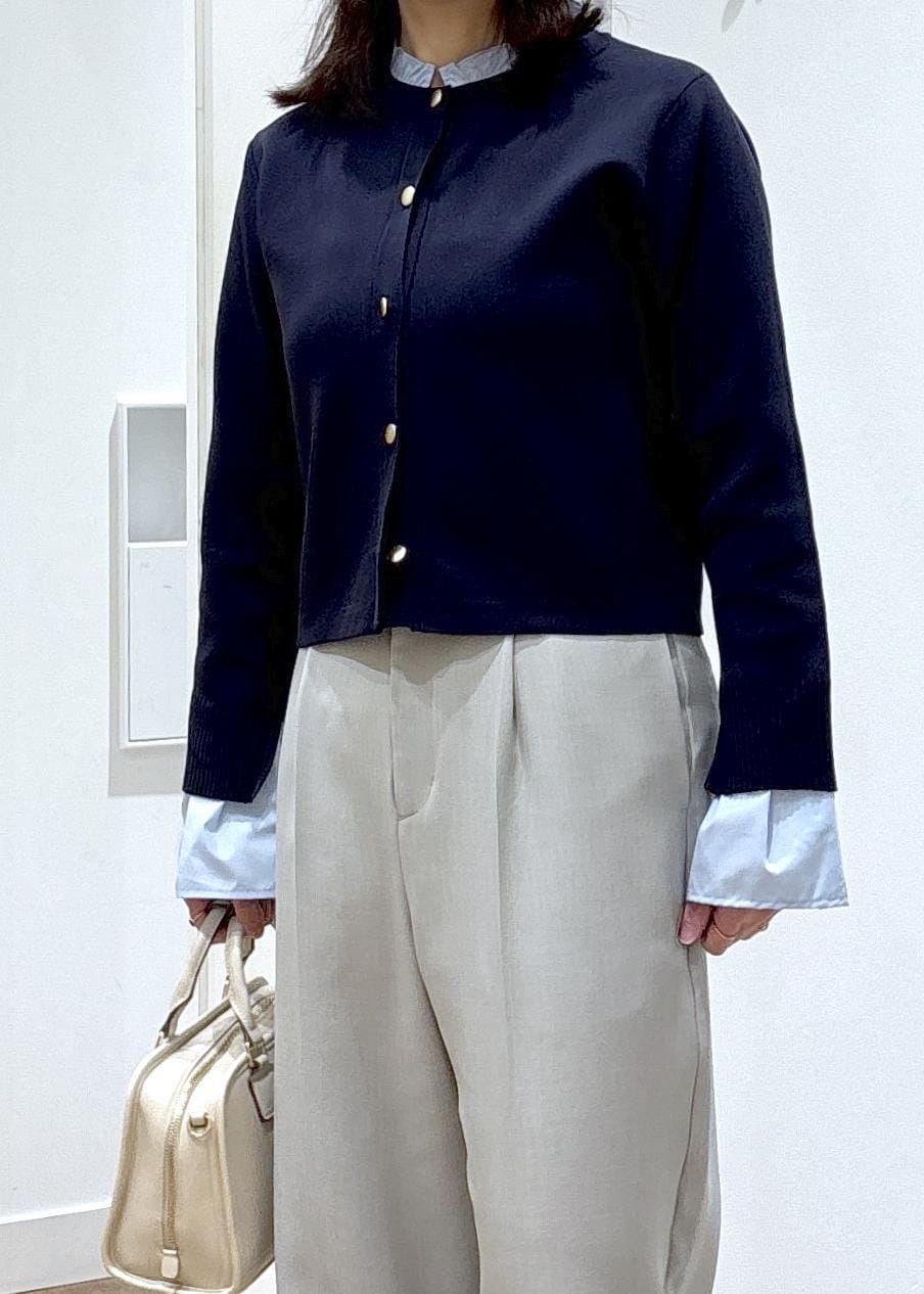 ROPÉ PICNIC襟フリルドッキングカーディガンネイビー / F¥5,995レビュー1枚でレイヤード風に見せてくれるデザインなので、インナーにシャツを重ねた時のごわつきがなく着心地◎です。