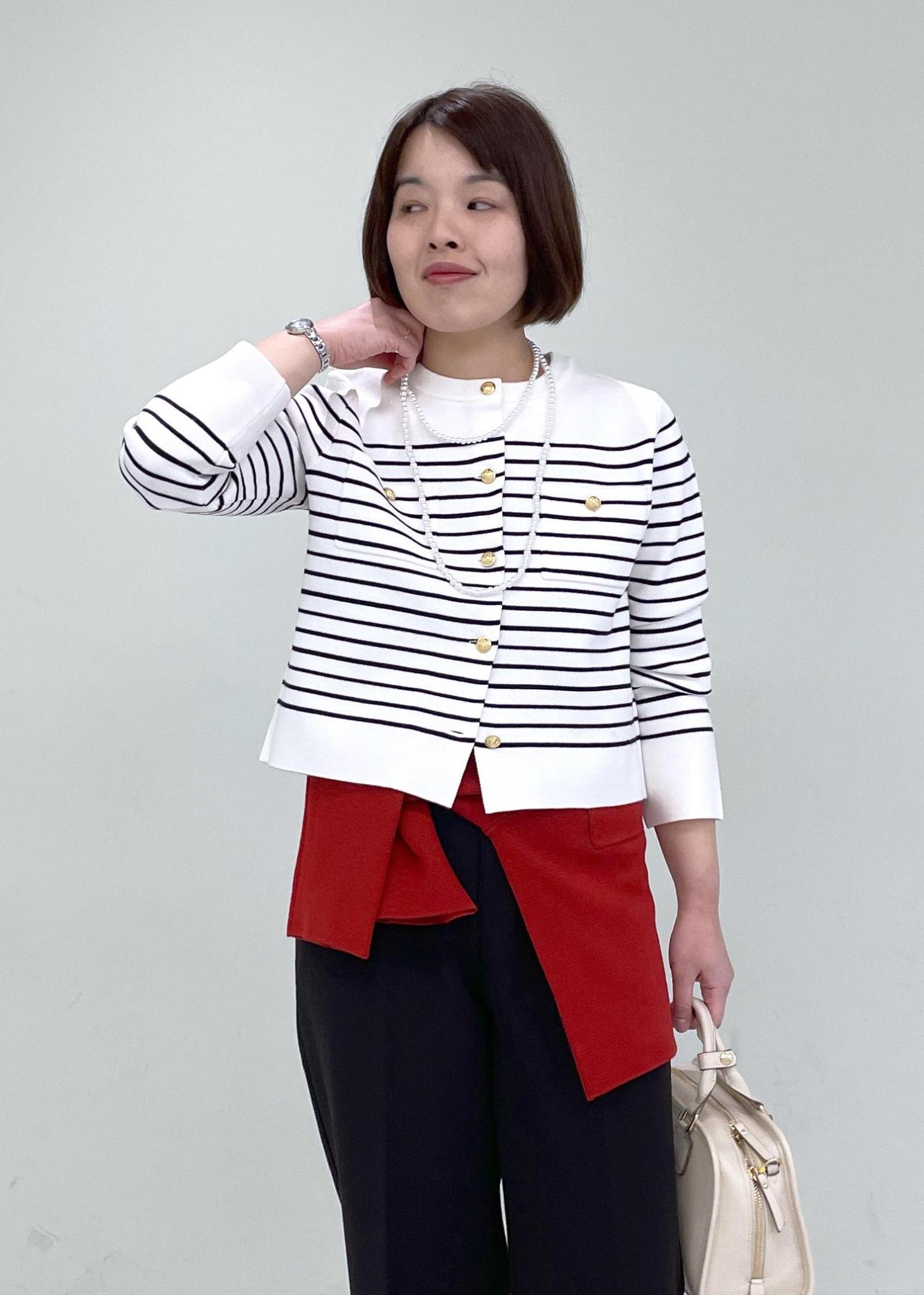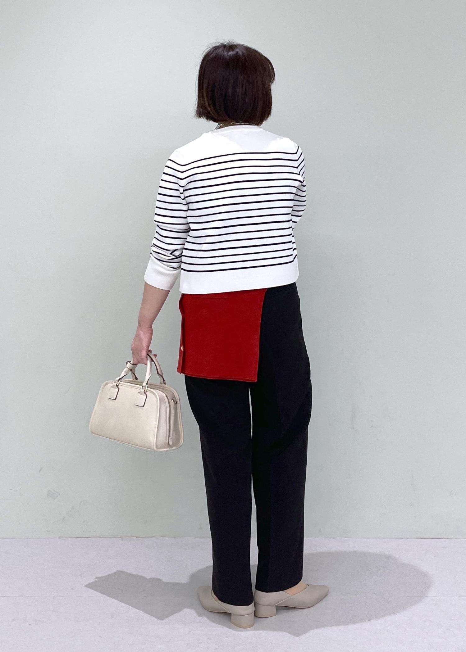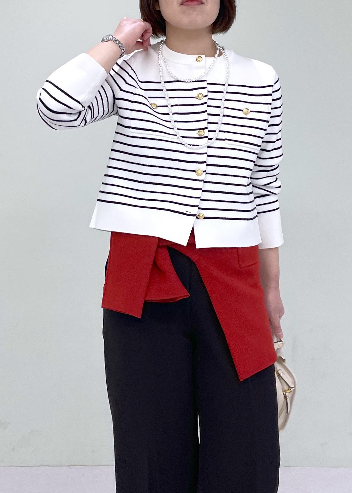 ボーダーのカーディガンにワイドパンツを合わせたコーデに、赤のカーディガンを腰巻きしたトレンドカジュアルコーデです!