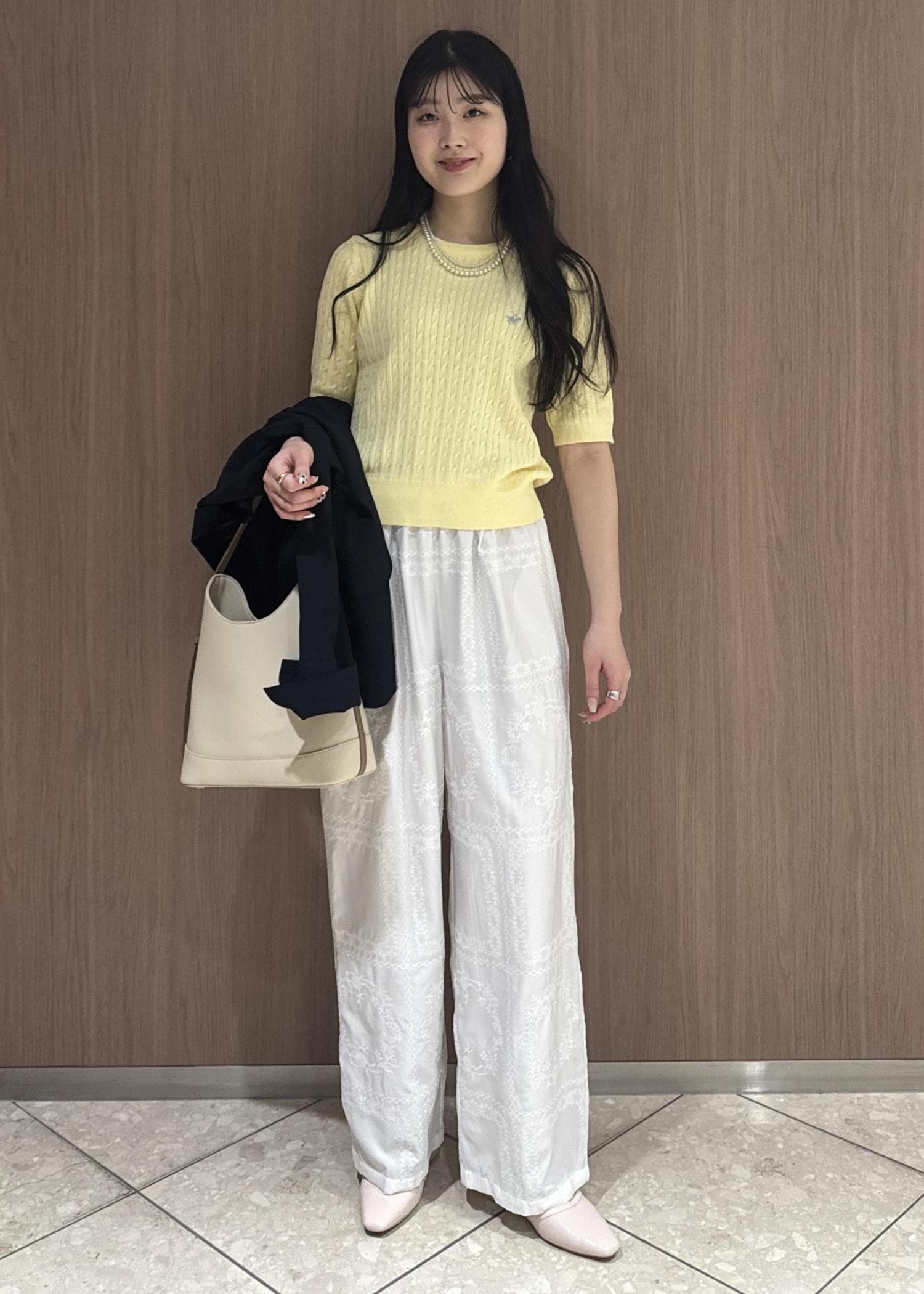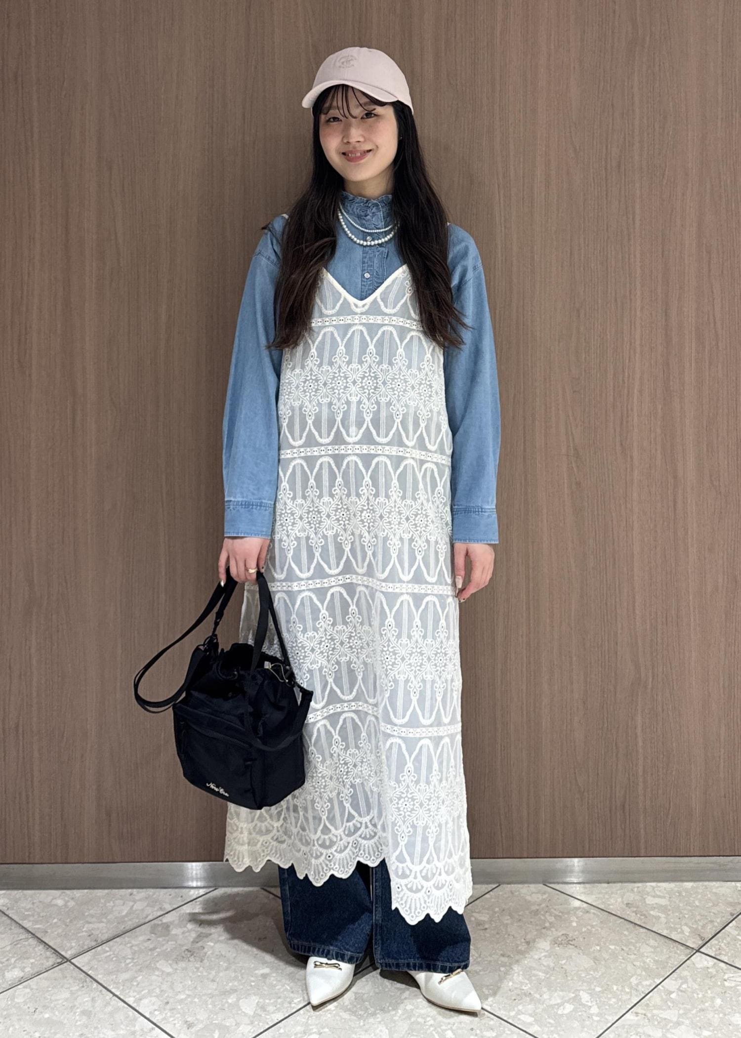 ロペピクニックで大人気のセットアップです。ストレッチがとても効いているので動きやすさは抜群です。シンプルなスタイルなので、ネックレスで顔まわりは華やかにしてみました。靴のリボンがゴールドでしたのでネックレスもゴールド合わせにして統一感を出しました。