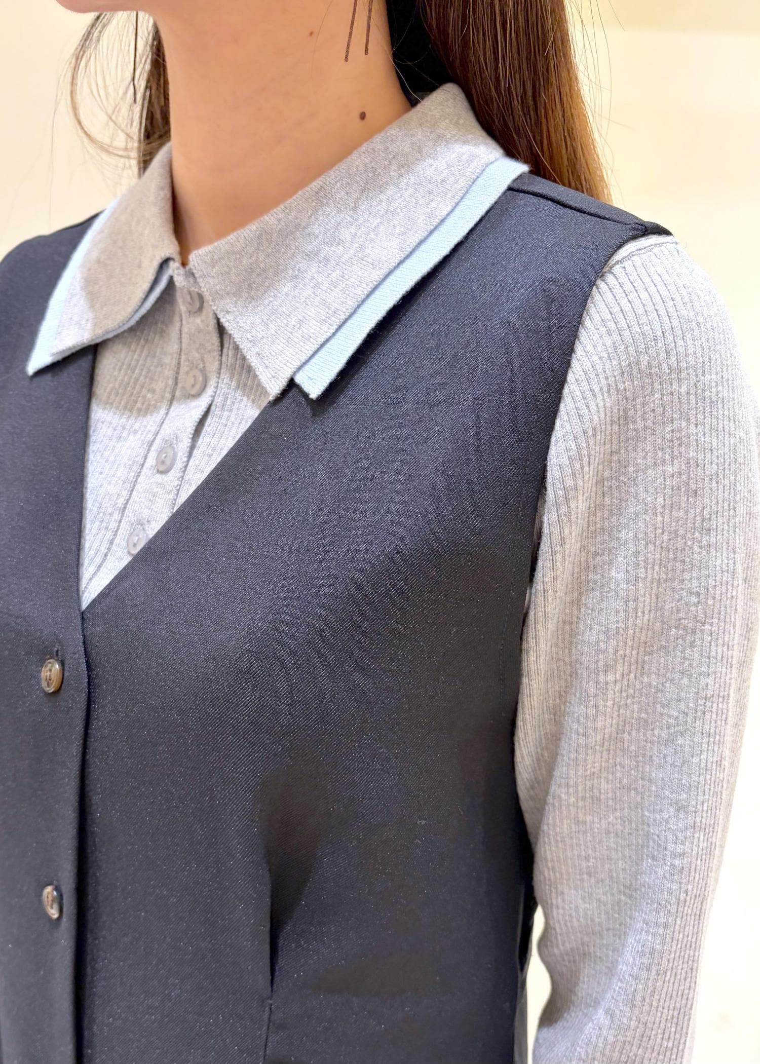 スッキリシルエットなのでジャケットのインナーにも使いやすいデザインです。 -
