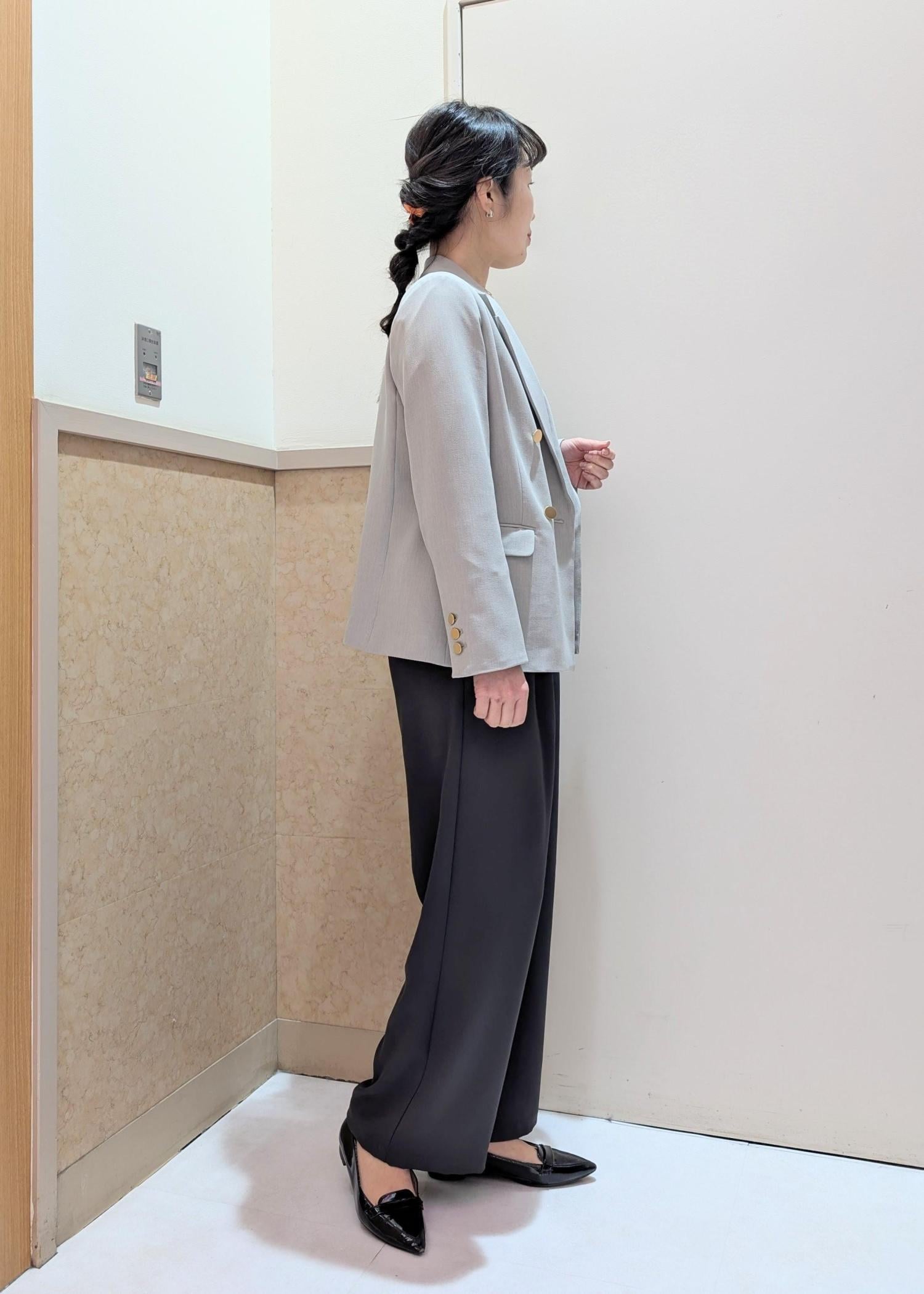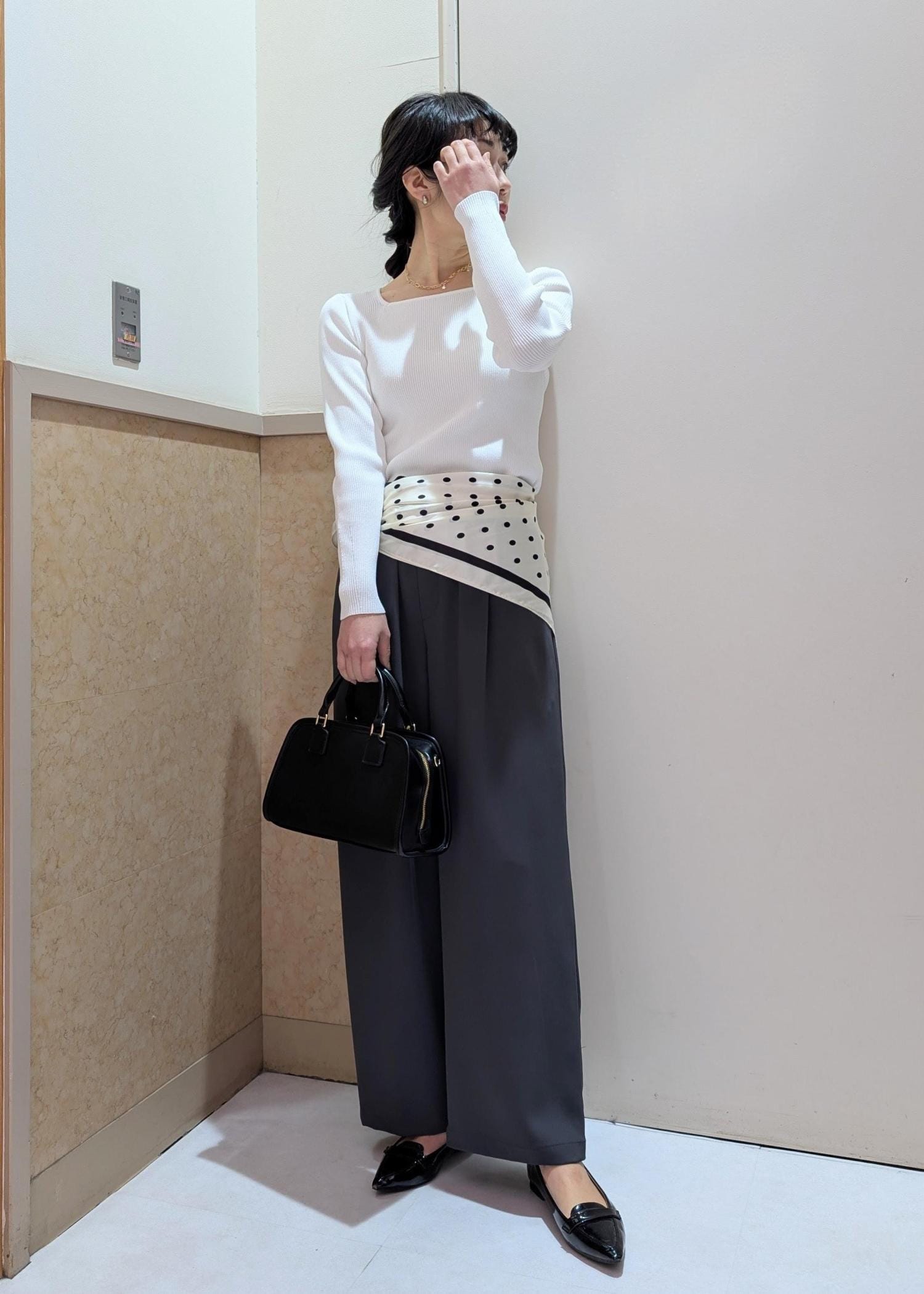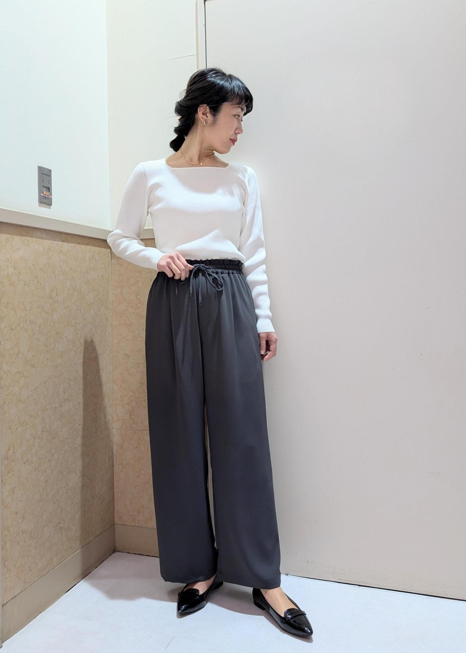 パンツはリラックス感あるワイドパンツ。トップスをデコルテが開いたニットにして力が抜けつつもキレイめな雰囲気のコーディネートにしました(^^)