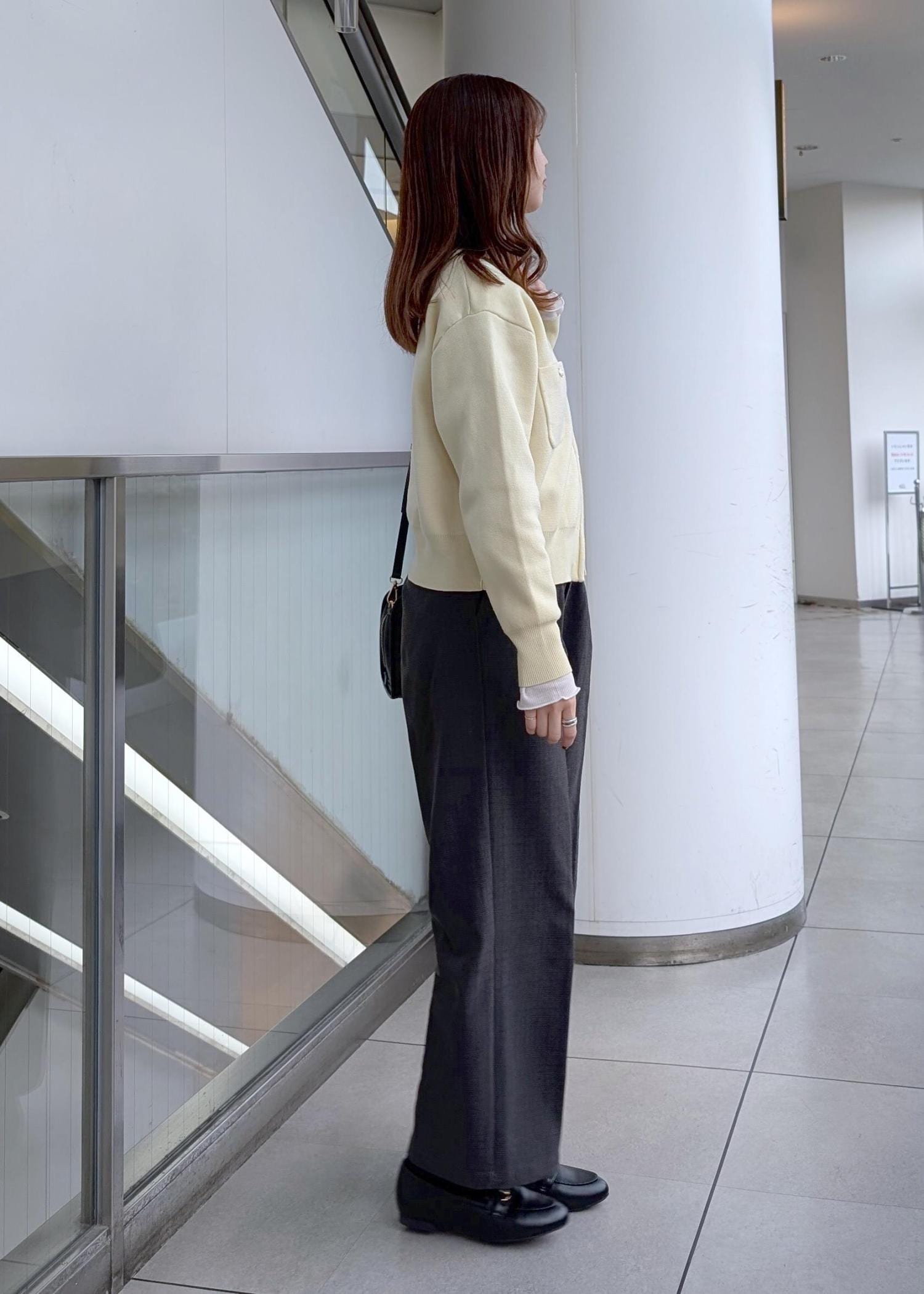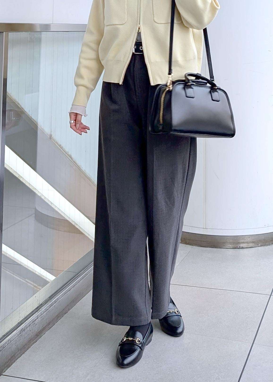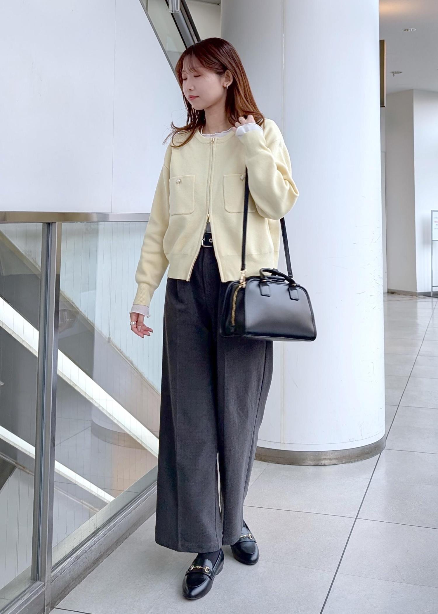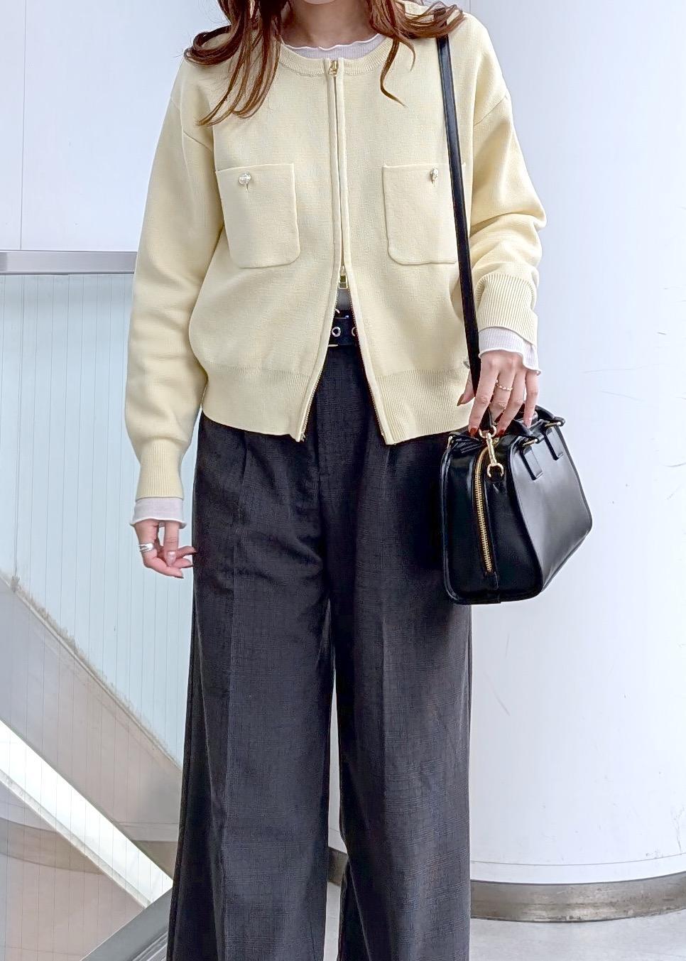 トップスのカーディガンはダブルジップのため、スタイルに合わせて開け具合を調節可能。今回はセミワイドパンツと合わせたため腰回りが重くならないように少し開けて着用しました。