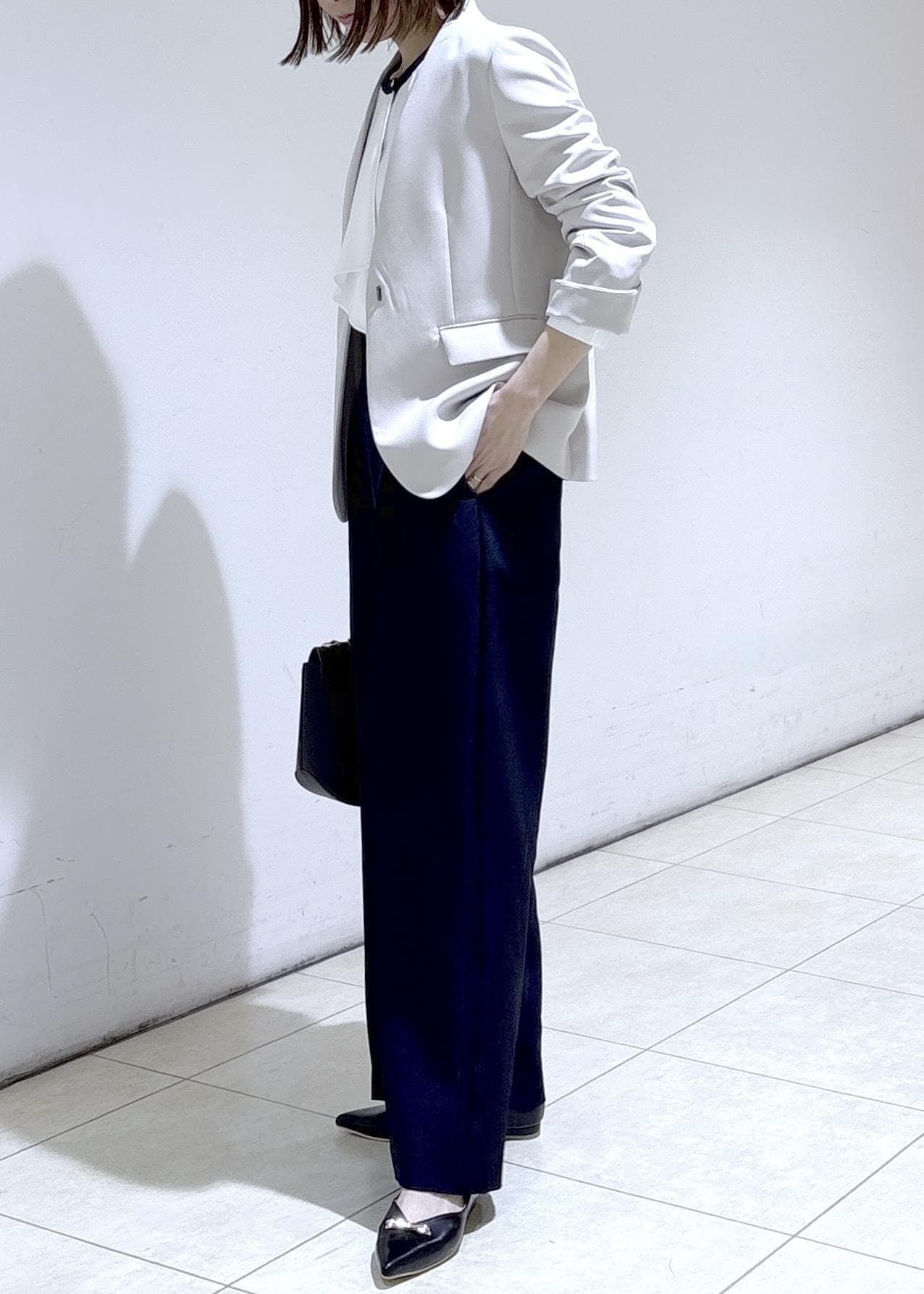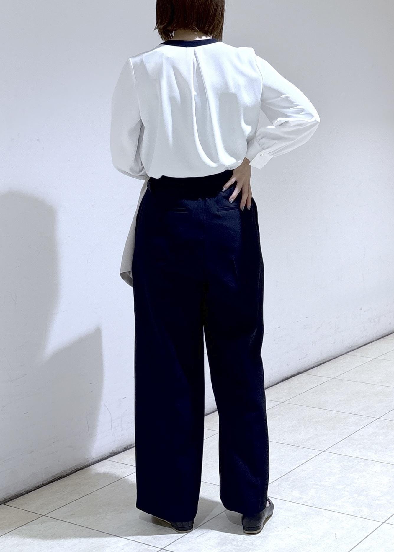ネイビーのワイドパンツを合わせて