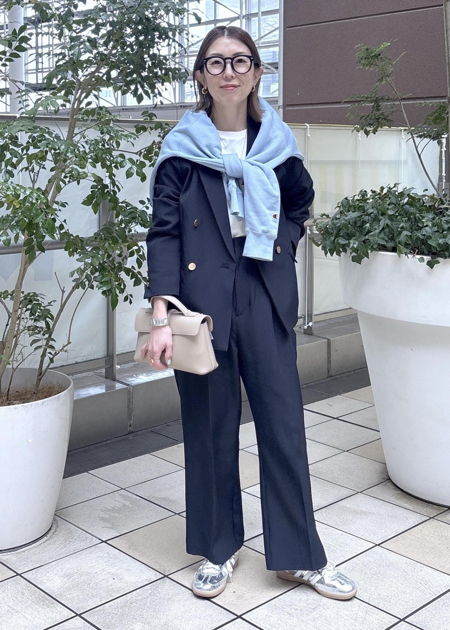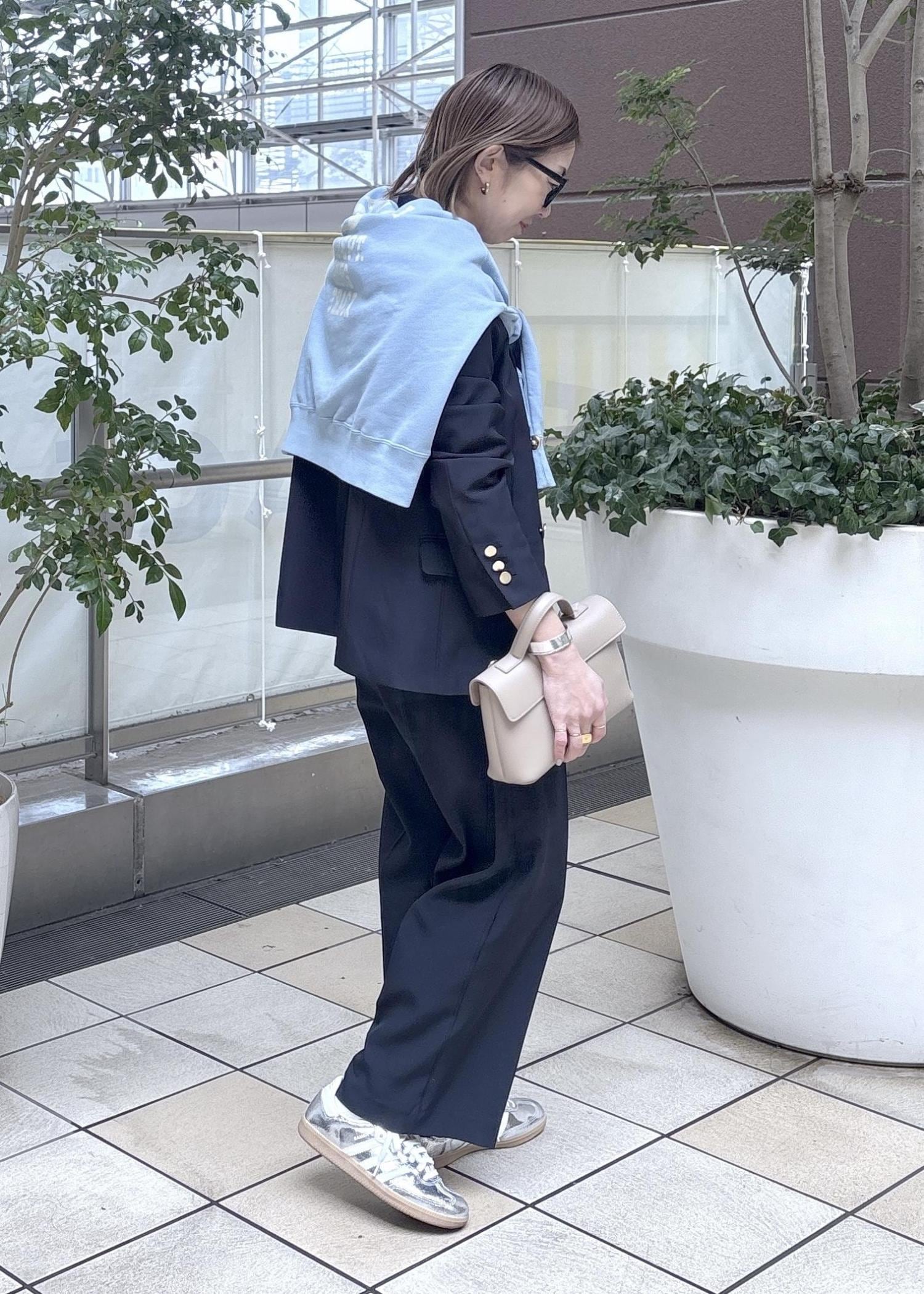 ネイビーのセットアップにスエットを肩がけした大人カジュアルスタイリング。