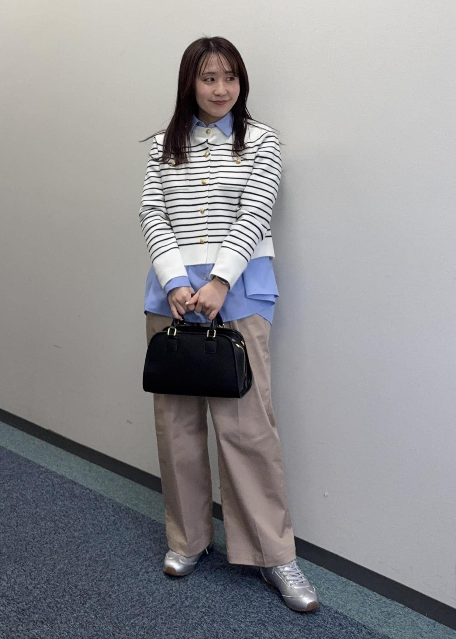 鮮やかなブルーシャツに人気のミラノリブカーディガンを合わせた綺麗めカジュアルコーデ。