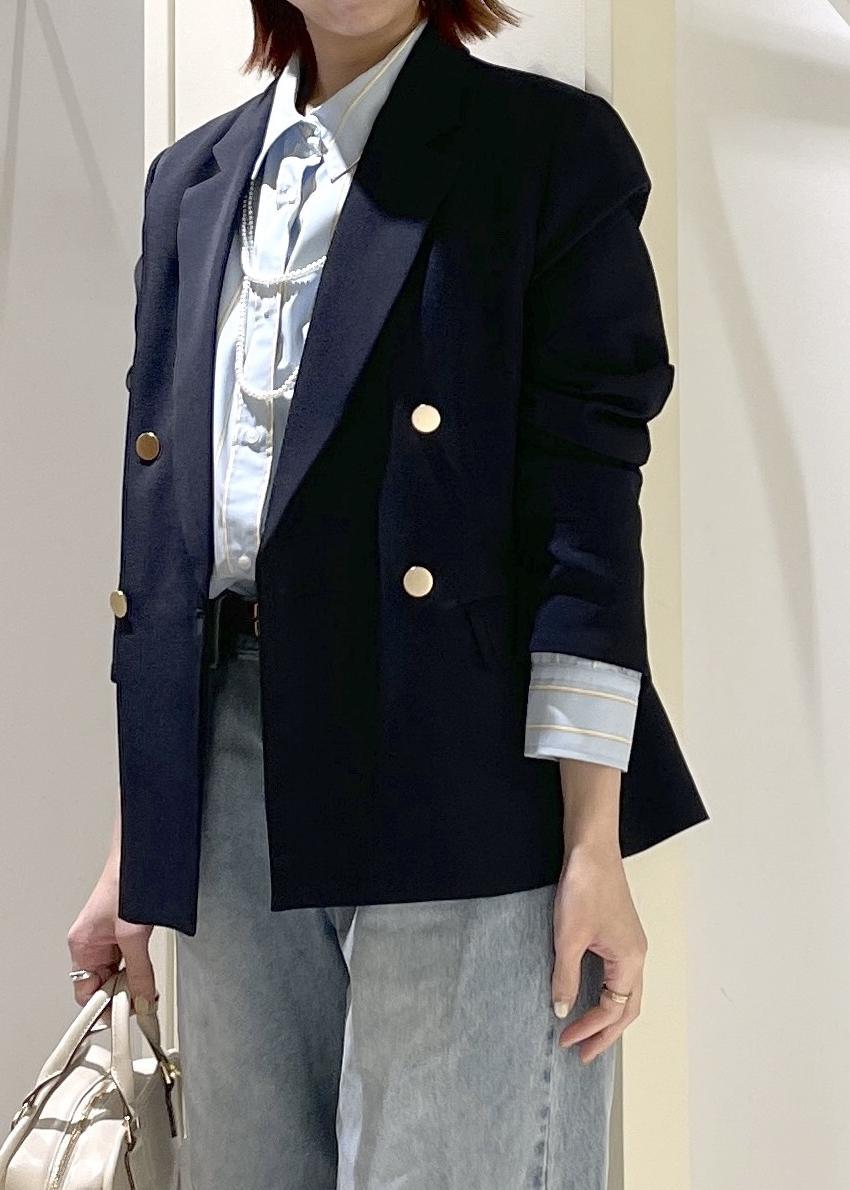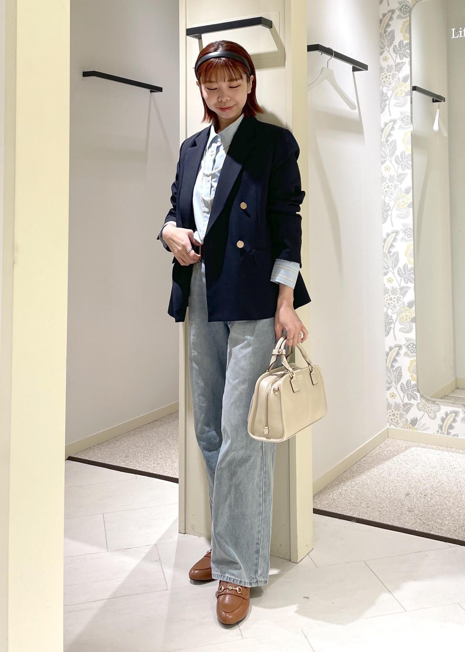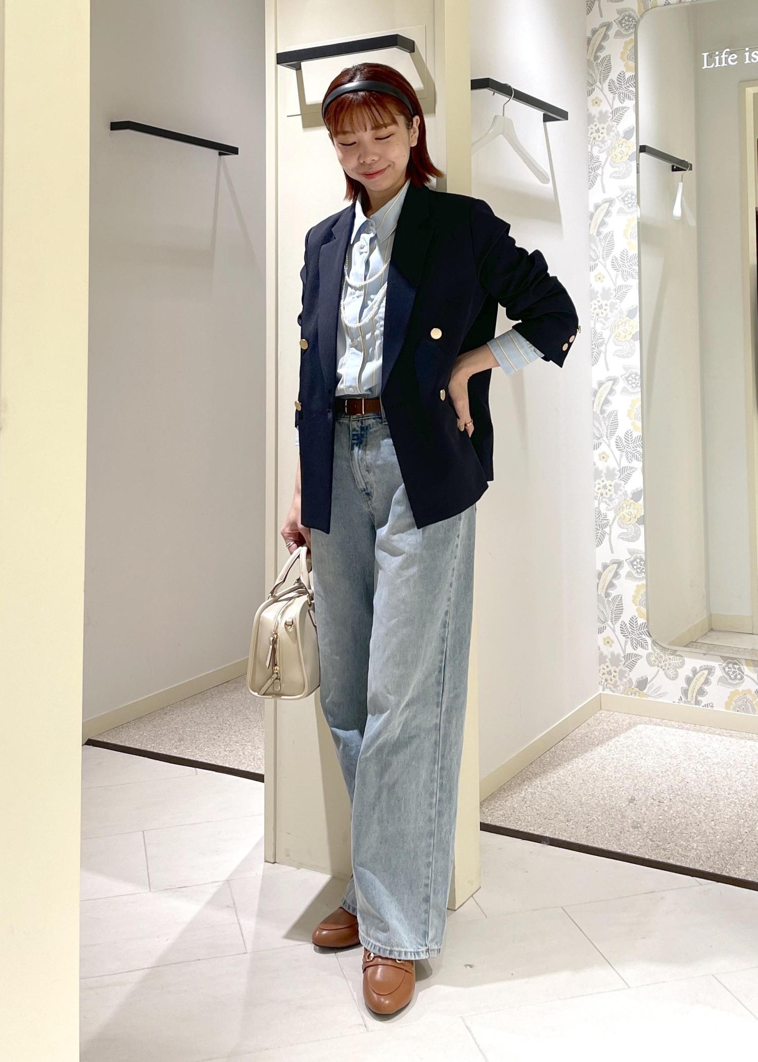 春らしい配色のストライプシャツにジャケットを合わせたキレイめコーデにデニムでカジュアルダウン!