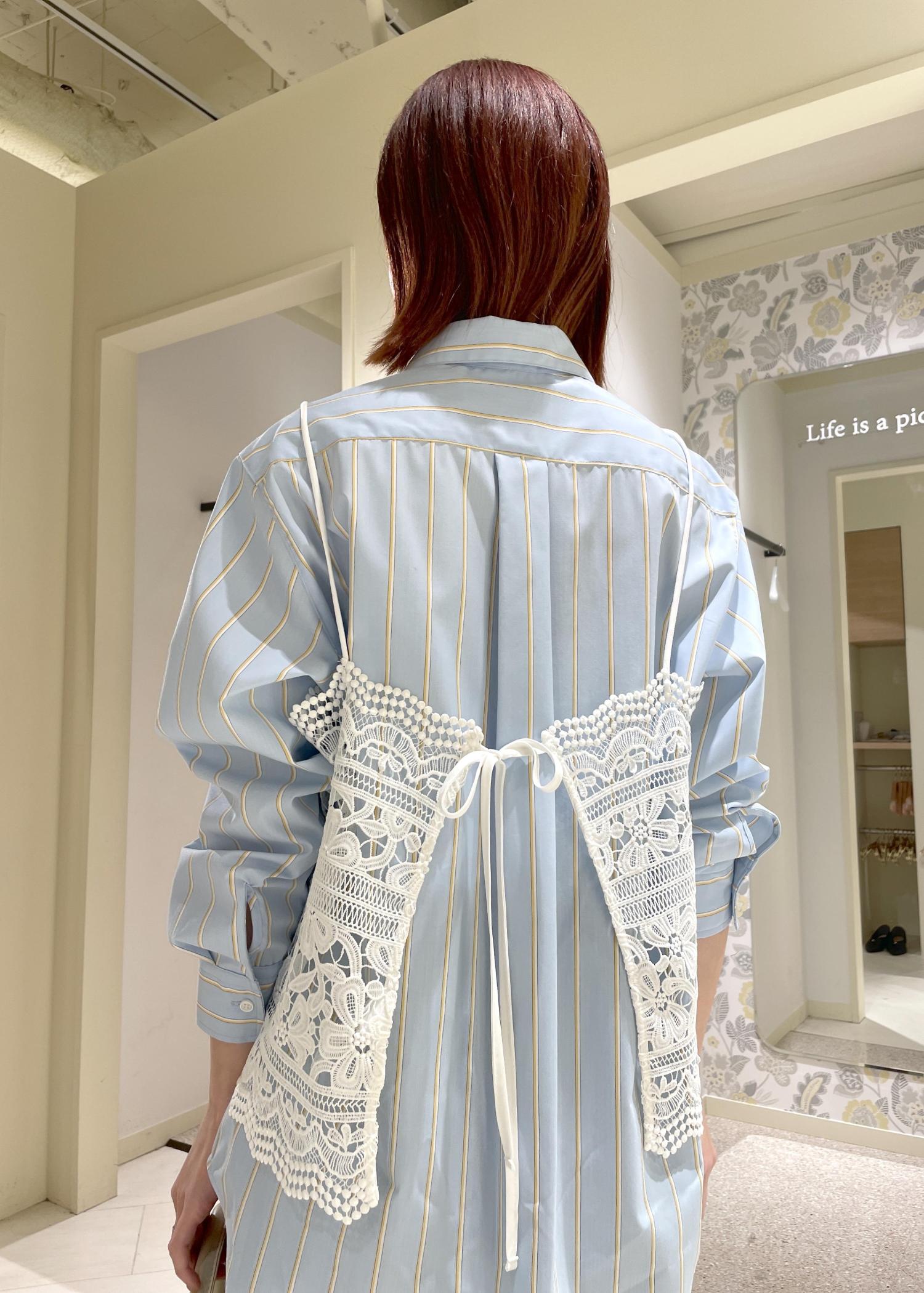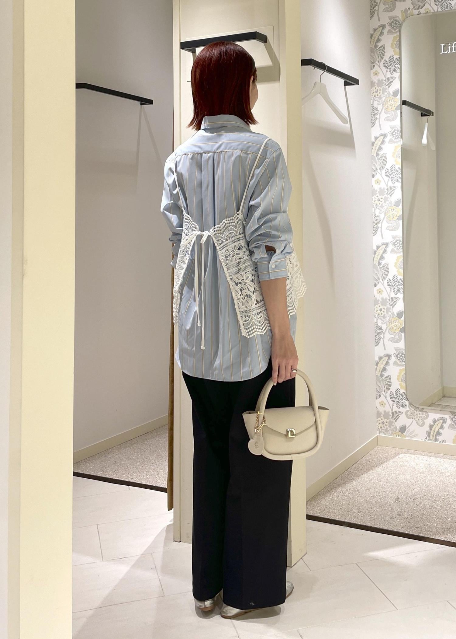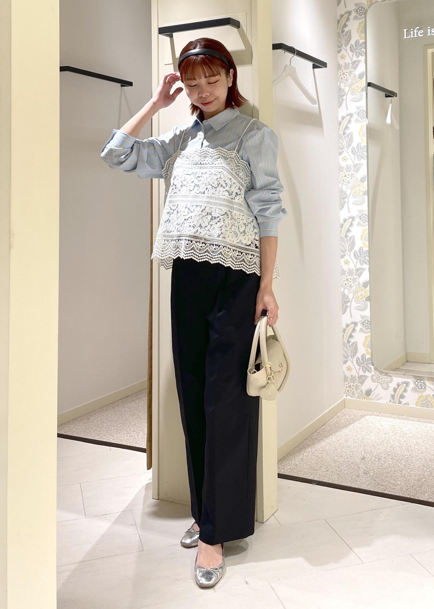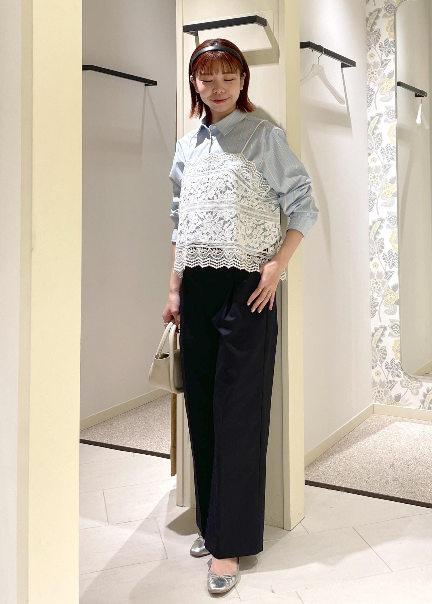 ハリのあるメンズライクなシャツなので、レースキャミ合わせで女性らしく、春らしい軽やかな印象でまとめてみました。
