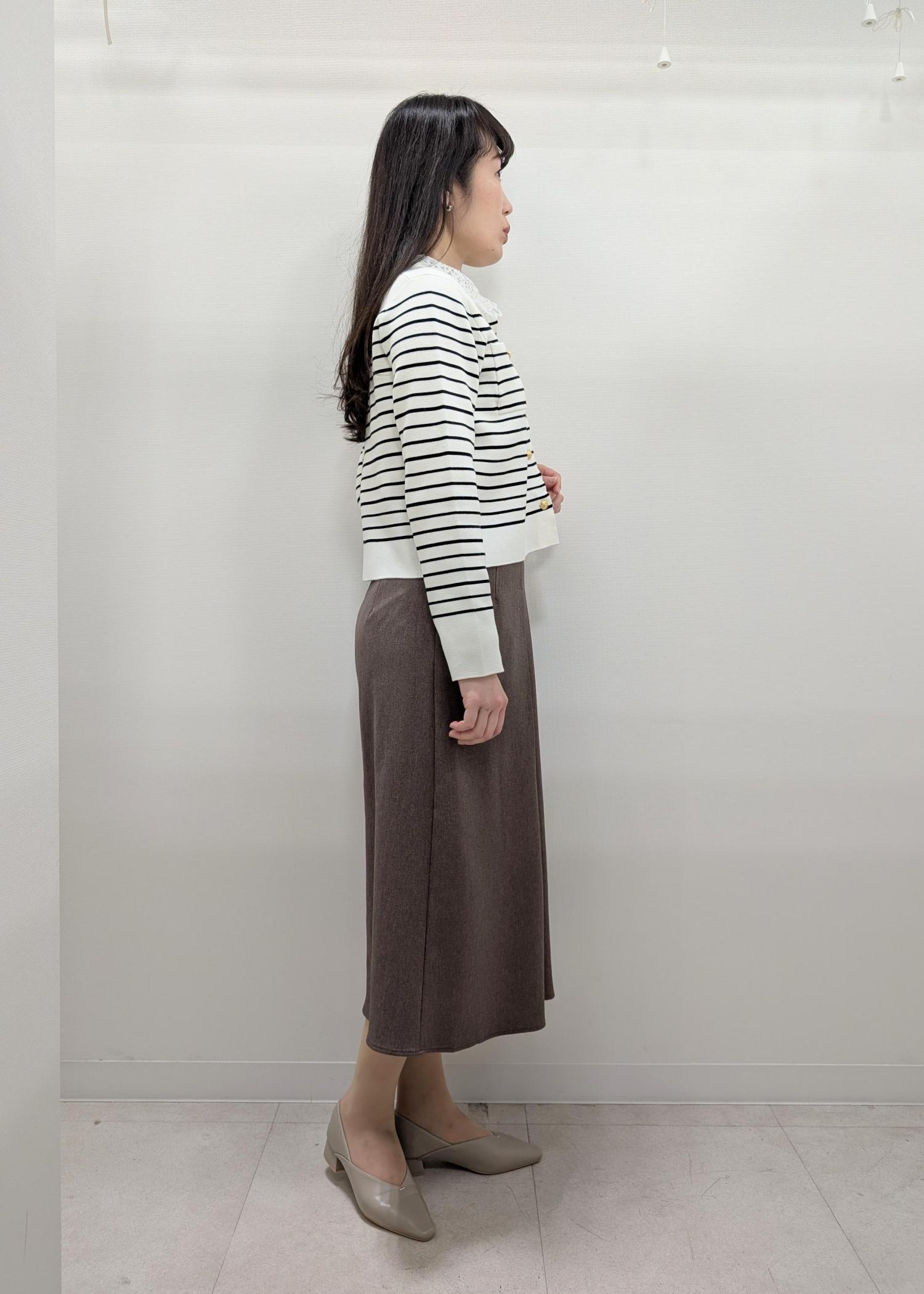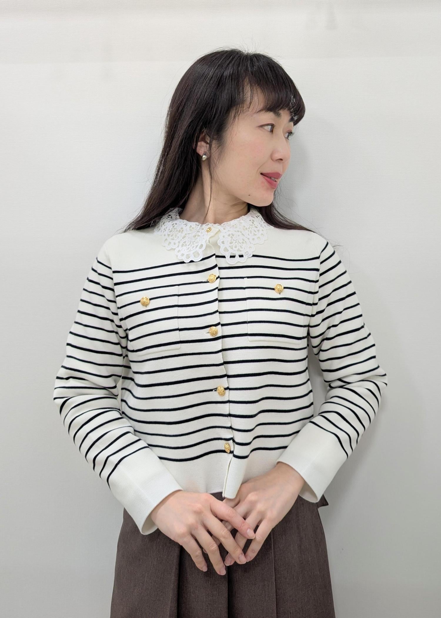 一枚でもサマになるジャケット風カーディガンですが、トレンドのレース襟ニットをインナーにして、鮮度あるキレイめコーデにしました(^^)