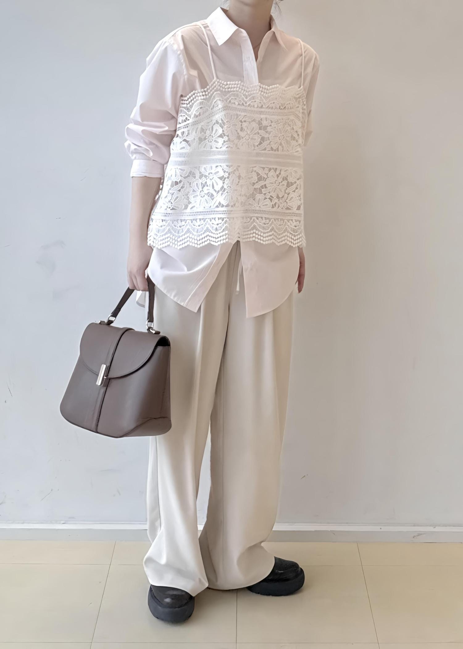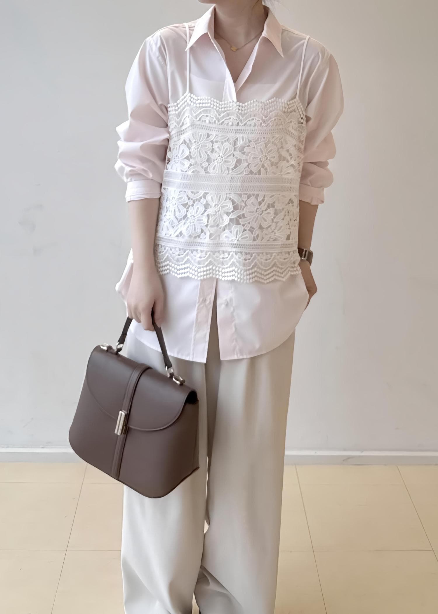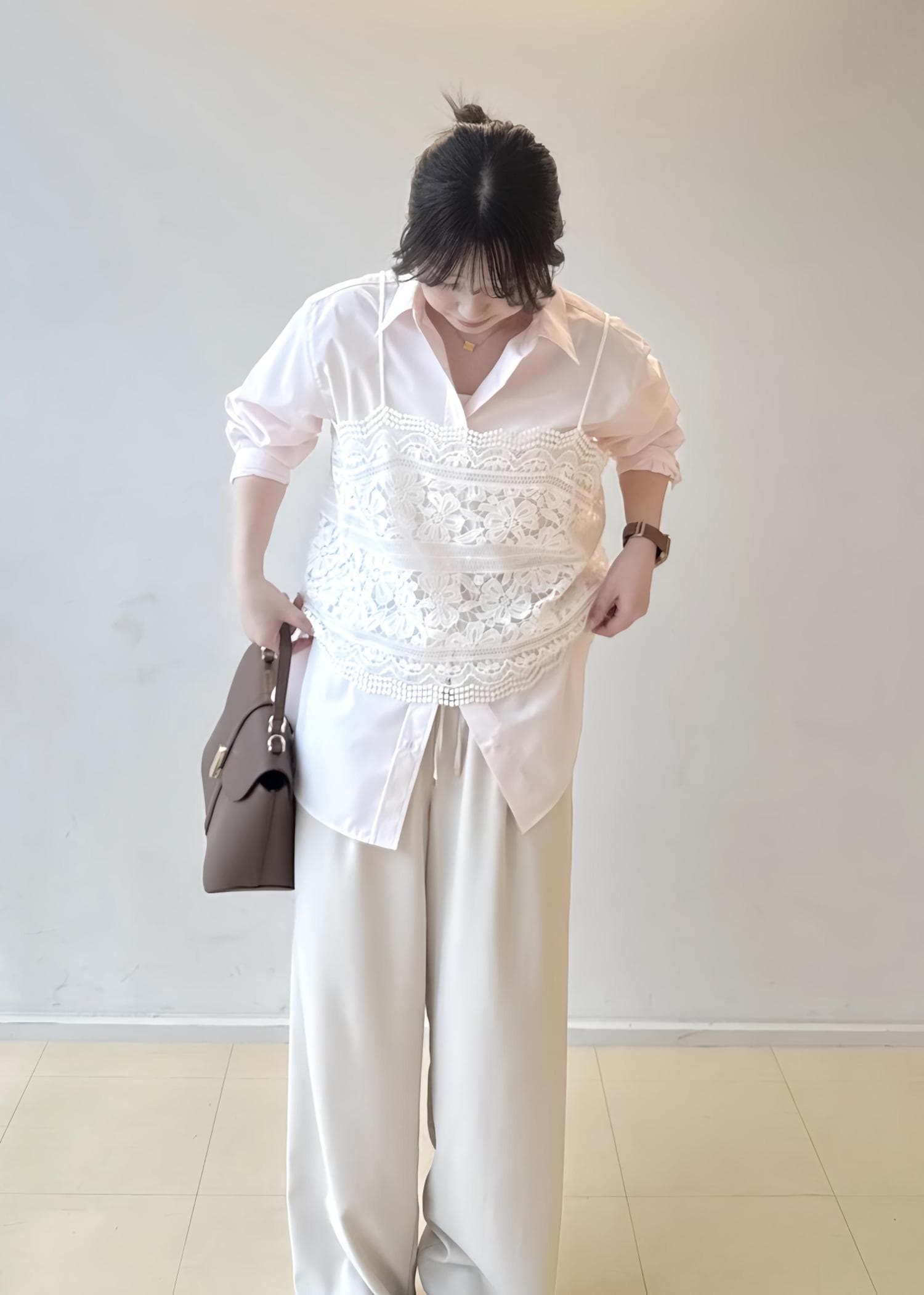 ピンクのカラーシャツをメインに他はホワイトでまとめたコーデにもです!シンプルなコーデにもビスチェを取り入れ簡単にレイヤードに挑戦できます!