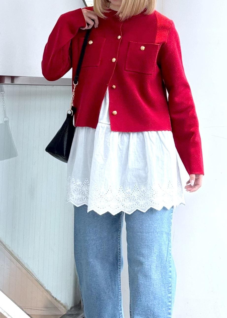 2BUY10%OFFROPÉ PICNICミラノリブ金ボタンニットカーディガンレッド / M¥5,489レビューMサイズで骨盤の上くらいの丈感でした。