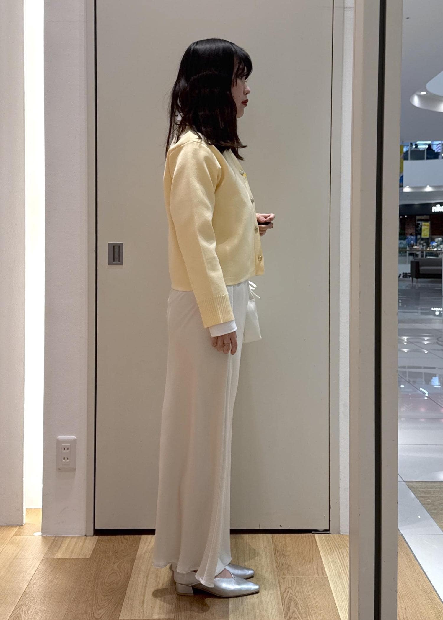 イエローのカーディガンを主役にしたフェミニンコーデ。