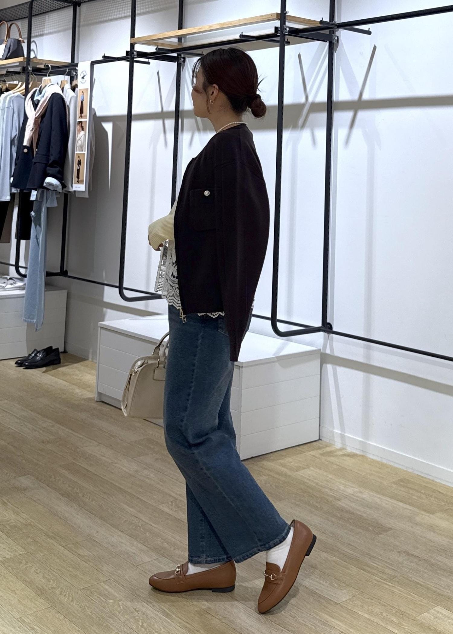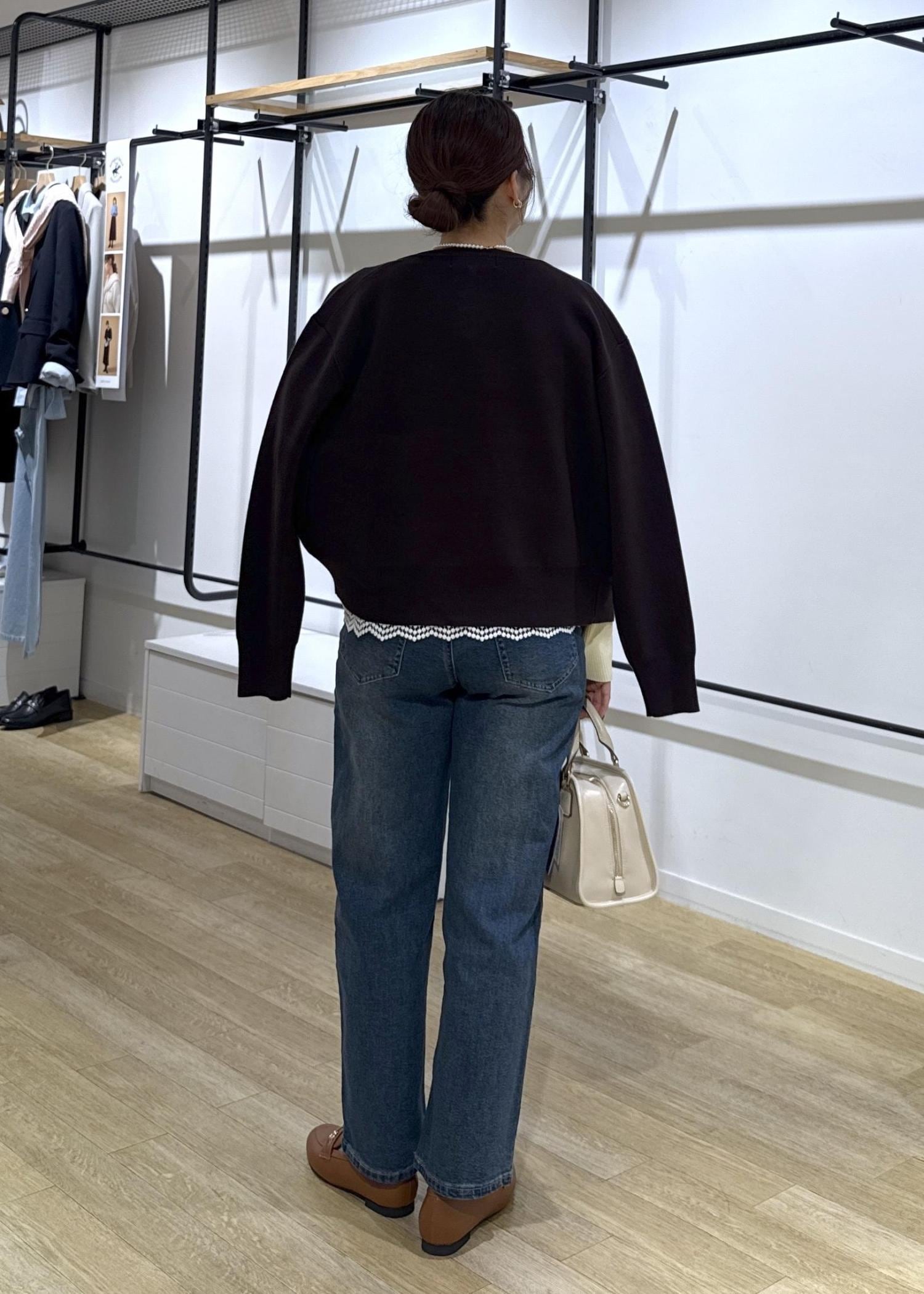 カーディガンのカラーをブラウンにすることで