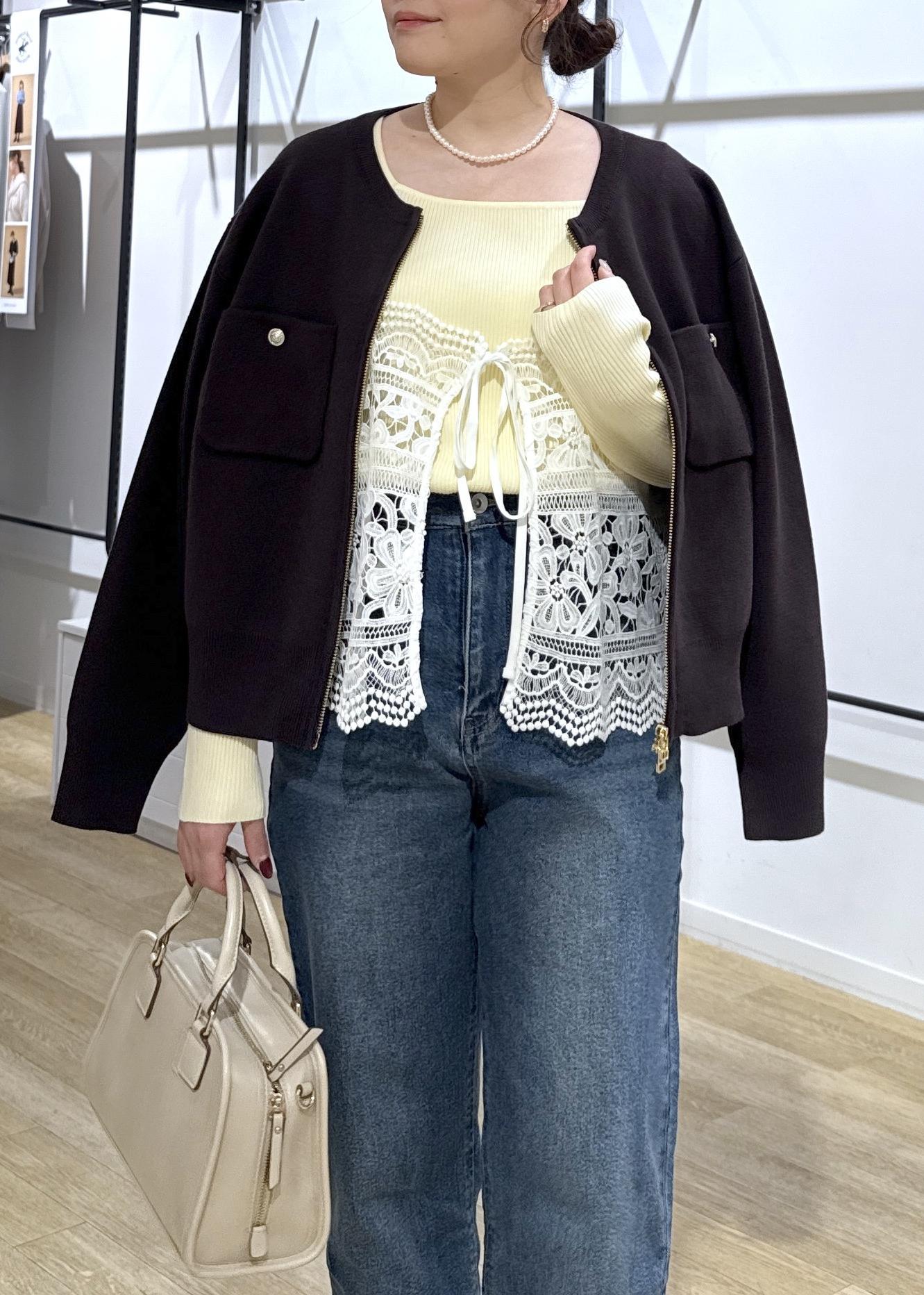 ROPÉ PICNICミラノリブダブルジップニットカーディガンダークブラウン / F¥6,490レビュー着丈は腰丈で、身幅・袖ともに程よくゆとりあり体のライン拾いにくいです。中も着込めるサイズ感なので、春のアウター代わりにも使えそうです。