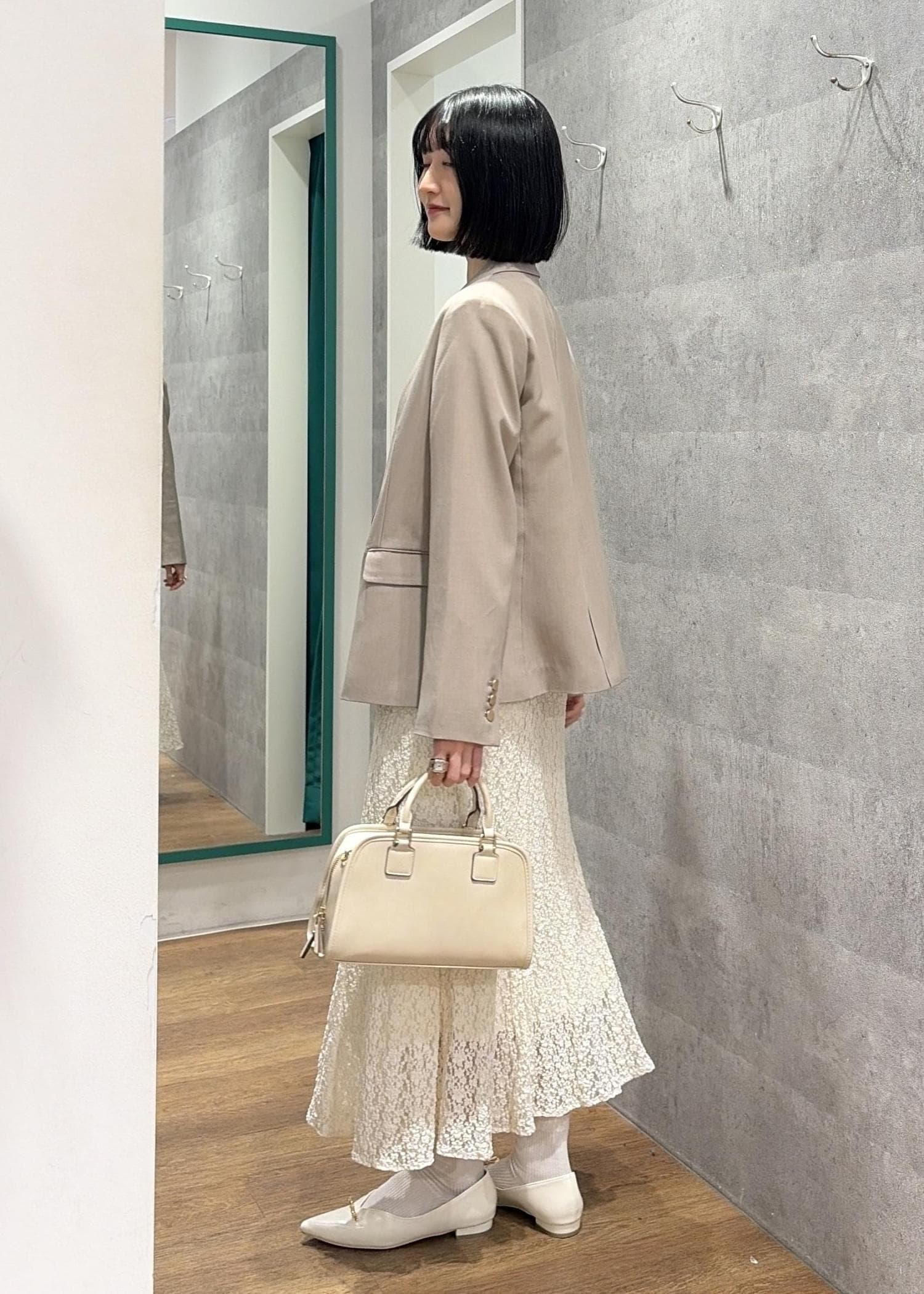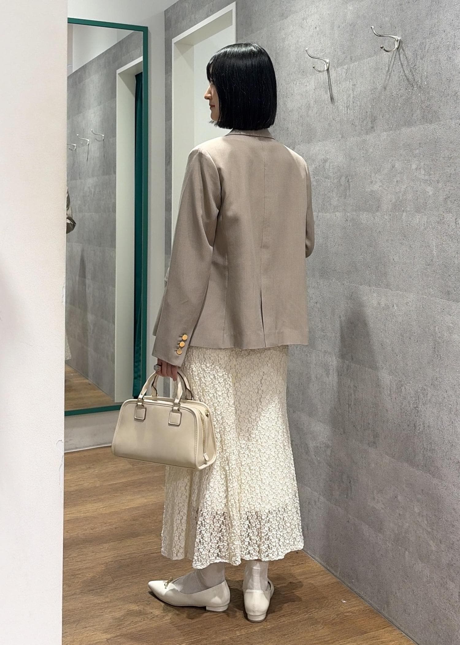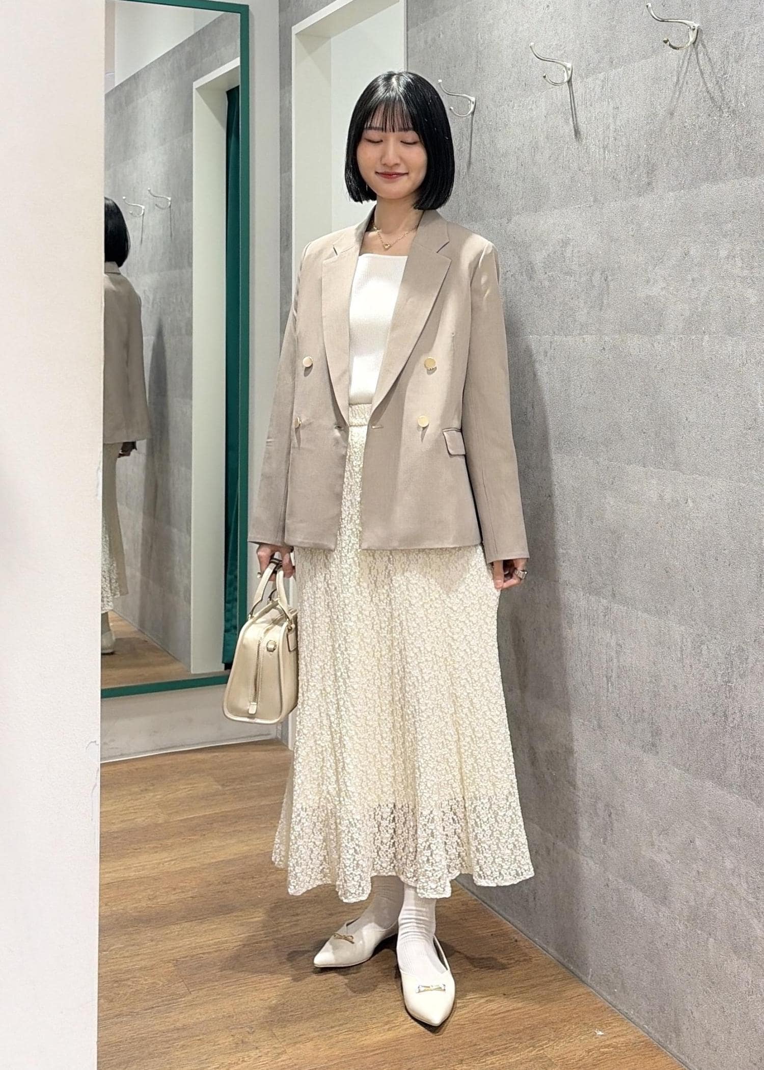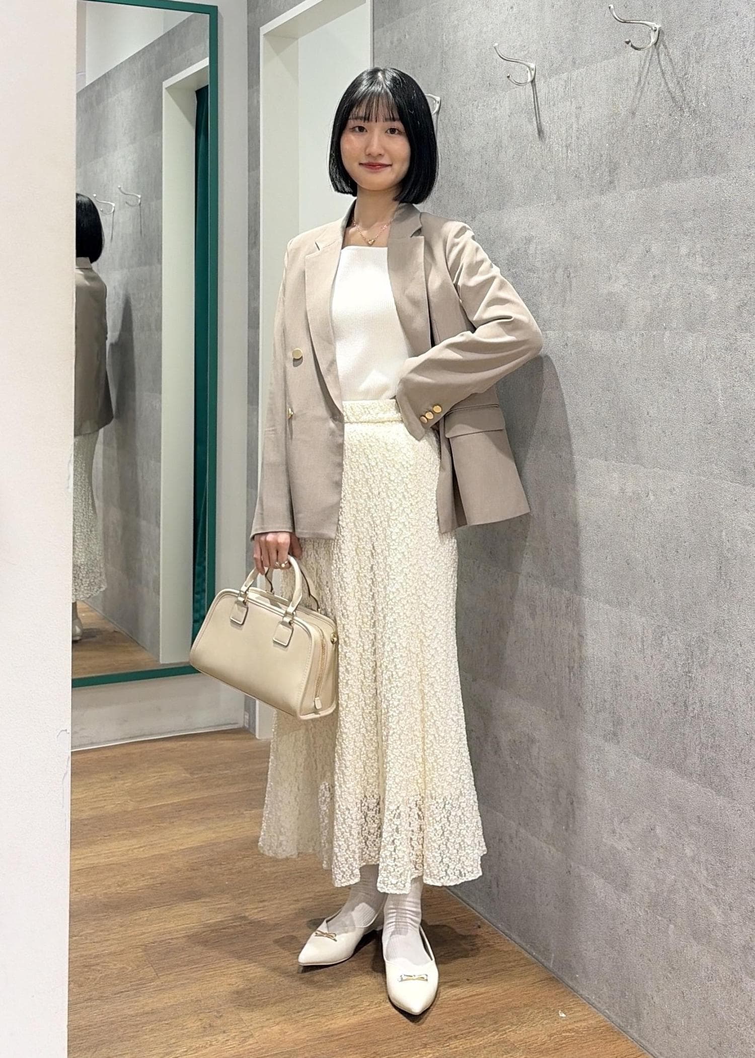 ベージュのジャケットをフェミニンに着たかったので、他を白系でまとめて上品なコーデにしました