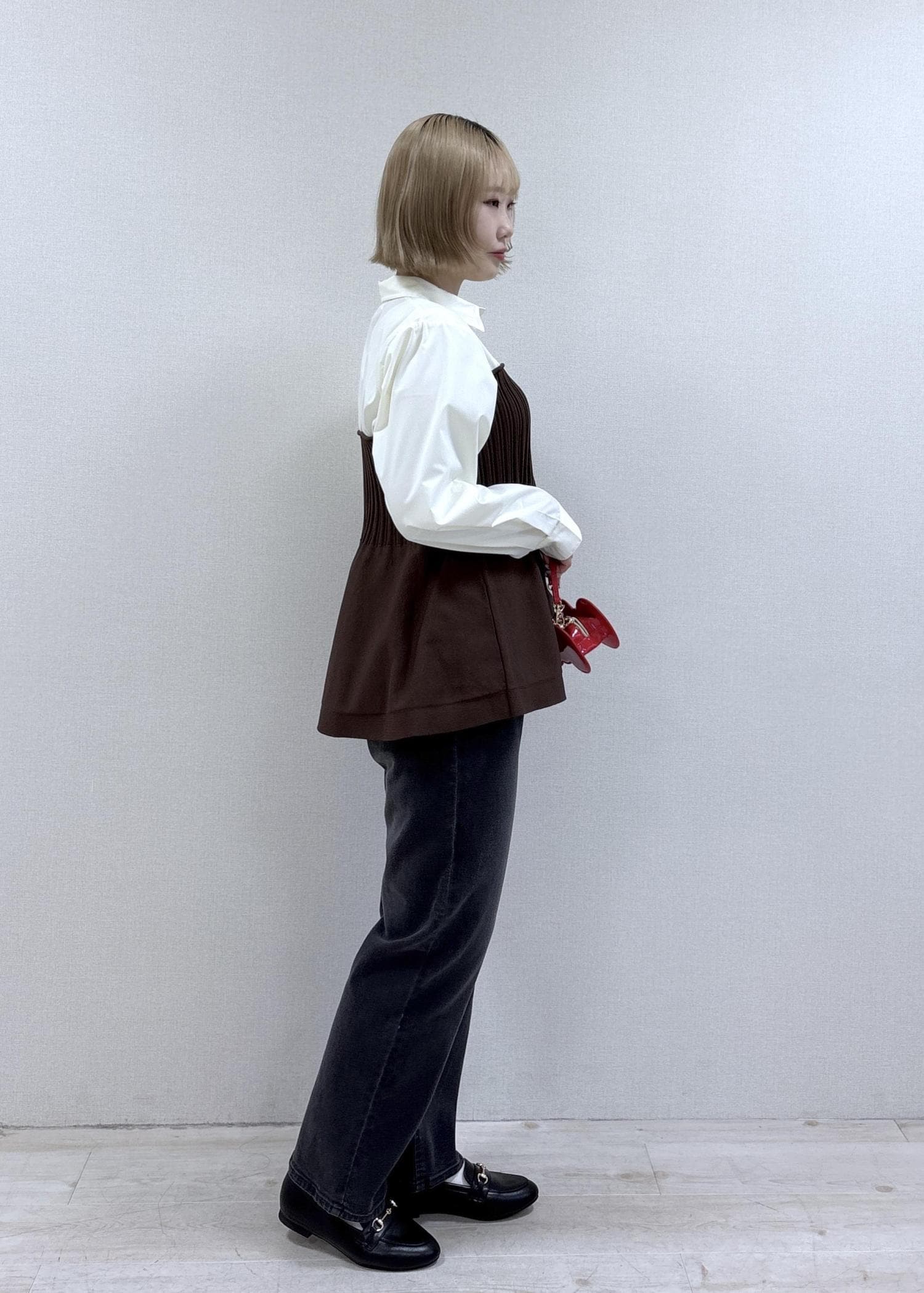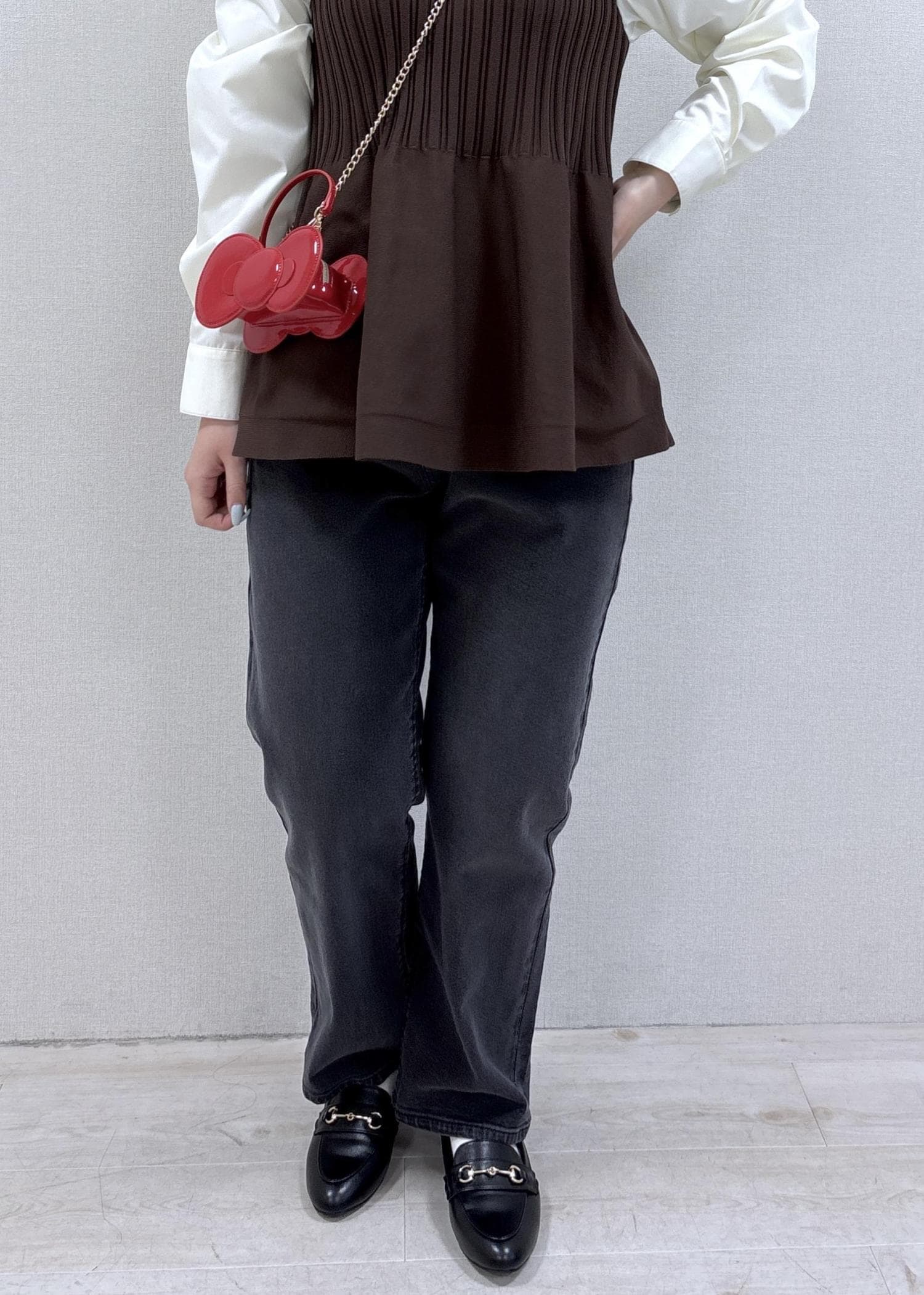 ペプラムのトップスと合わせることで、カジュアルすぎない印象にしました。
