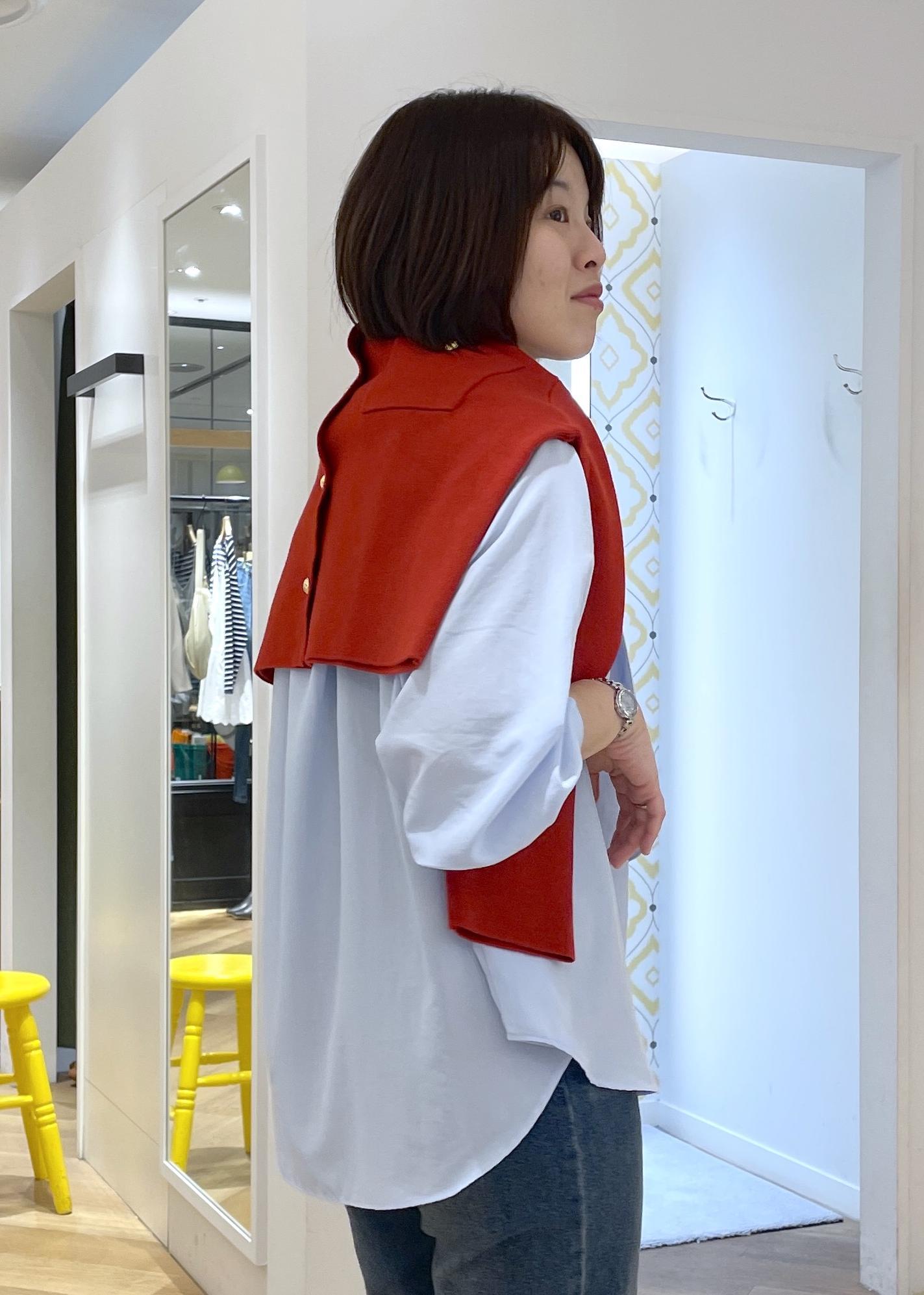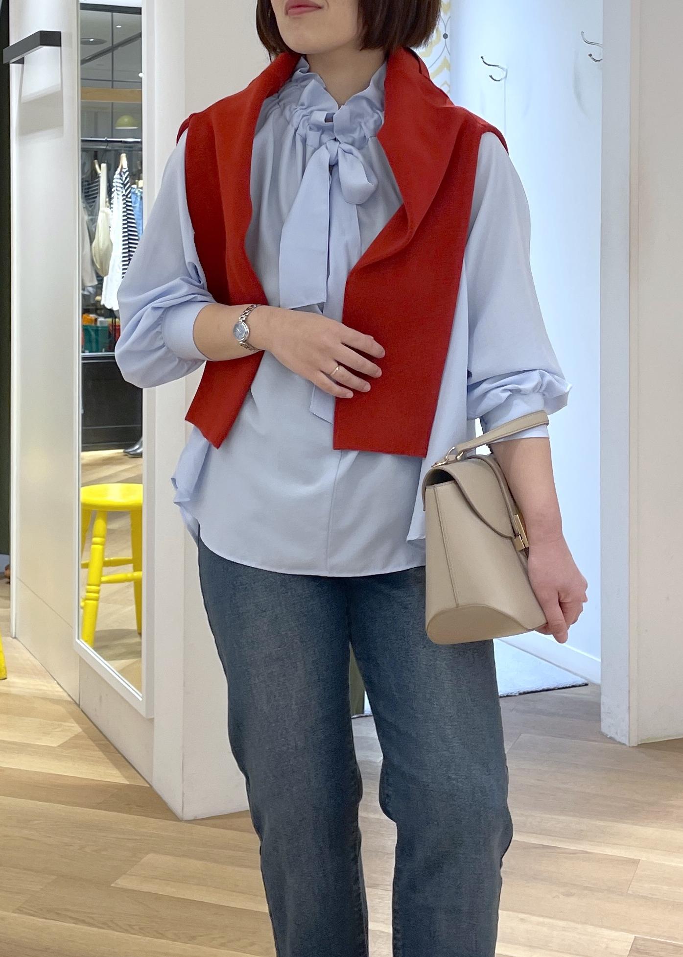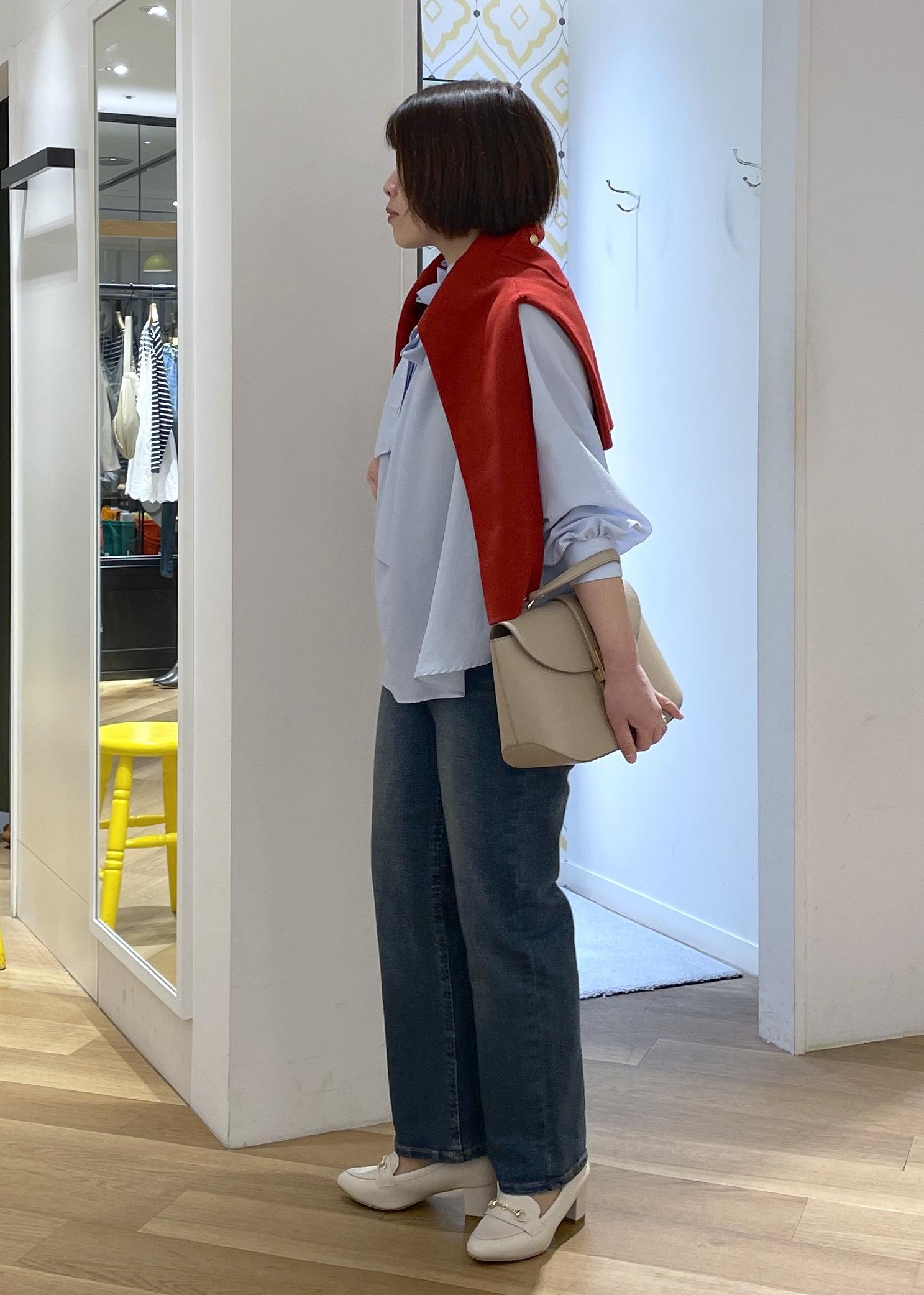 全体がブルーのトーンだったので、赤のカーディガンを肩に巻いてコーデのアクセントに◎