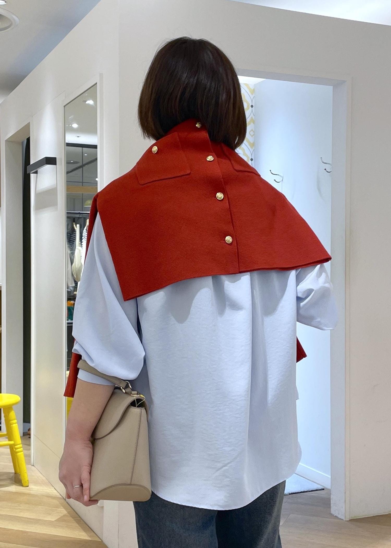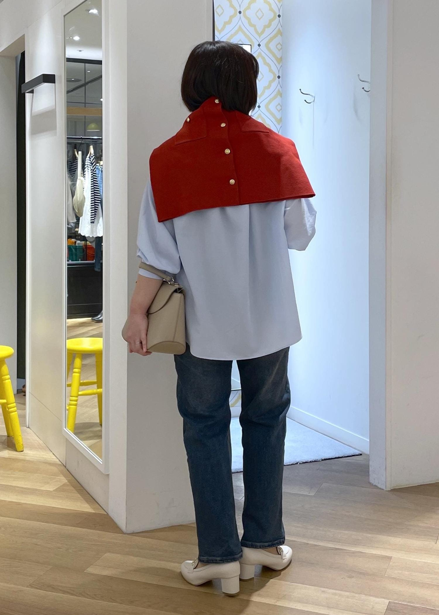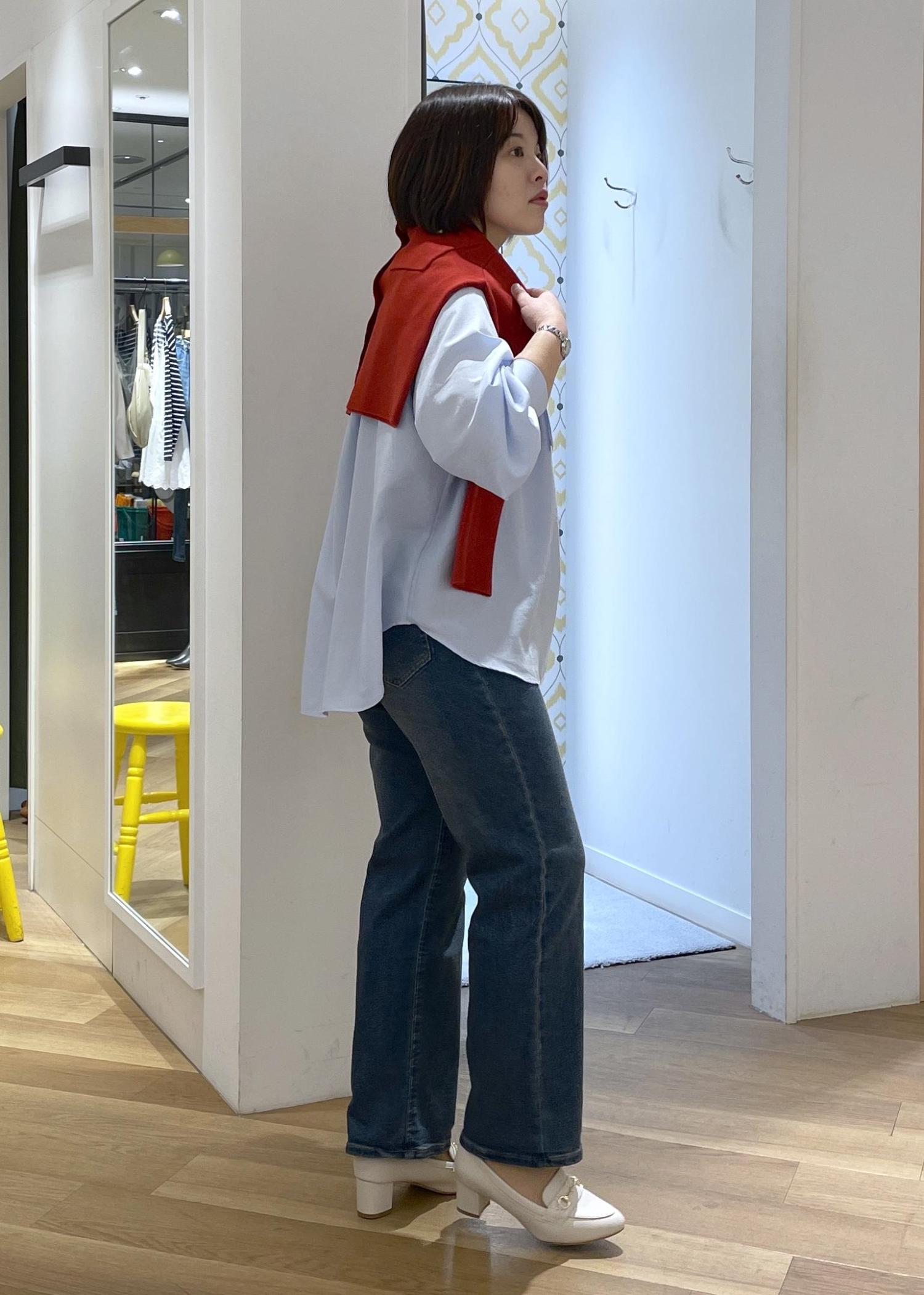 全体がブルーのトーンだったので、赤のカーディガンを肩に巻いてコーデのアクセントに◎