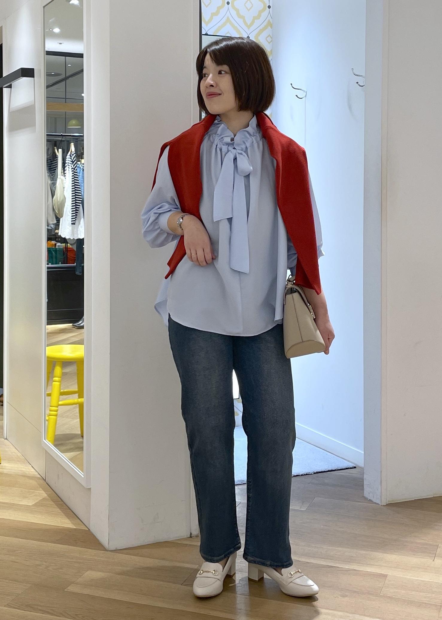 襟元のフリルとリボンが華やかさのあるブルーシャツにデニムを合わせた、可愛さと爽やかさのある大人カジュアルコーデです!