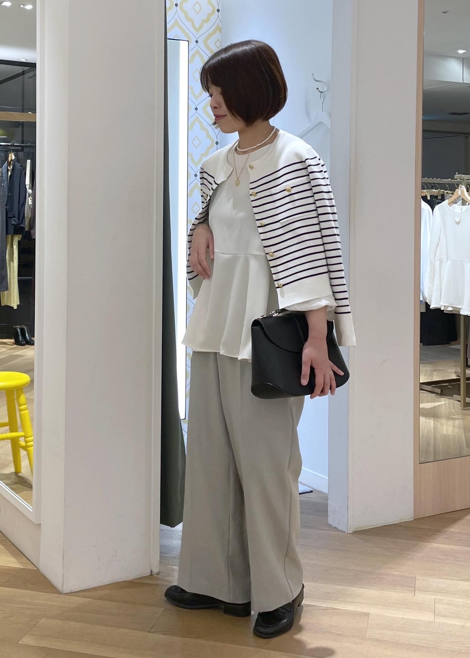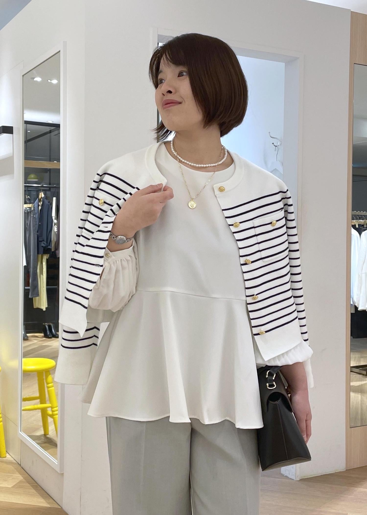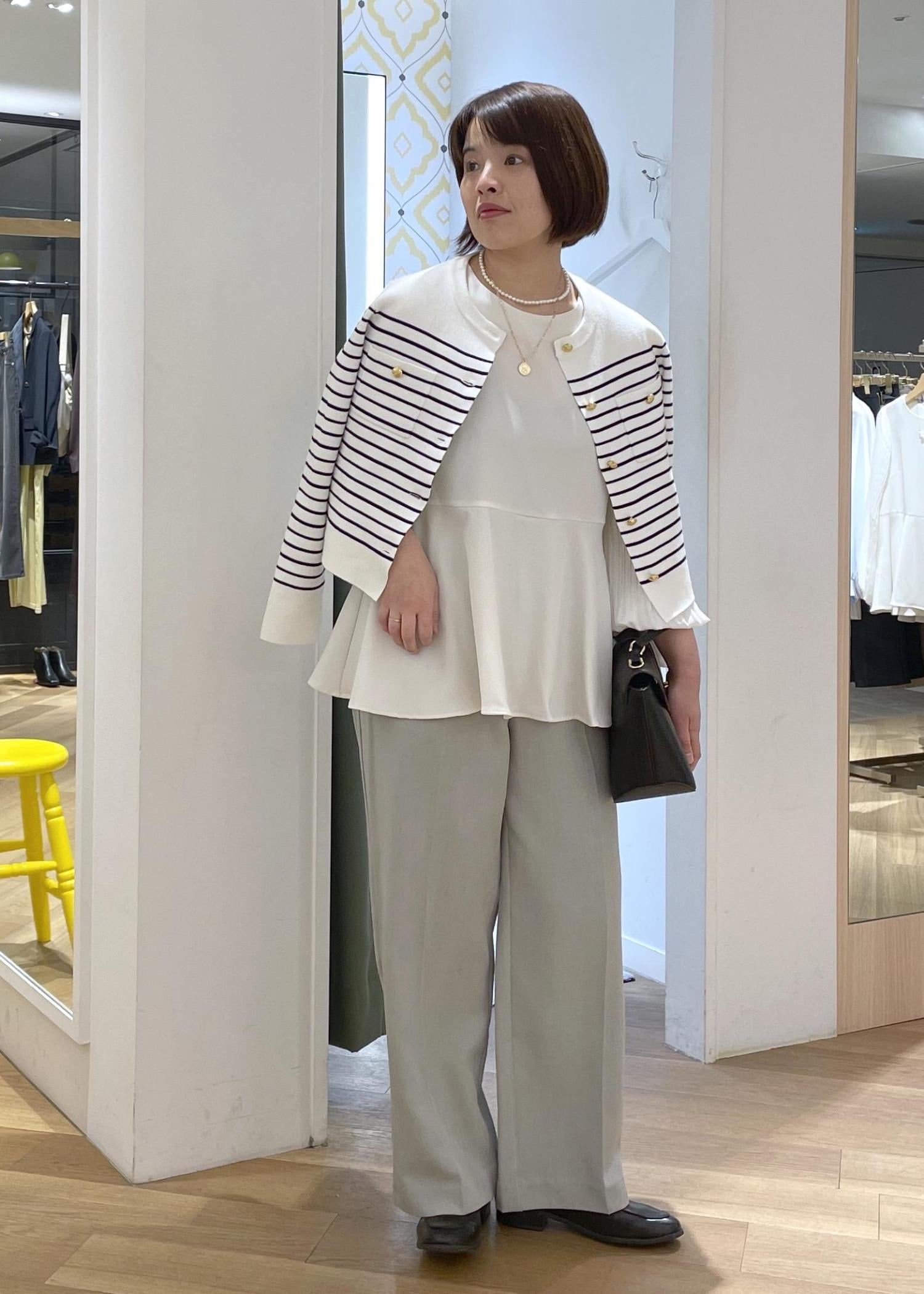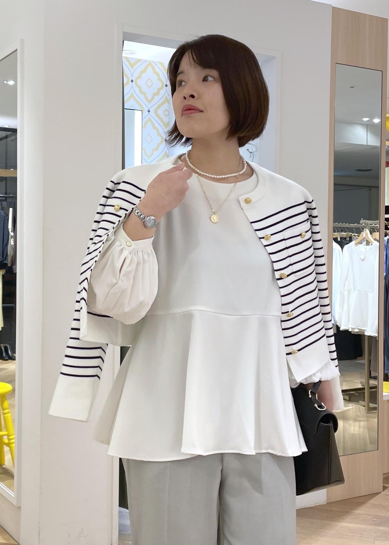 カーディガンのインナーにはフレアラインがきれいなブラウスお合わせて上品な印象のスタイルに◎