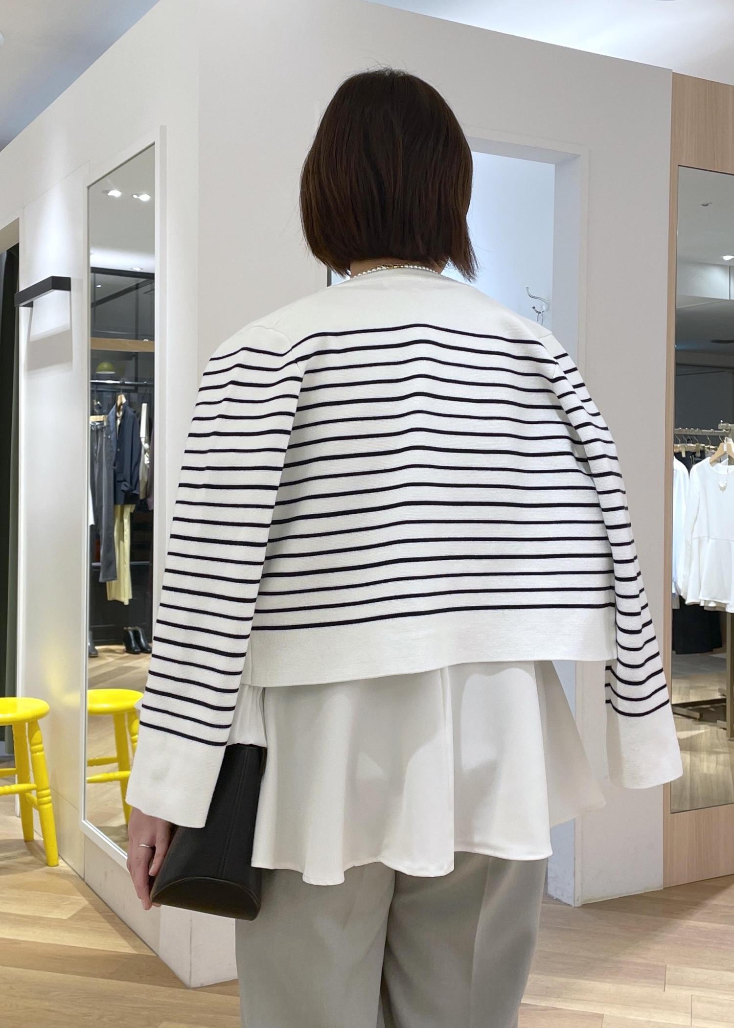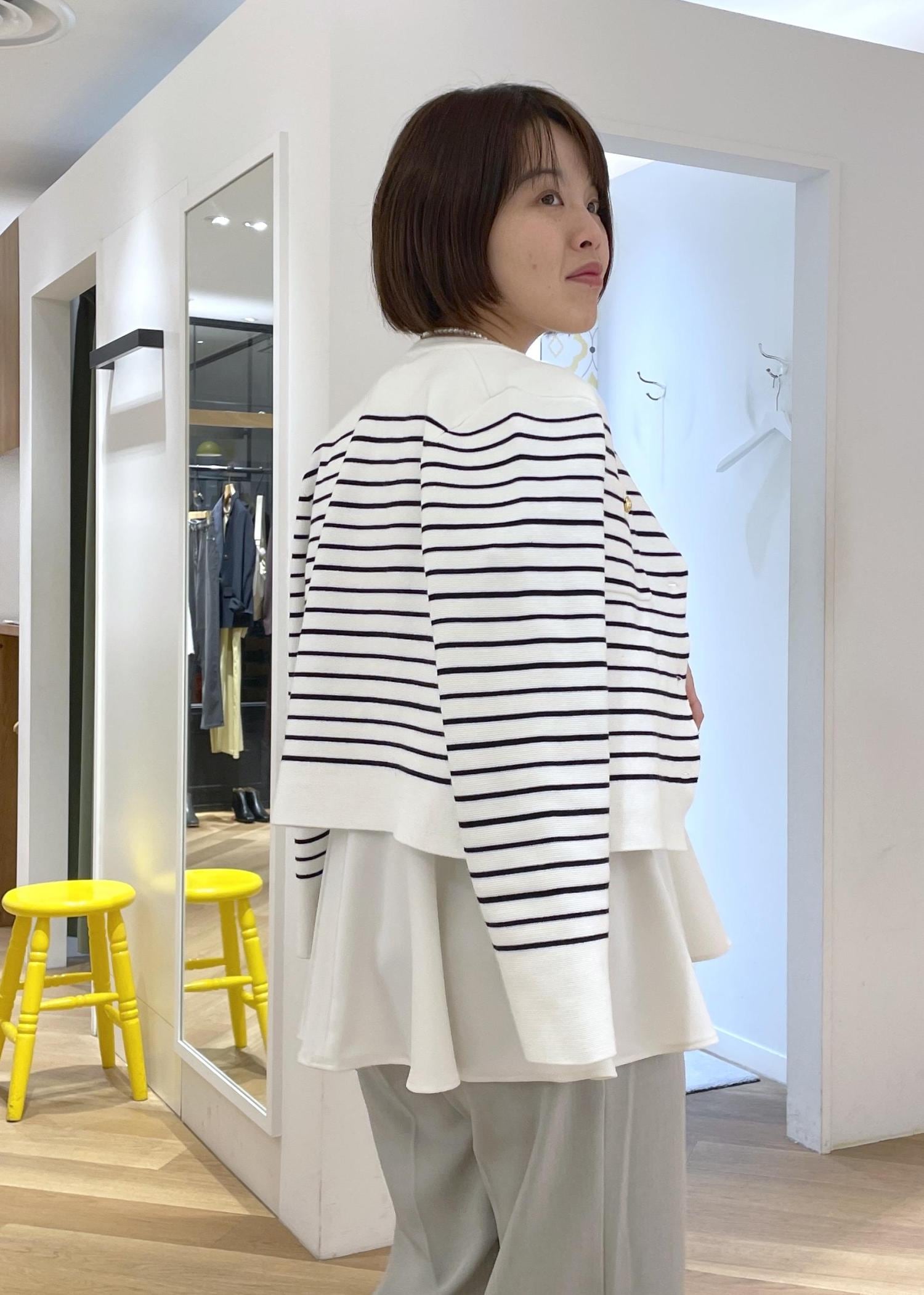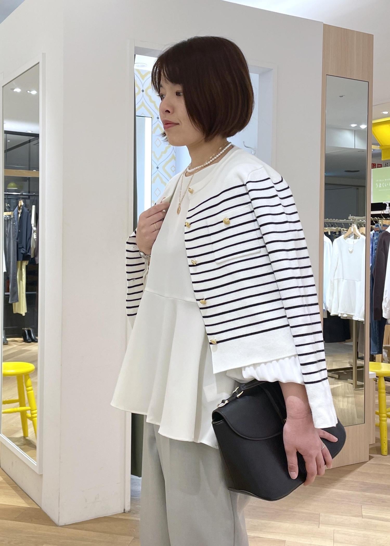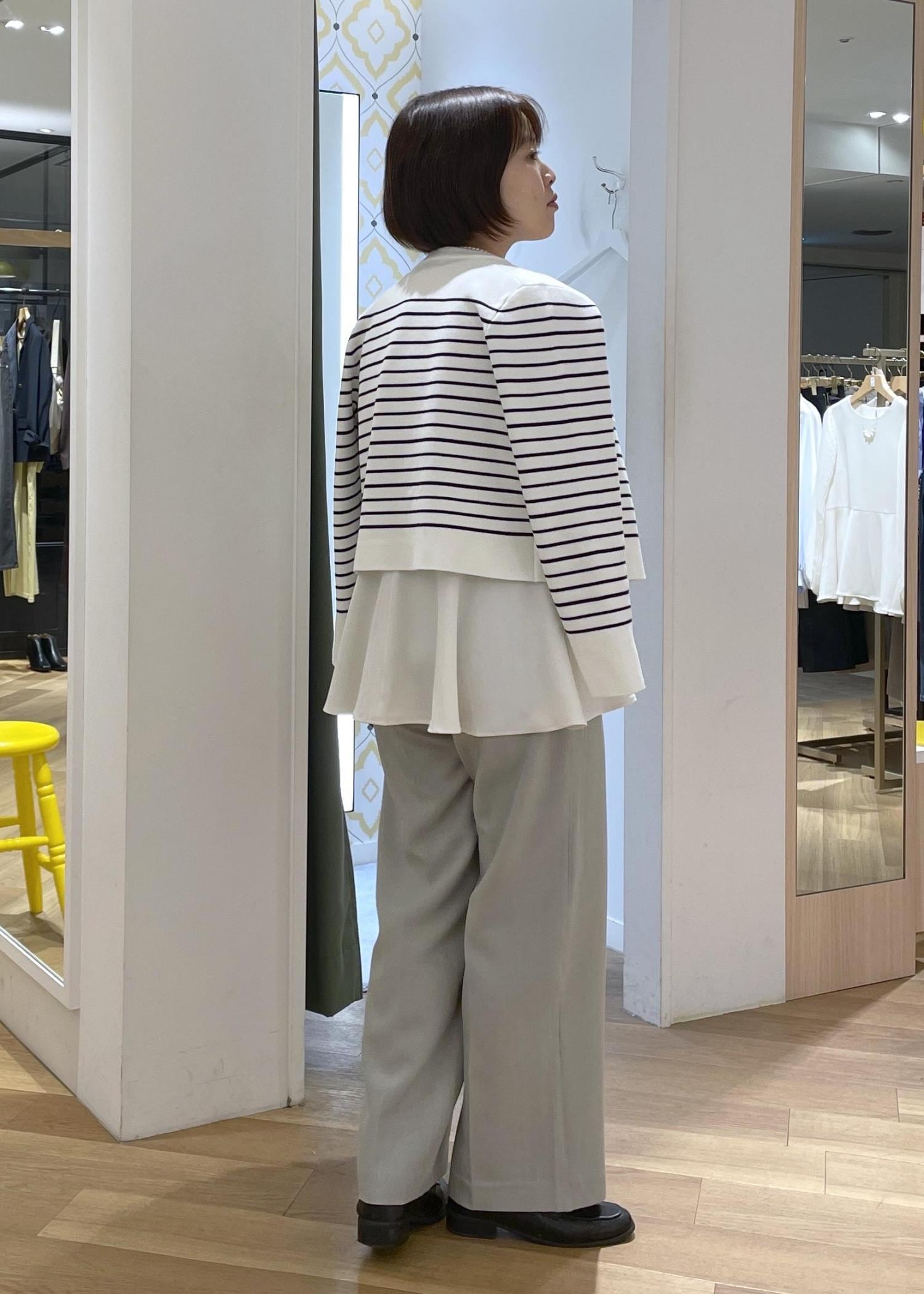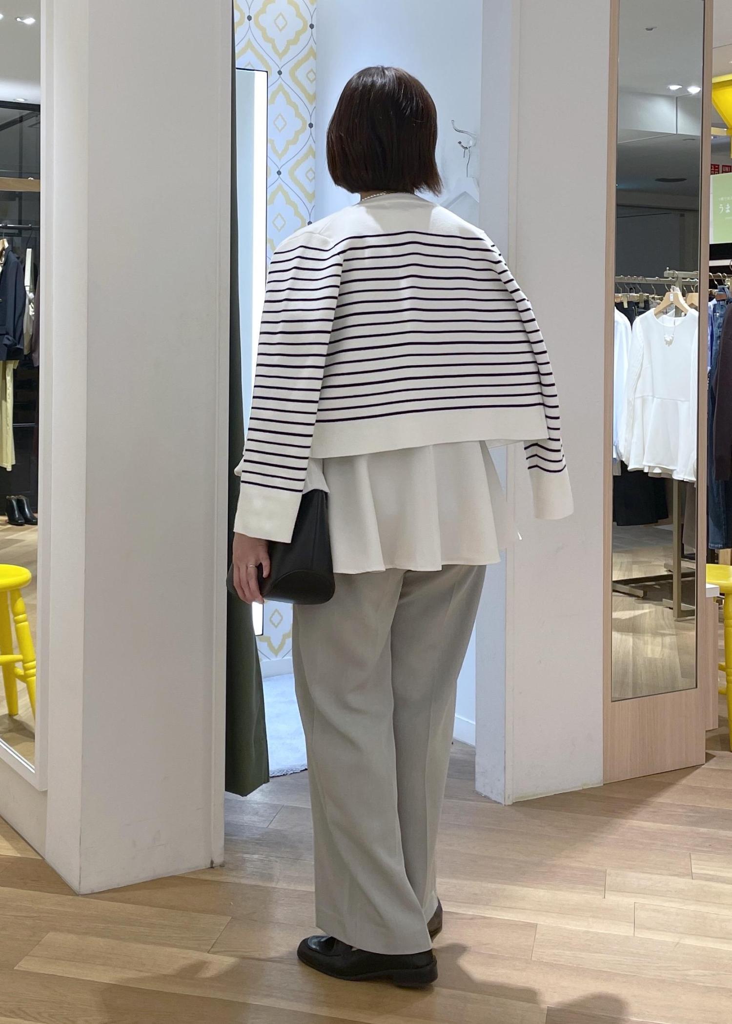 カーディガンのインナーにはフレアラインがきれいなブラウスお合わせて上品な印象のスタイルに◎
